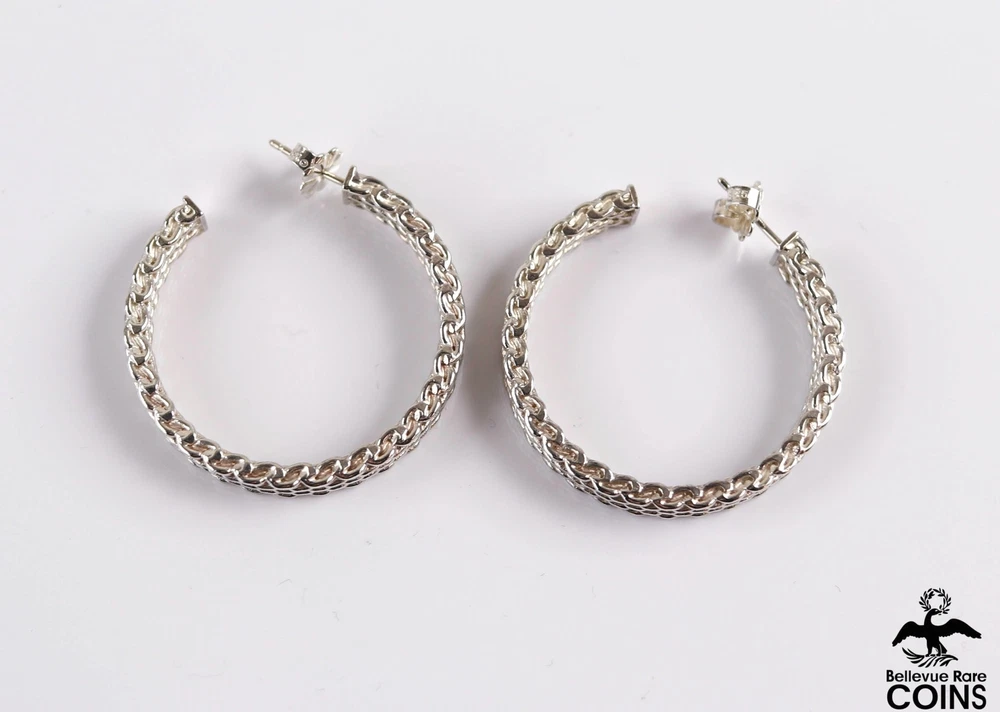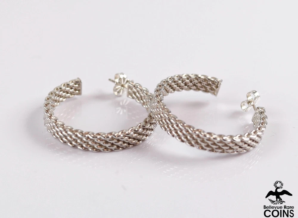 Tiffany & Co. Sterling Silver Mesh Weave Large Hoop Earrings w/Pouch Tiffany & Co. Sterling Silver Mesh Weave Large Hoop Earrings w/Pouch *Tiffany & Company is a worldwide name and elite jewelry company that spans almost 200 years old, with many artist and designer pieces that are sure to stun and captivate. Luxury and style are captured in every piece! *Specifications: Metal: Sterling .925 Silver Total Weight: 11.7 grams Length x Width: 32mm x 5mm (each earring) *Please SEE PHOTOS for condition. If you should have any questions or concerns, please feel free to message us Monday - Friday 9:00am - 5:00pm via ebay’s “Ask question” button below. We add hundreds of new coin and bullion listings weekly. We encourage you to check out our other listings and our eBay auctions! Click Here To See All Bellevue Rare Coins Gold Bullion L istings Shipping & Returns: $4.00 USPS Ground Advantage shipping within the United States, unless otherwise noted in listing. Shipping and Handling: Domestic Shipments - Bellevue Rare Coins provides $4.00 United States Postal Service (USPS) Ground Advantage shipping with tracking for all shipments within the United States, unless otherwise specified. International Shipments - All International orders are shipped via eBay's International shipping program. International Shipping and handling fees will be determined at check out. Please contact us for shipment fee estimates. Combined Shipping - Bellevue Rare Coins offers combined shipping for domestic buyers who have won multiple auctions. We will send out updated invoices with discounted shipping costs on Monday mornings. Please wait until you receive the updated invoice from us to make your payment. We do not offer combined shipping for International Buyers. Return Policy - Bellevue Rare Coins has a 30-calendar day return policy. All returns must be shipped within 30 calendar days of receiving the product. All returned items must be in their original packaging. All return requests must be made within 30 calendar days of customer receiving the merchandise. When returning merchandise, please include the item number, as this will expedite the refund process. Bullion Returns - Customer may (at Bellevue Rare Coins' discretion) be required to pay for any market loss on their returns. Any market gain on refunds shall remain the property of Bellevue Rare Coins. Listing Information: Product Photography - Bellevue Rare Coins does not use stock photos. Items in our listings have been photographed by our team in-house, so you can trust that you're making an informed purchase, ensuring transparency and authenticity. Messages - We greatly value your messages and are committed to responding to your questions and inquiries as promptly as we can. Nevertheless, please understand that immediate responses may not always be possible. Kindly note that we are unable to respond to messages on weekends, but we assure you that your inquiries are important to us, and we will get back to you during our working hours as soon as possible. About Bellevue Rare Coins Bellevue Rare Coins is a family-owned and operated business who have been proudly offering their services since 1979. We are the leading rare coin and currency dealer in the Greater Seattle Area who also specialize in jewelry and estate items. We are focused on delivering a simpler experience to our customers. Providing a reputation that dramatically affects our consumers in a positive way. We ensure that our clients always feel welcome and valued.