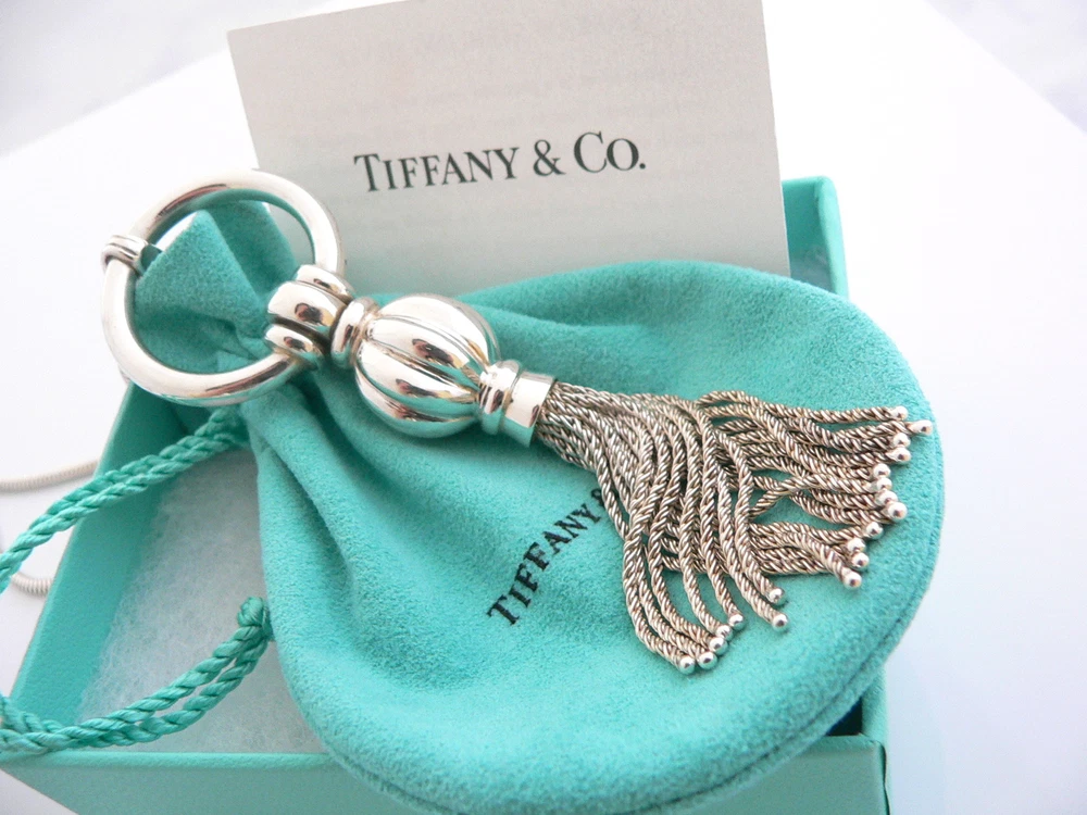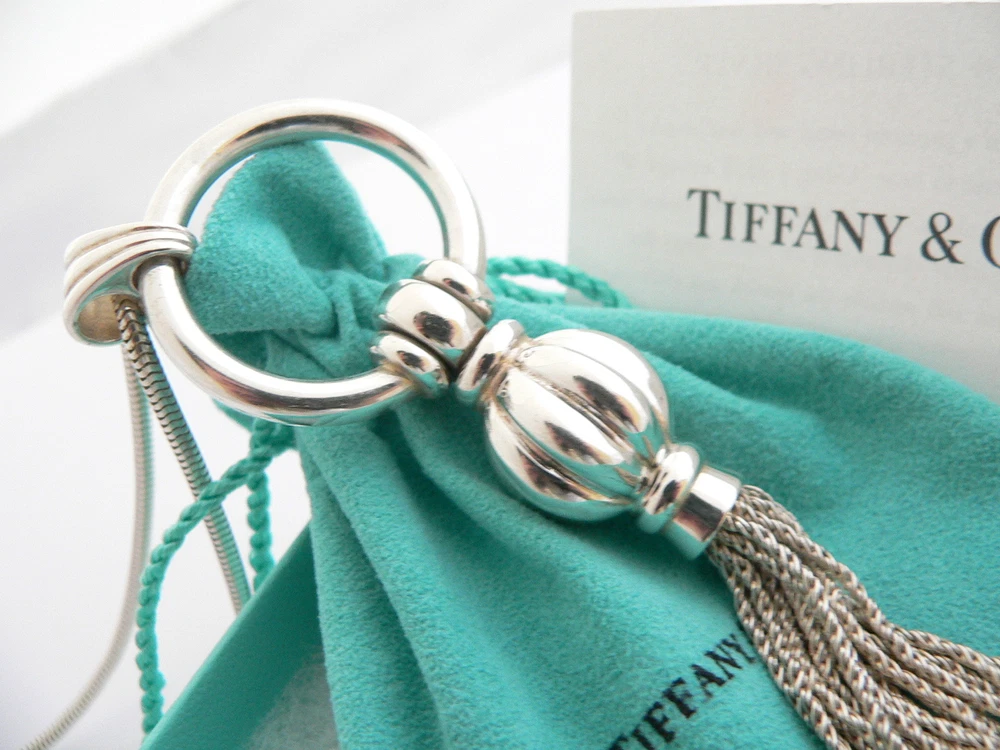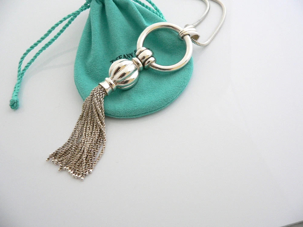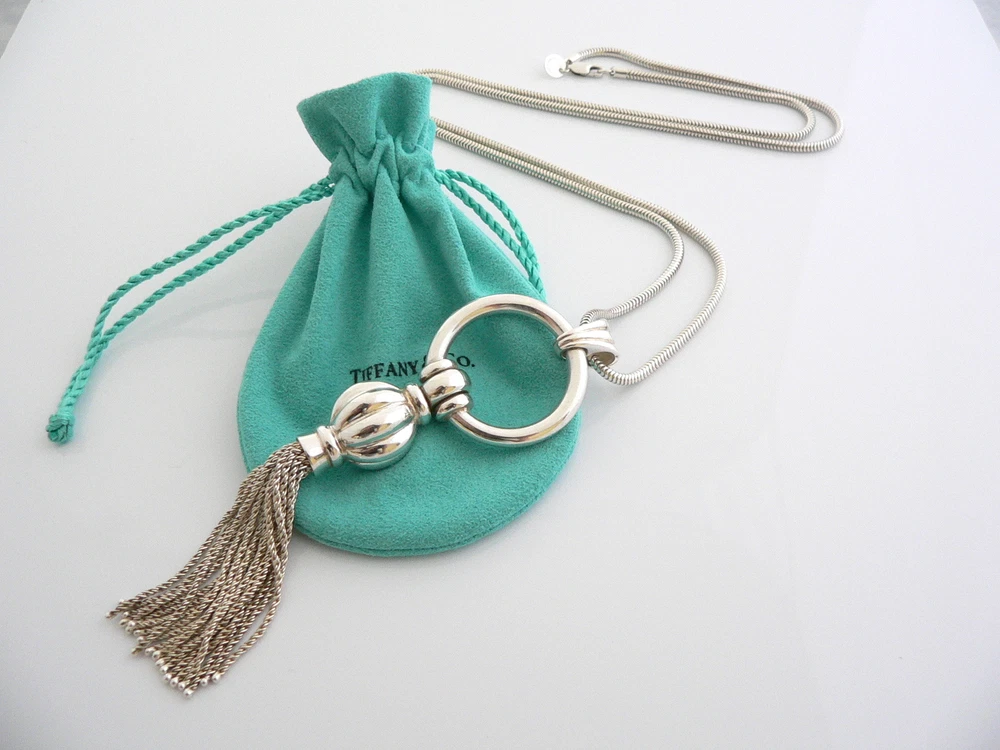 Overview: Everyone needs a signature Tiffany piece! Whether you are just starting your Tiffany collection or are thinking of adding another piece, this one is a perfect for you. Tiffany & Co.'s Silver 32 Inch Long Tassel Dangling necklace is a Tiffany classic that will never go out of style. The piece makes a statement in its own subtle/simple way. It will most certainly be a piece that you will turn to over and over again, making it great value for your money. It is a wonderful piece that fits a lifestyle on the go -- can be worn to almost any occasion! It is gorgeous, elegant, and classic all rolled into one ... adding just the right amount of "Tiffany touch" to any outfit. Imagine the piece with your professional office attire ... Now imagine it with jeans or weekend wear ... Very cool in every way! The item is very comfortable to wear, and is in excellent condition. As always, the necklace is fully hallmarked guaranteed to be 100% authentic. It will come with its Tiffany pouch, box, and sterling care card as shown! Perfect and ready for gifting! Wonderful present for yourself or anyone you love! Will surely delight! Particulars: Size & Measurements: The Snake chain is 32 inches from end to end. The Tassel pendant is approx. 4.5 inches long. Metal & Hallmarks: T & Co / 925 / Italy (on the gorgeous Tassel pendant) Tiffany & Co. / 925 (on circular tag of chain) Solid 925 Sterling Silver Please check out my other unique and interesting Tiffany items on sale.