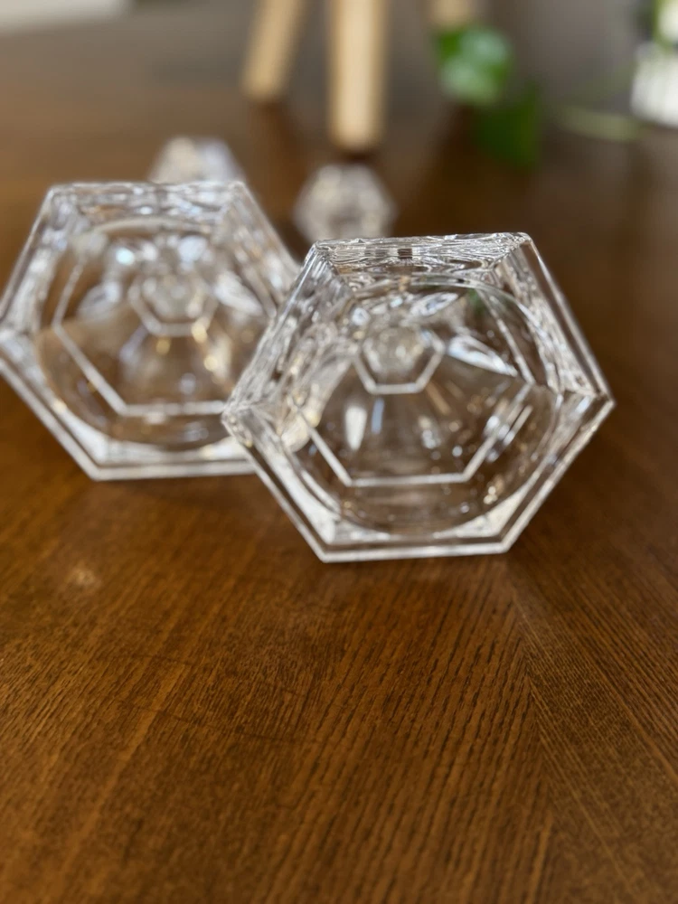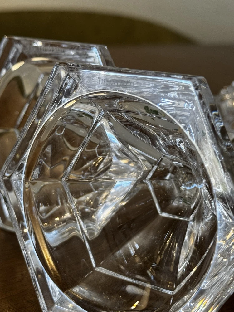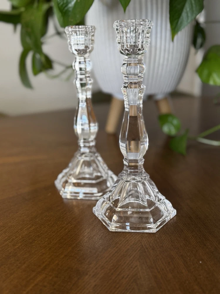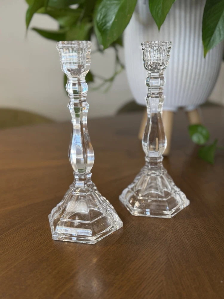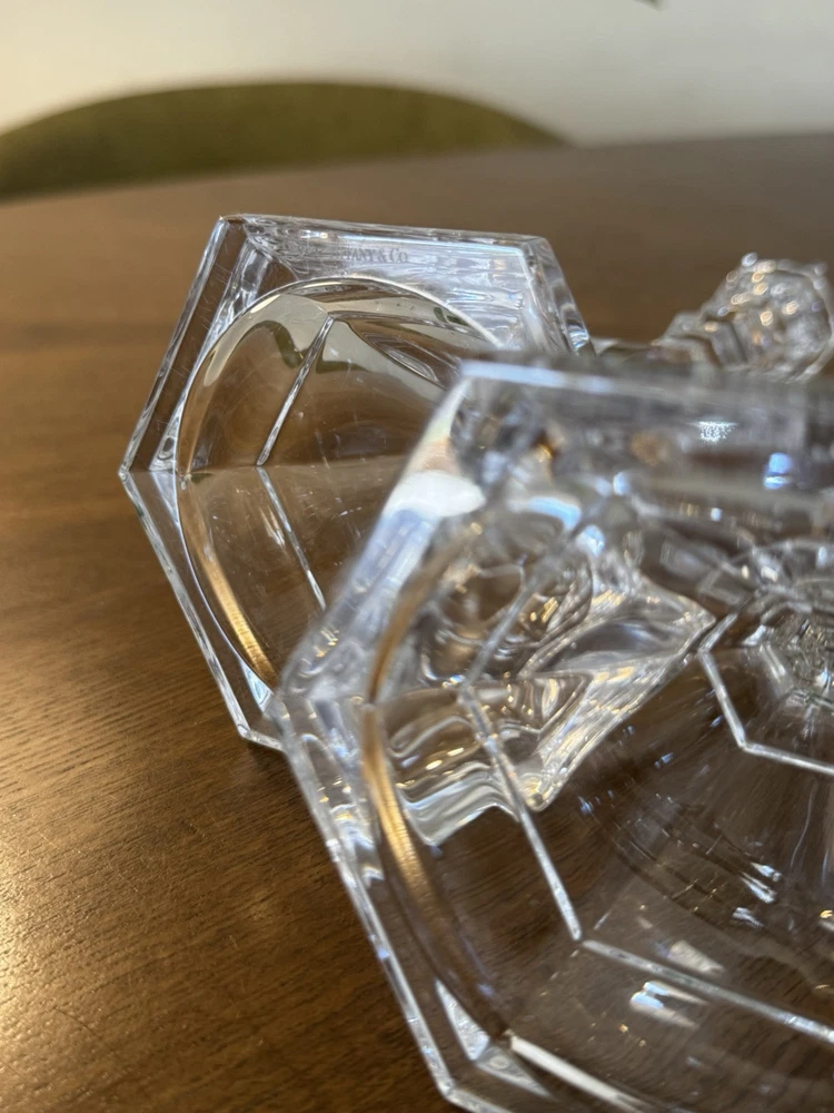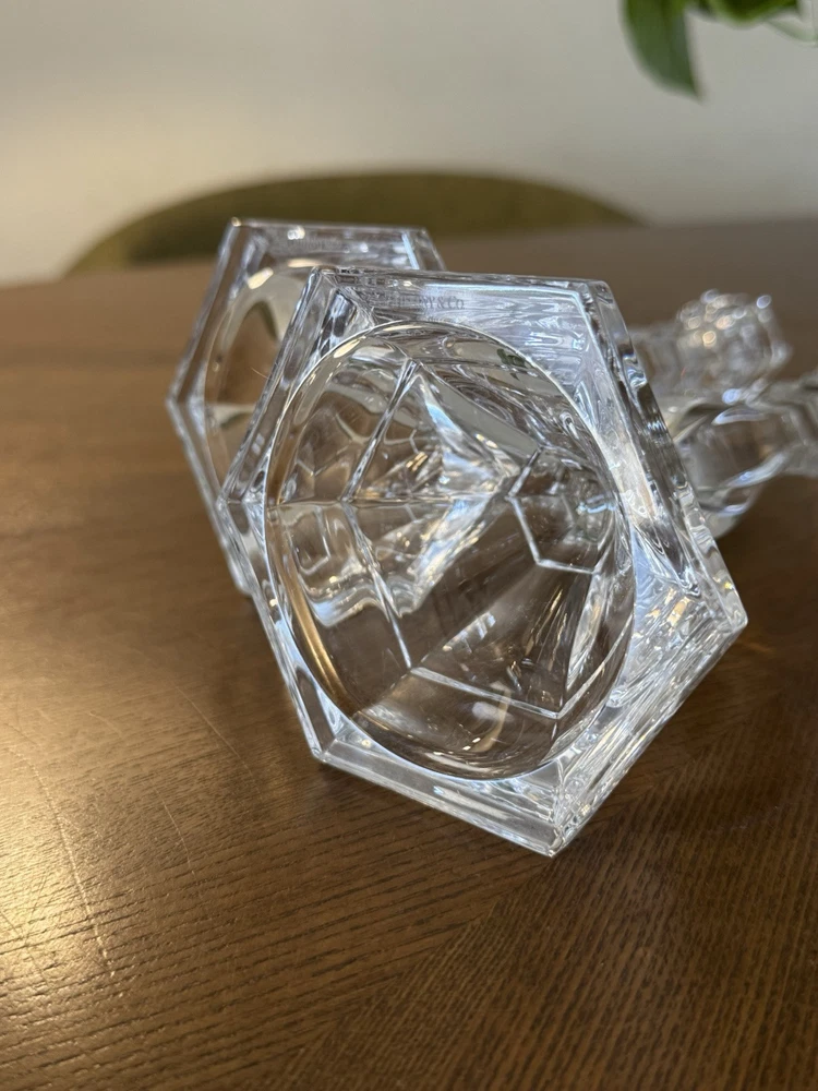Exquisite pair of Tiffany & Co. vintage crystal candlestick holders. They are approximately 9 inches tall and have a stunning clear crystal finish. The candle holders are from the late 20th century and are retired and signed by the brand. Each holder has an approximate 4-inch base and is perfect for any room or occasion.