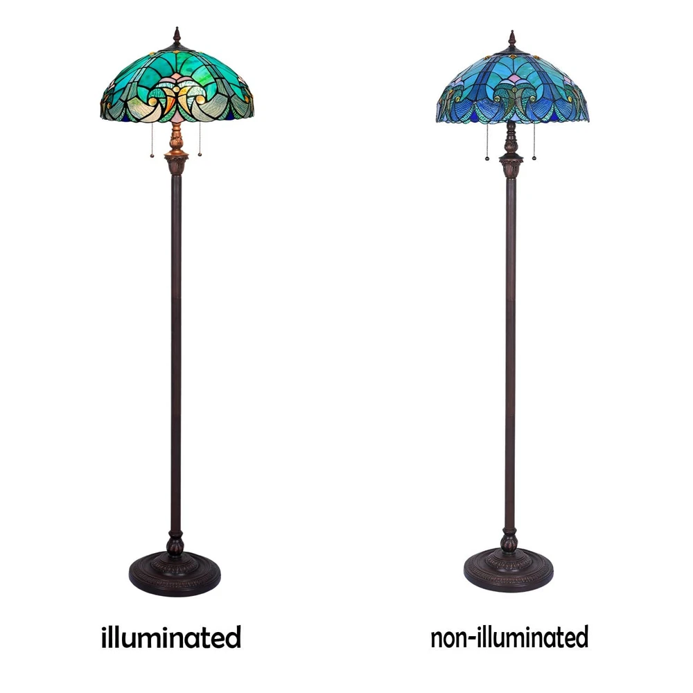 Victorian Handcrafted tiffany style floor light lampshade is slight heavy than you expected, as it is made of real stained glass. But when you knock it, it sounds like plastic. That's why? Because of its special manufacturing process. Each glass piece is cut by hand, then polish the edge before wrapping the copper foil. The edges of the glass pieces are wrapped with adhesive copper tape (copper foil). Then putted together in a mould according to the pattern. At last, using soldering material to weld each glass at a very high temperature. The Stained glass is Much Heavy than Plastic, and couldn't been burned, normal knife couldn't cut them. Easy to Check it. 【Perfect Size for Home】 Tiffany Floor Lamps in 16 inches Wide by 63 inches Tall, it comes with 70” long chain, ON/OFF pull chain switch. A stained glass floor lamp consists of a tiffany glass lamp shade and a resin construction base in blackish bronze finishing. Victorian style sea green tiffany lamp gives off a muted and relax light when lit on. It will look absolutely stunning in your room and always be a talking point for anyone visiting. 【Tiffany Floor Light Bulb Specifications】 2 Lights Large Stained glass floor lamp is featured standard E26 base bulb sockets, you can use LED, CFL or Max. 60 Watts normal Incandescent bulbs (bulbs are NOT included), different bulbs will get different looking, we recommend to use WARM LIGHT bulbs. When the lamp is switched on, the light from bulb will shine through the shade, its spectacular coloring and artistry will delight and attract the curiosity of people of all ages. 【Premium Materials】 Antique style floor lamp shade is sturdily made of 100% real stained glass. Each shade is formed from hundreds of pieces of stained glass and welded together by soldering tin at a very high temperature. Every process is totally handmade and the color is never fade. Tiffany lamps are one of the best examples of arts and crafts decor ever produced, these ornate accessories add a sense of character and history to an otherwise modern setting. 【Beautiful and Functional Piece of Decor】 The lamp shade shines the light through the glass and creates beautiful patterns. All of the colors are Vibrant and evenly toned when light on. Definitely will be the focal point of adding a touch of elegance for sitting room, bedroom and home office. A perfect fit for reading and study. 【Professional After-sale Services】 Tiffany lighting lamp is easy to install. We provide 7 x 24 hours on-line services, if you have any inquiries about lamp or installation, please feel free to contact us via Amazon. We will help you to settle all the issues.