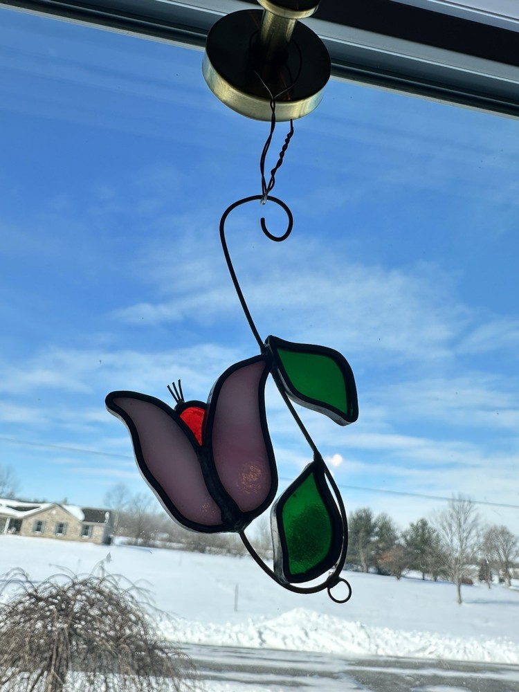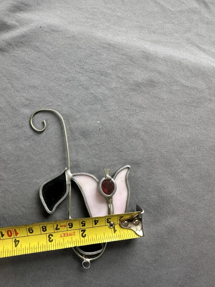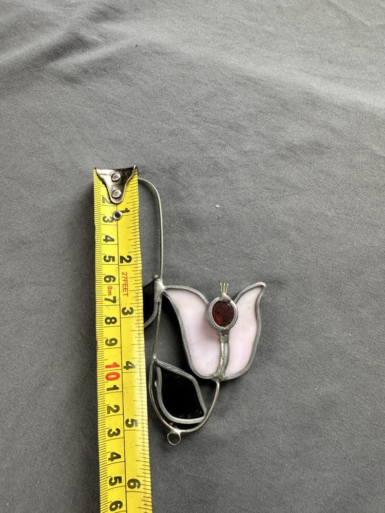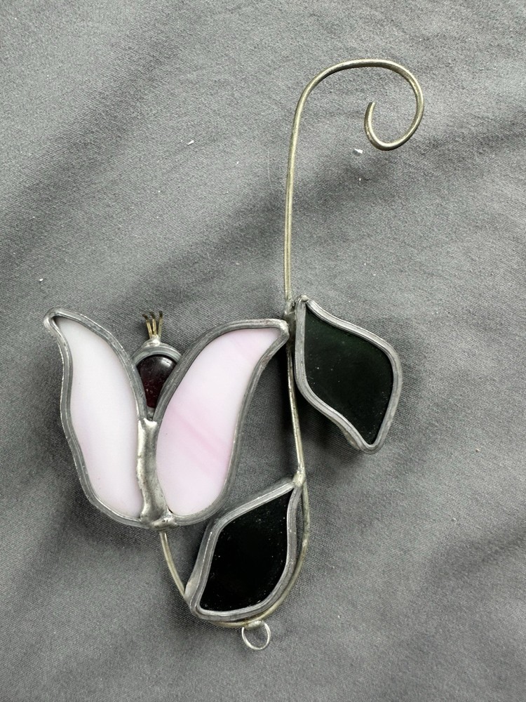 The Tiffany Stained Glass Pink Tulip Sun Catcher is a handmade decorative accessory that adds a vintage touch to any room. Made with hand-blown glass in a pink color, this suncatcher features a beautiful tulip design that captures the light and creates a warm ambiance. With dimensions of 5 inches in width, this unique piece from Tiffany & Co. is a perfect addition for adult collectors or those looking to enhance their home décor with a touch of retro style. Easy to clean with a damp cloth, this sun catcher is a beautiful and unique accent piece for any space.