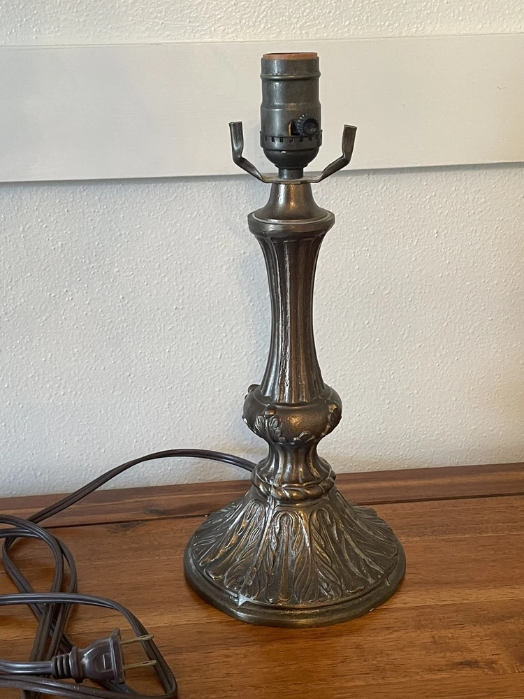Add a touch of vintage elegance to your home with this beautiful Tiffany style table lamp. The stained glass shade features a stunning bouquet of purple and pink flowers, while the metal base and corded electric power source ensure lasting use. This lamp is the perfect addition to any Victorian style decor, with a round shade shape and multicolor design that will brighten up any room. Measuring 17 1/2-18 inches in height, this Leviton brand lamp is a must-have for any collector or lighting enthusiast. 2 small cracks shown in photos. Preowned works great. Original packaging not included.