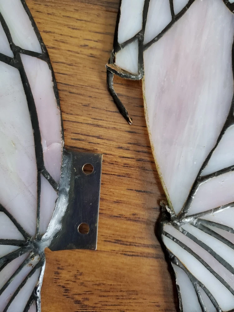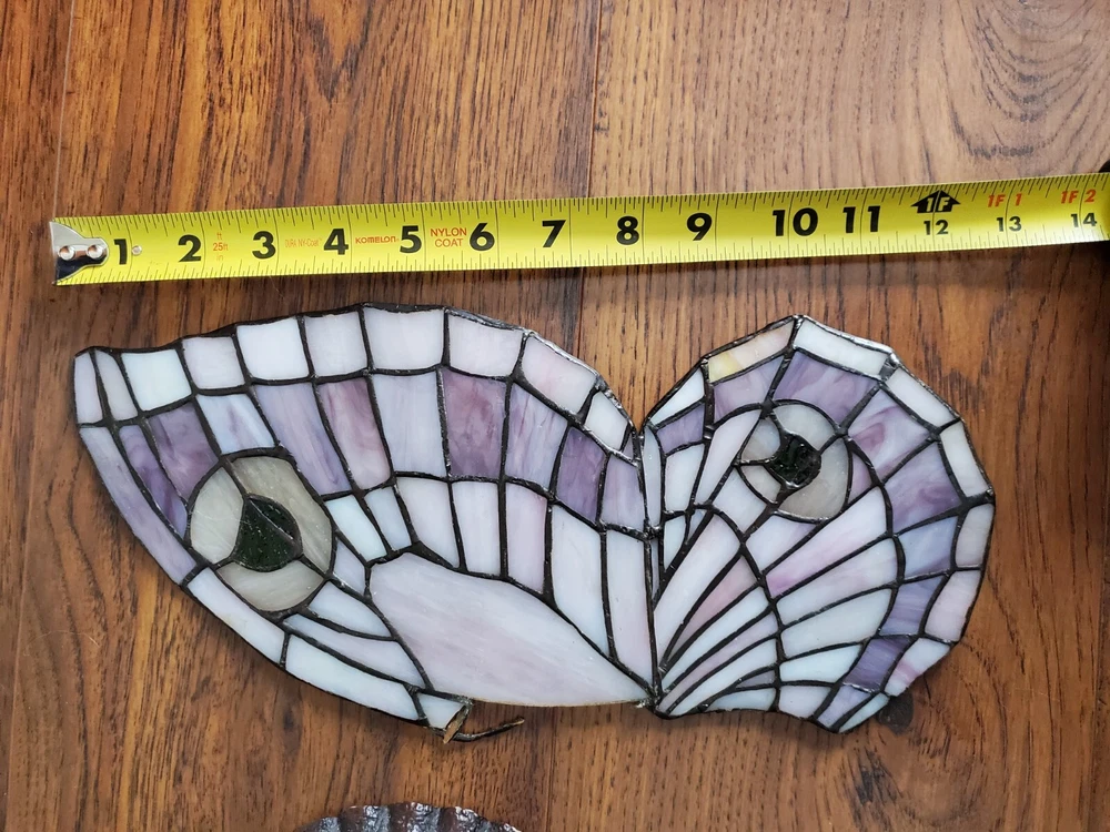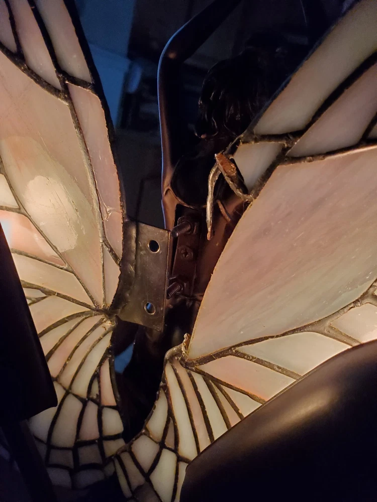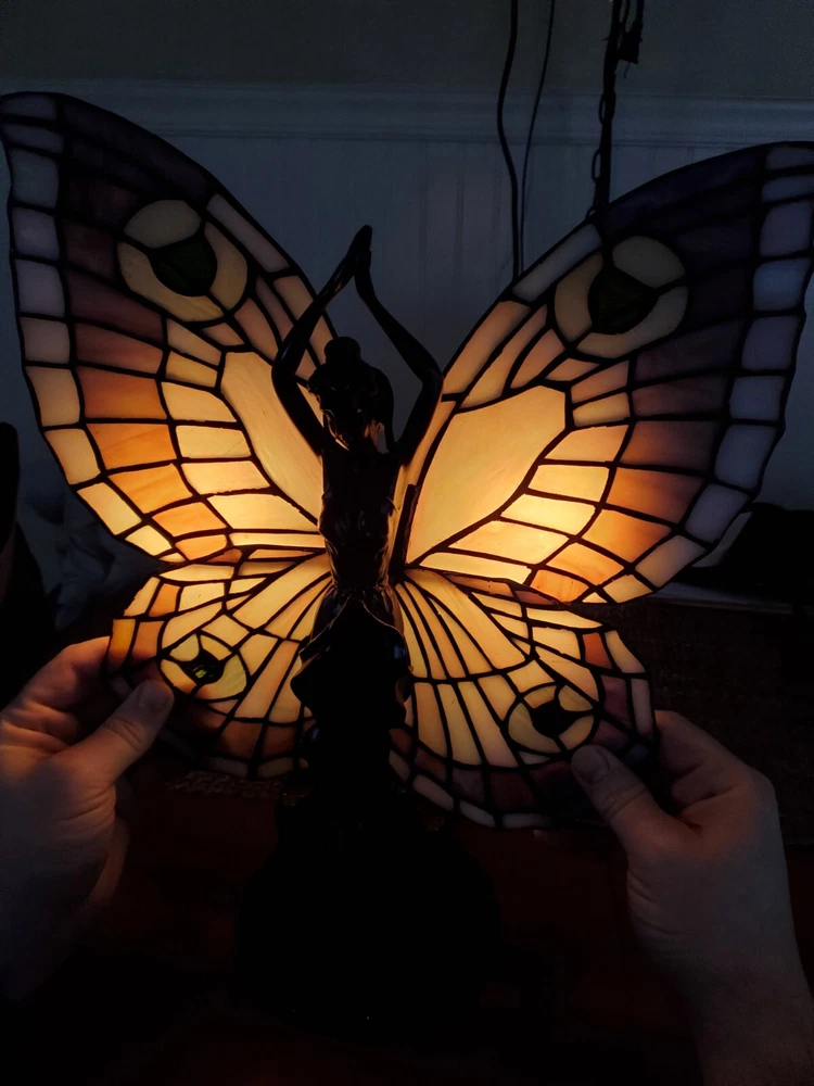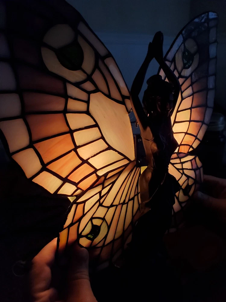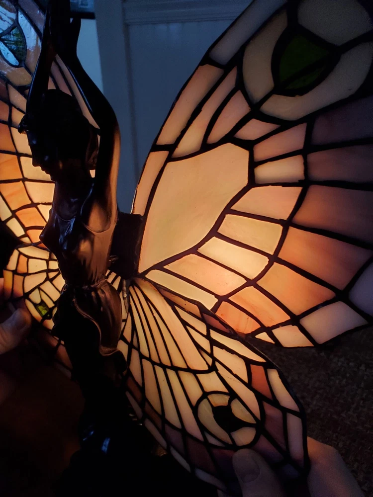 Tiffany Style Table Lamp Fairy Angel Stain Glass Wings, snapped at waist appears to be a clean cut/break & glue able, minor chipping throughout (nothing major), wings are missing 1 bracket to mount to the fairy & a couple inches of glass that goes around bracket. Great project for someone that knows how to fix it, otherwise she is a beautiful piece! Bulbs are included, she is approximately 15" tall & 8" width, selling as is, as pictured, no returns. Shipped USPS will purchase extra insurance for shipping