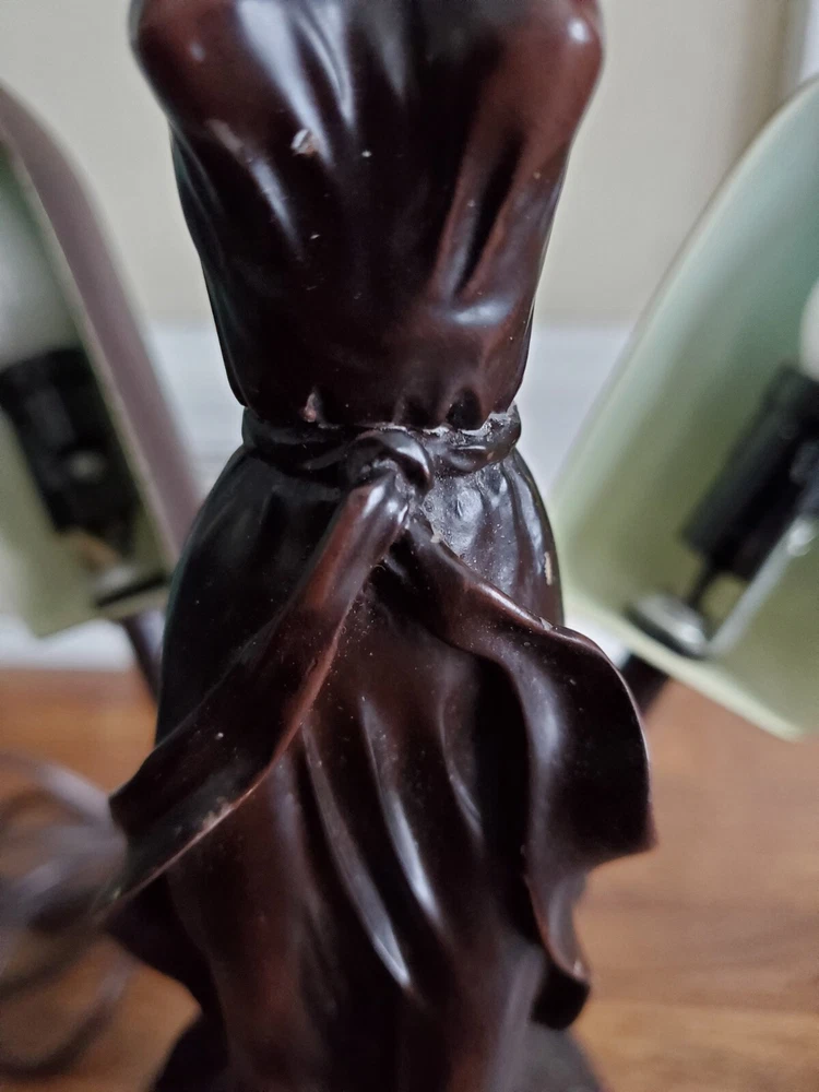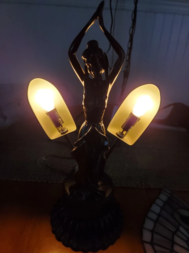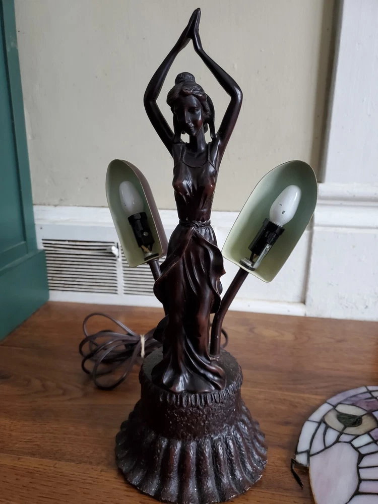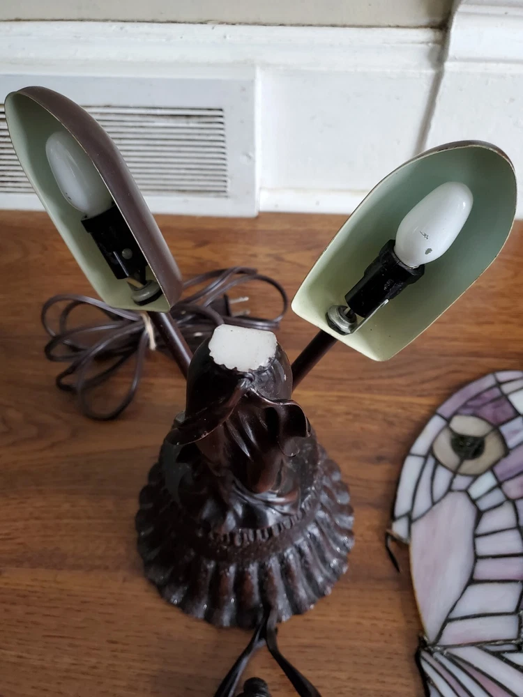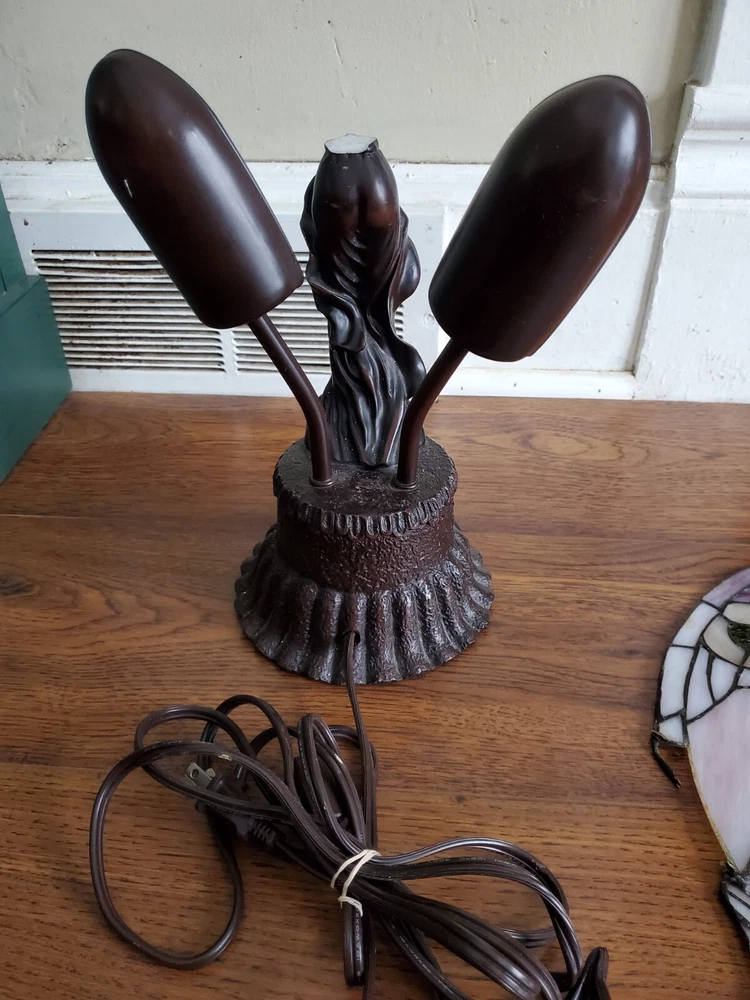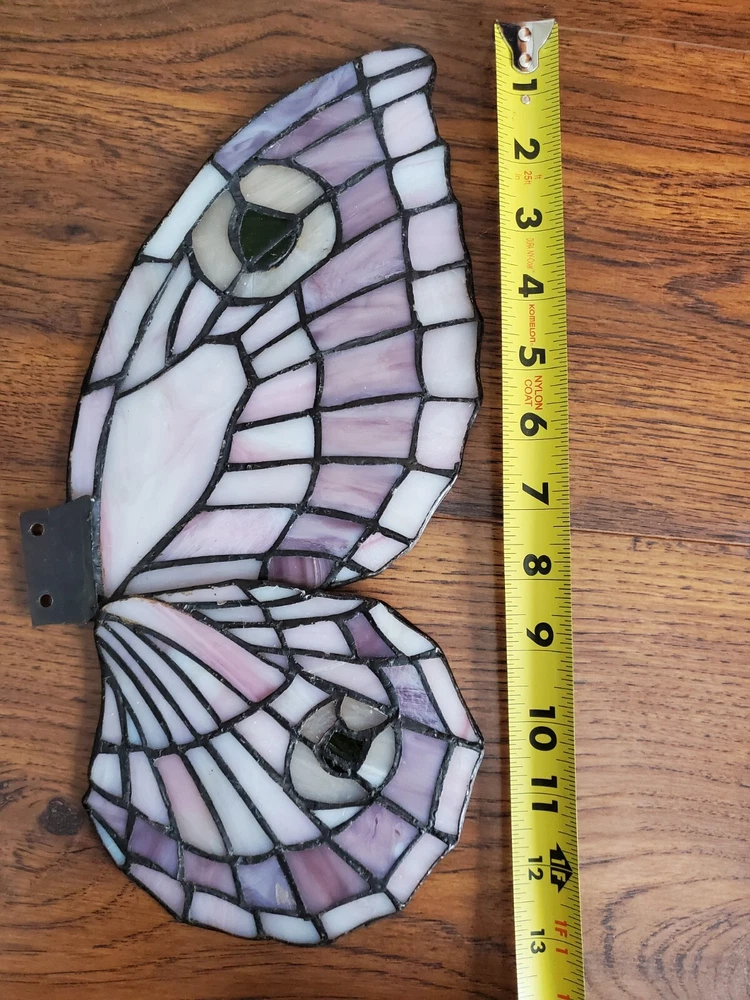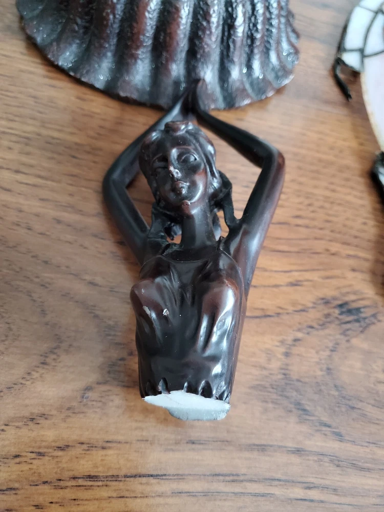 Tiffany Style Table Lamp Fairy Angel Stain Glass Wings, snapped at waist appears to be a clean cut/break & glue able, minor chipping throughout (nothing major), wings are missing 1 bracket to mount to the fairy & a couple inches of glass that goes around bracket. Great project for someone that knows how to fix it, otherwise she is a beautiful piece! Bulbs are included, she is approximately 15" tall & 8" width, selling as is, as pictured, no returns. Shipped USPS will purchase extra insurance for shipping