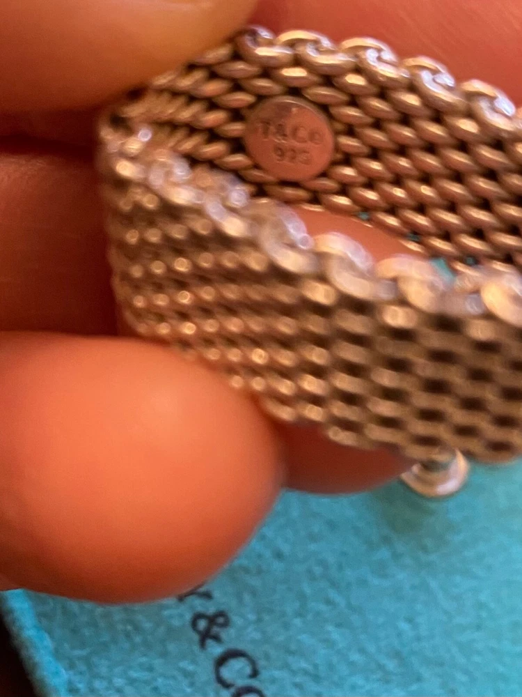 Pre-Owned, Like New (worn twice) AUTHENTIC Tiffany and Co. Somerset Silver Mesh Ring. Discontinued design. With Stamp and original packaging.