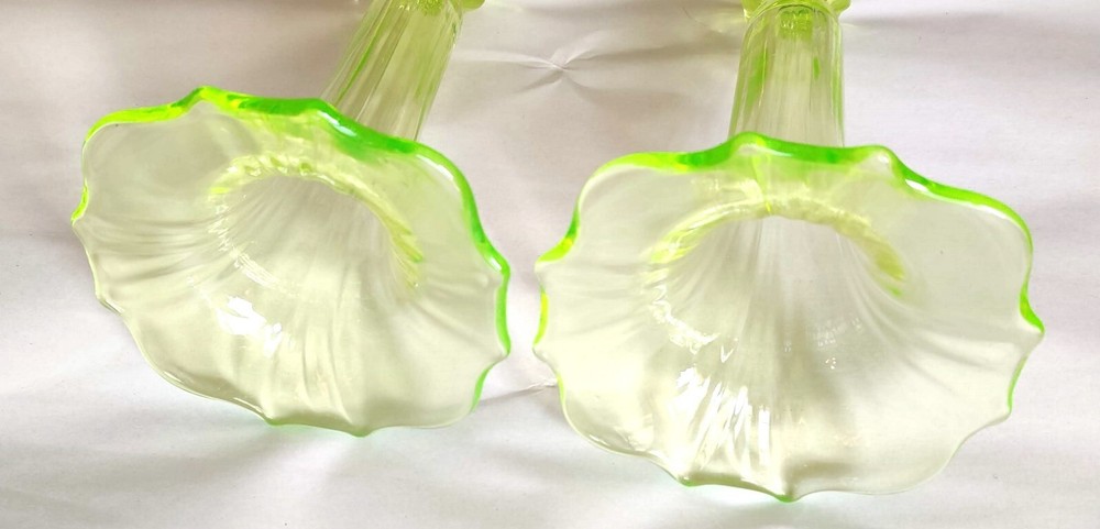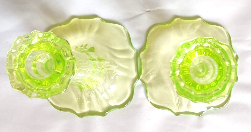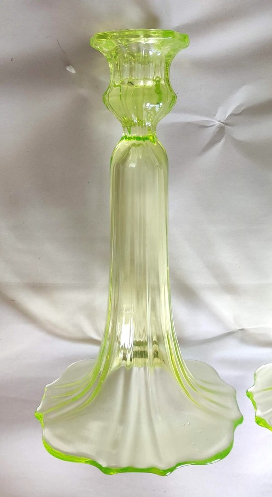 Tiffin Vaseline Glass Candlesticks 9" Tall U.S. Glass 310 Yellow Uranium Glass No chips cracks or other damage. A
