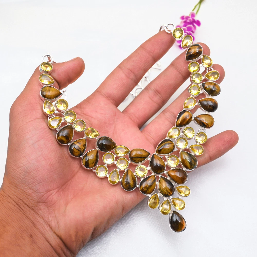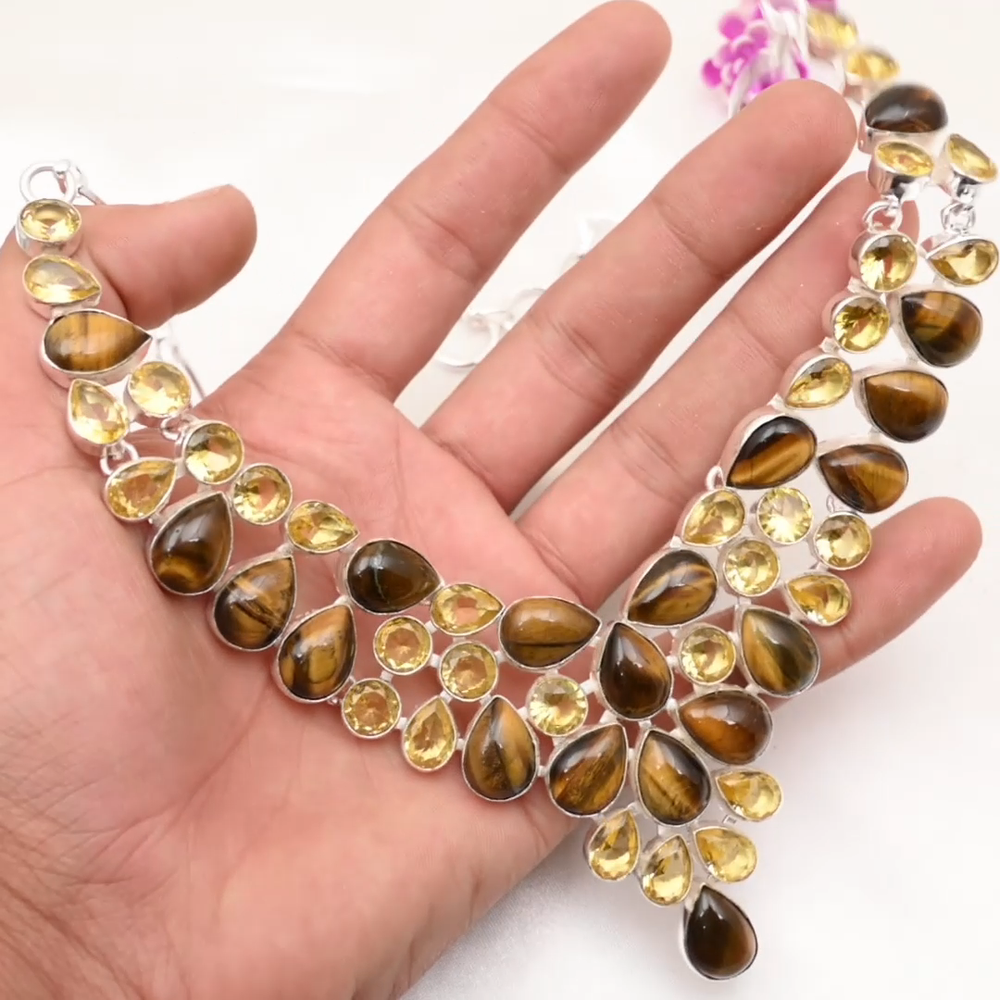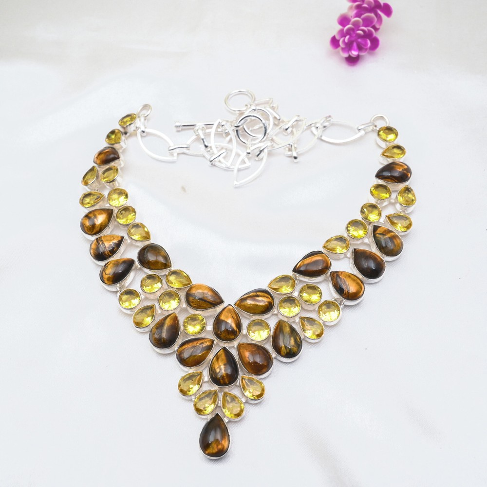 HomeTiger Eye and Citrine Gemstone Necklace Handmade in 925 Sterling Silver
