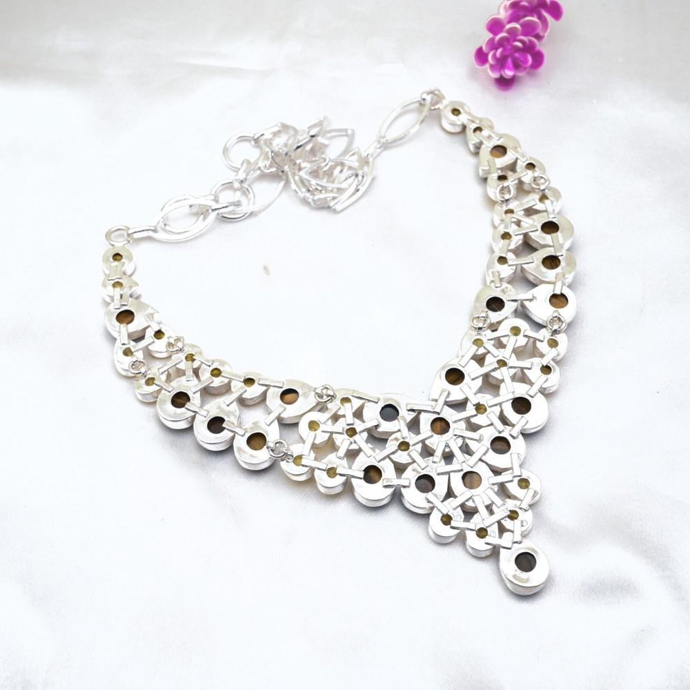 Cut Grade:Very GoodPendant Shape:Same As PictureNecklace Length:18 Inches With Adjustable ChainClosure:Same As PictureMain Stone:CitrineSetting Style:BezelSecondary Stone:Citrine, Tiger's EyeMain Stone Creation:NaturalStyle:NecklaceColored Diamond Intensity:N/AColor:SilverNumber of Diamonds:N/ATheme:Beauty, Bohemian, Ethnic, Halloween, LoveMetal:Sterling SilverMain Stone Color:YellowMain Stone Treatment:Not EnhancedCertification:N/ABrand:HandamdeCountry of Origin:IndiaOccasion:Anniversary, Birthday, Christmas, Engagement, Father's Day, Mother's Day, Valentine's Day, WeddingCountry/Region of Manufacture:IndiaDiamond Clarity Grade:N/ACollection:HandmadeFeatures:HandmadeMaterial:Stone, GemstoneChain Type:Same As PictureNumber of Gemstones:51Pendant/Locket Type:CharmMetal Purity:925Diamond Color Grade:N/ABase Metal:Sterling SilverType:NecklaceTotal Carat Weight:10 carat and aboveMain Stone Shape:Pear