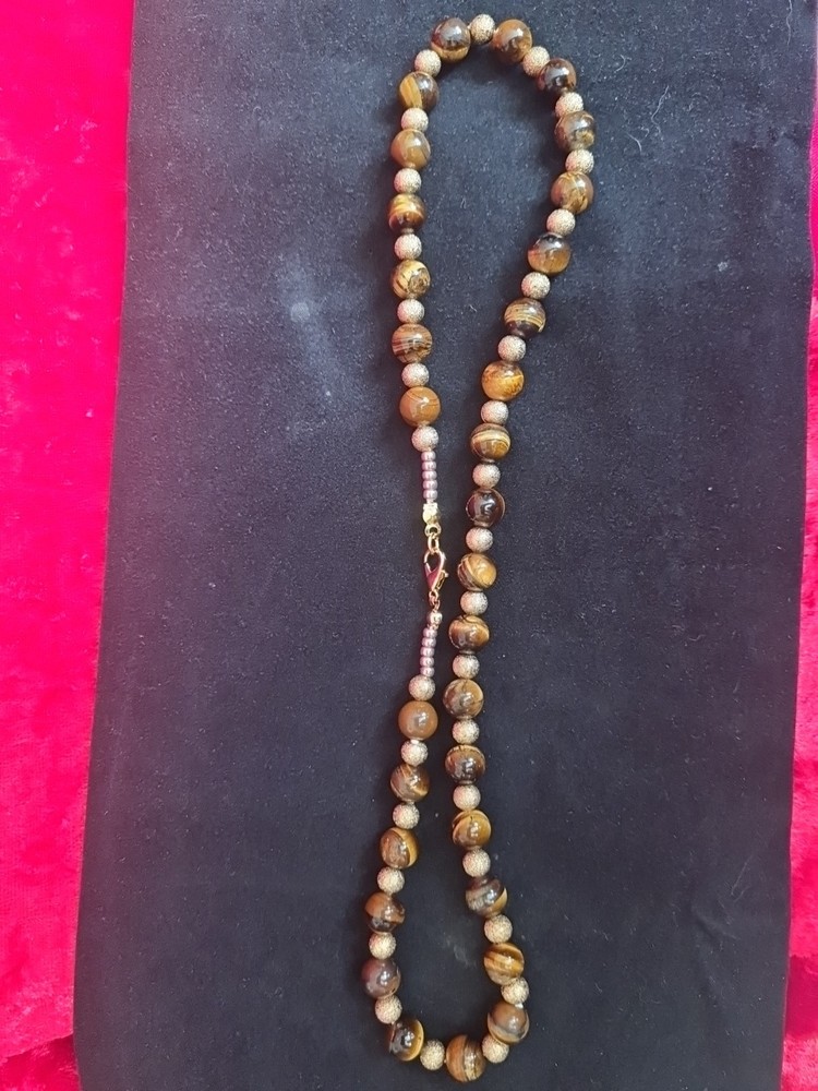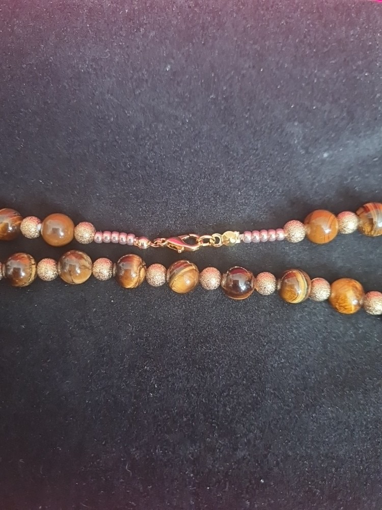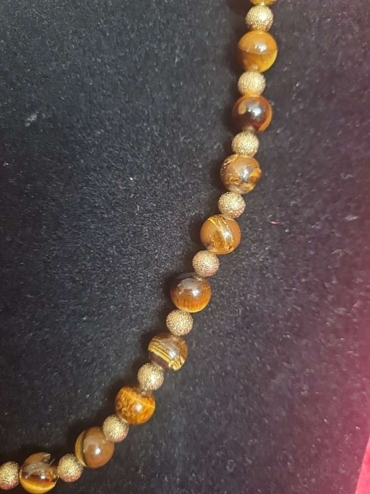 A handmade tigers eye and gold coloured bead necklace measuring 17 inches. There are 31 tigers eye beads interspersed with gold coloured textured beads which really set off the tigers eye.