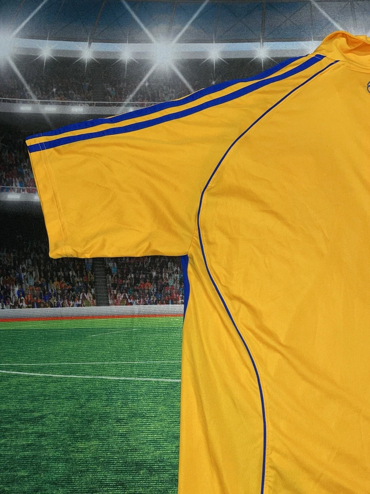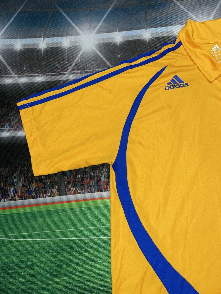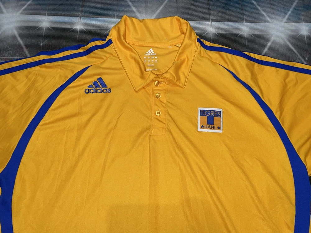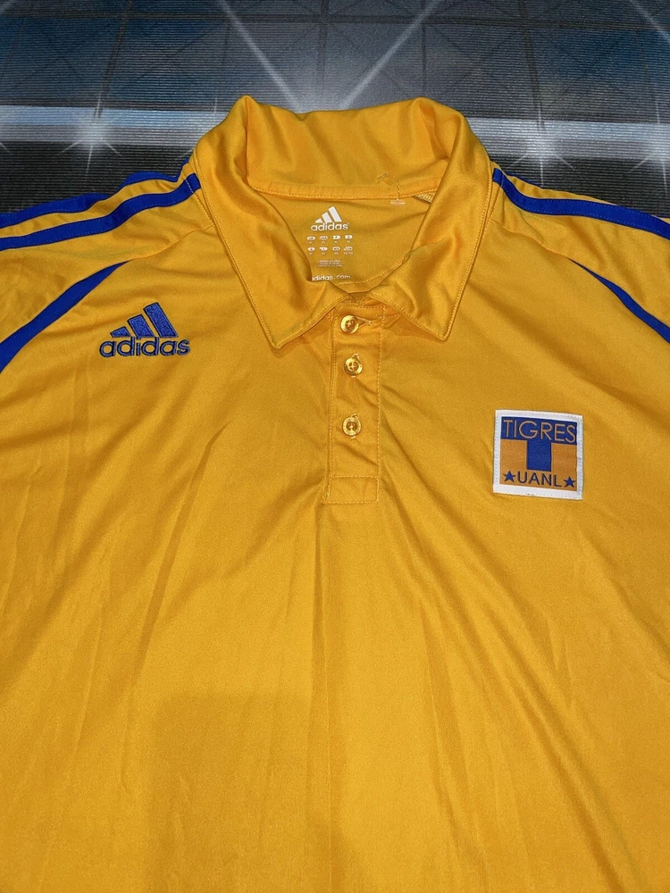 Show your support for Tigres UANL with this preowned Adidas polo shirt in size XL. The vibrant yellow color is sure to make you stand out in the crowd while cheering on your favorite soccer team. This shirt is perfect for any fan looking to add to their collection of sports memorabilia. The shirt is in great condition and has been well-maintained, ensuring that it will last for years to come. Whether you're at the stadium or watching the game from home, this polo shirt is a must-have for any Tigres UANL fan.