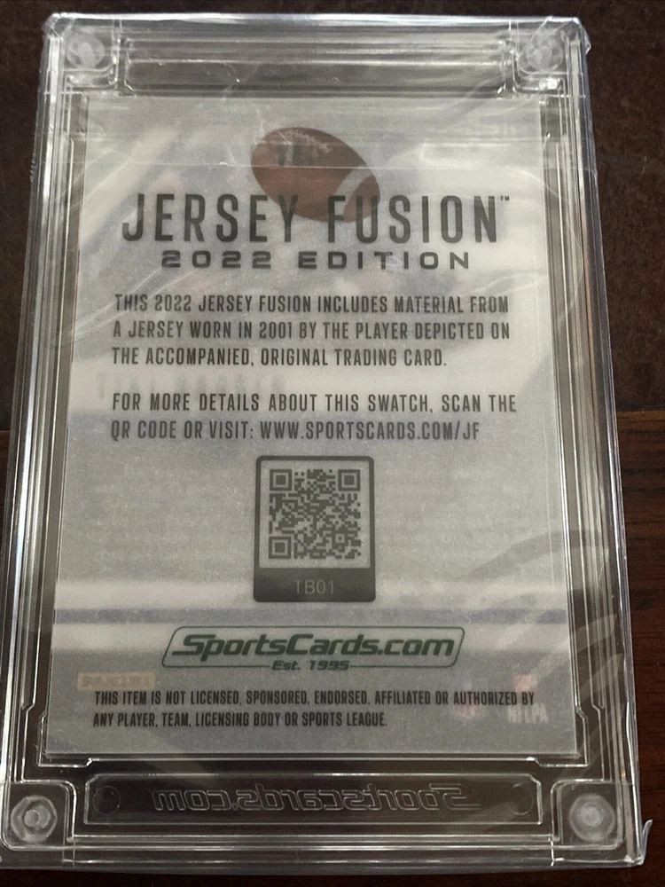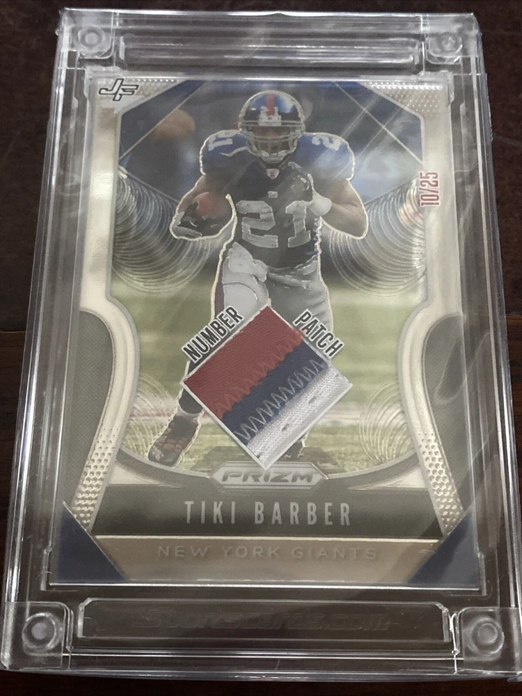 The product is a Tiki Barber Jersey Fusion Number Patch trading card from the New York Giants. It features a patch of Tiki Barber's jersey and is limited to only 25 copies. This card is a part of the sports trading card category and is a must-have for fans of football and sports memorabilia collectors.