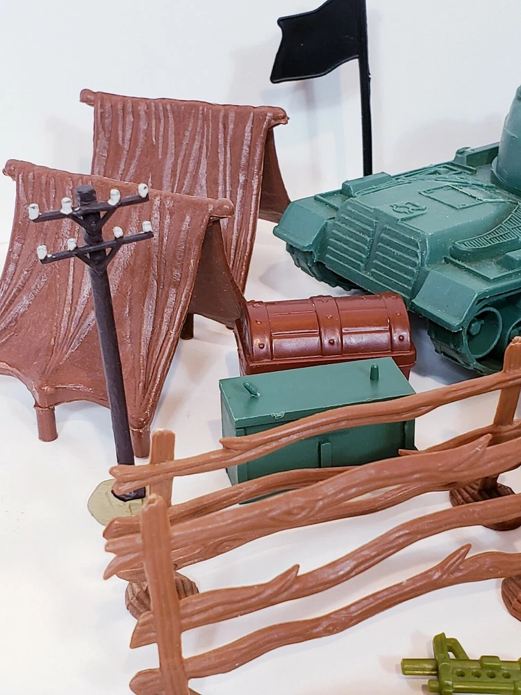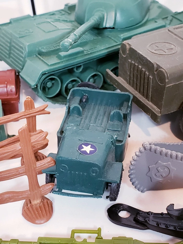 Tim - Mee Jeep Vintage Cannons Tank Tents Canoe Ammo Box Army assortment . Assorted plastic add on Pieces lot of 18 the jeeps steering wheel is missing some parts to the cannons are missing. Soldier is 4" in hight . It's a cool add on lot.
