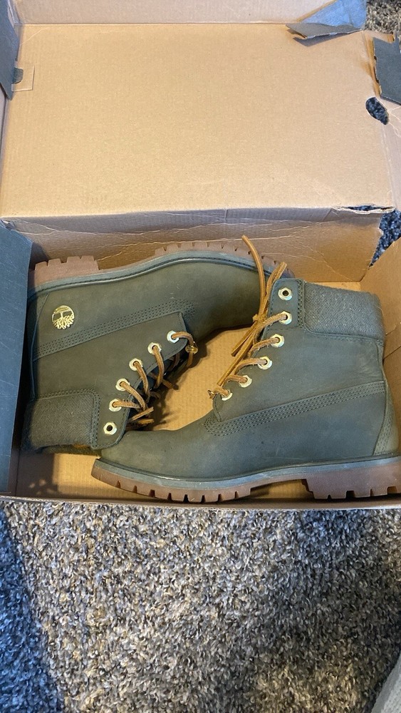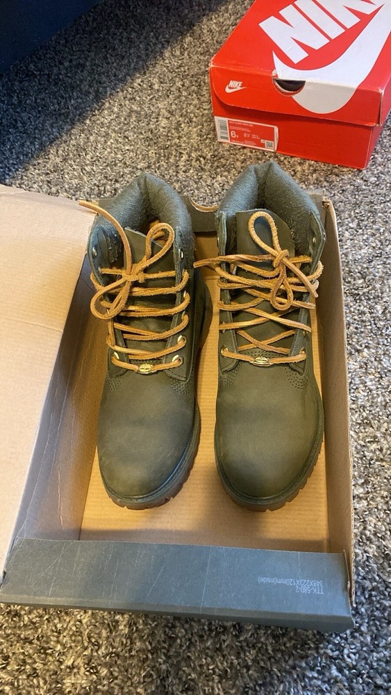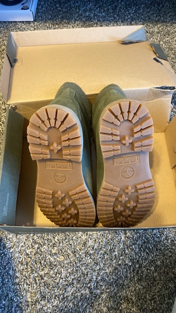 Never worn Timberland boots. Olive green color with gold accents, leather laces. Waterproof boots. Brand new boots, but the box is a little beat up! Size 7 but fits more like 7.5