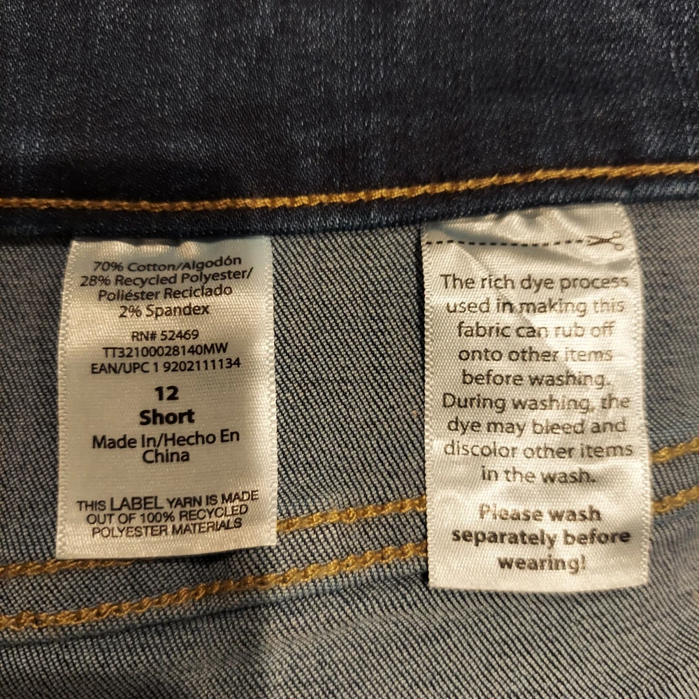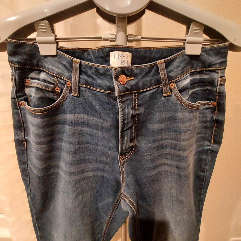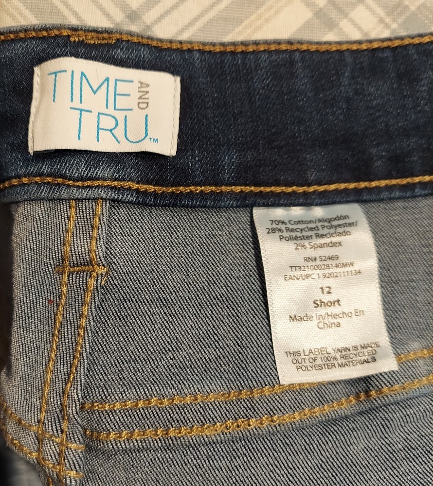 These Time And Tru jeans are mid-rise, size 12 short, blue denim with a straight leg style. They feature a 5-pocket design, zipper closure, and distressed medium wash. Made of polyester, spandex, and cotton, they provide comfort and stretch. Ideal for all seasons, these classic jeans have a regular fit and belt loops. Easy to care for with machine washable garment care.