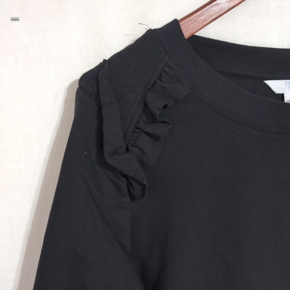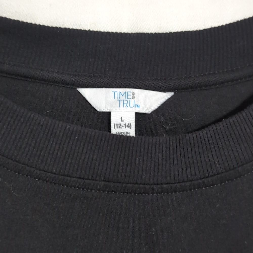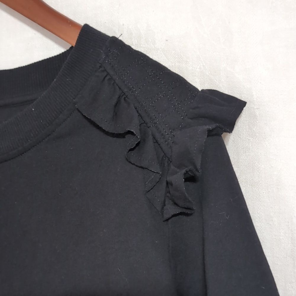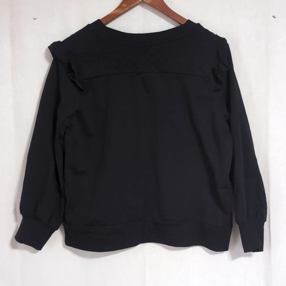 Time & Tru size large solid black color crewneck sweatshirt ruffle shoulders quilted detail on top of shoulders excellent preloved condition measurements pit to pit 21 length 23