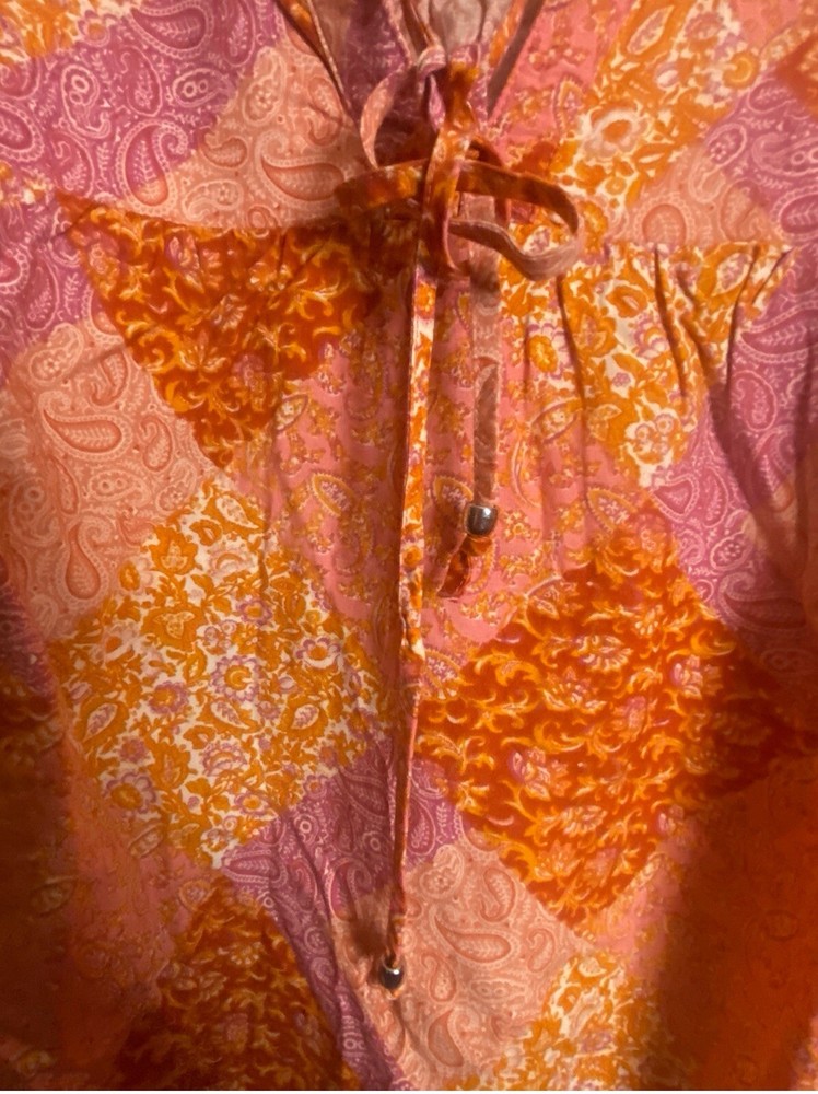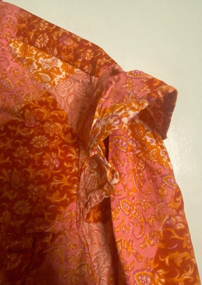 Tried on, and it was too short. Length 22in. This Time And Tru top is a stylish addition to any wardrobe. The floral pattern, long flutter sleeves, and tie V-neck collar add a touch of elegance to the relaxed fit. The blouse is made of lightweight, breathable material that is easy to care for and perfect for all seasons. The multicolor design is perfect for casual occasions, and the top is available in size 22. The garment care is machine washable, making it easy to maintain.