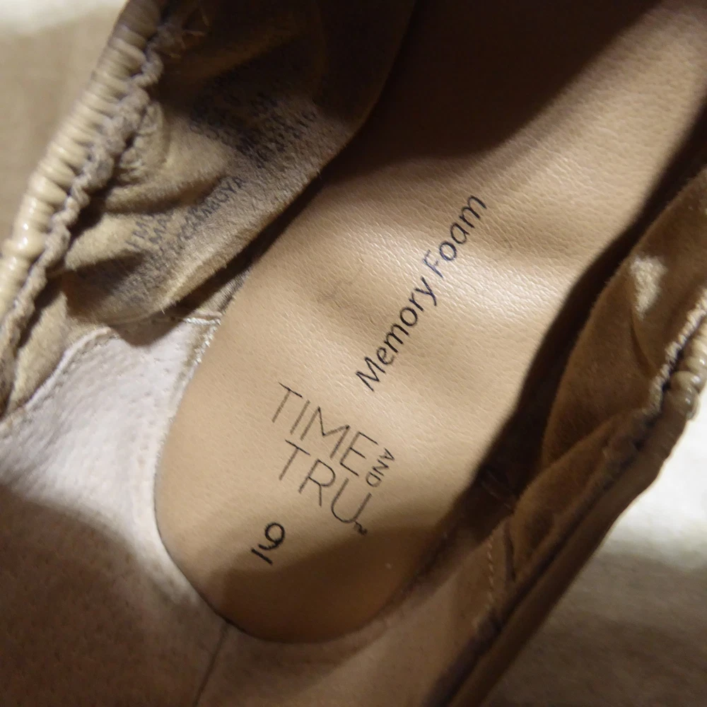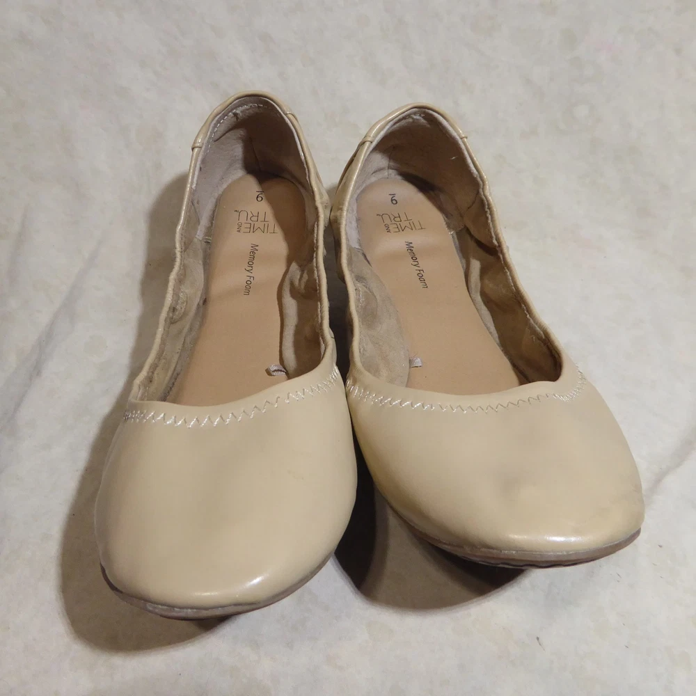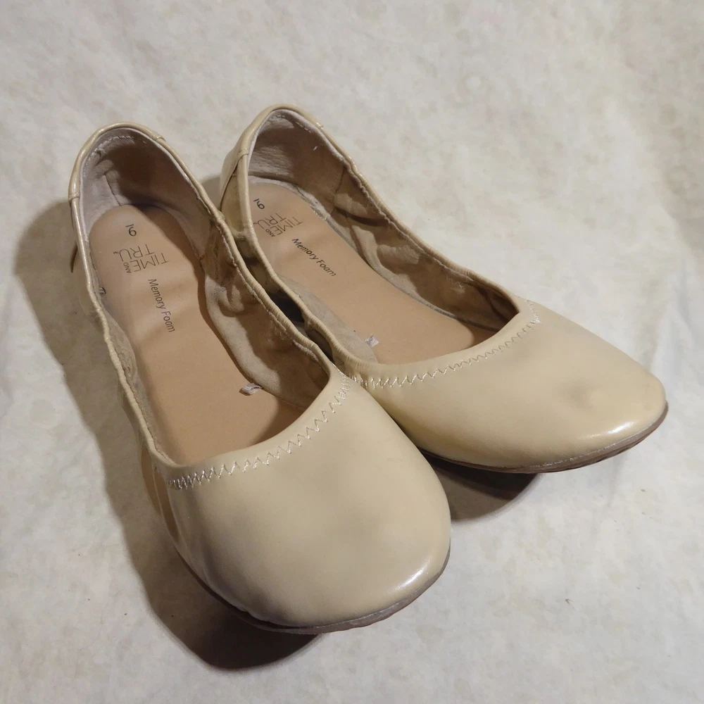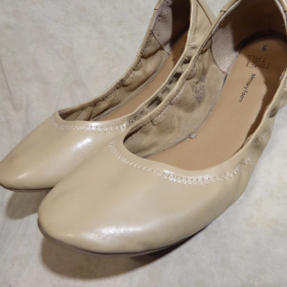 These are Time and Tru size 9 M classic scrunch ballet flats in glove soft nude beige leatherette with cushioned insole. In good condition inside and out; see all of the photos for details. One pair only; the photos are of this actual item. Please note: You'll get discounted USPS shipping with tracking. Plus, we combine shipping on multiple pairs and will refund any savings. We take a lot of photos and note any size discrepancies in our listings to insure a more accurate fit. Still, if your shoes don't fit you can return them for a refund for 30 days. (We automatically approve a "Doesn't fit" return.) Just start the return process to get a free return shipping label. Thanks for considering; we appreciate your business!