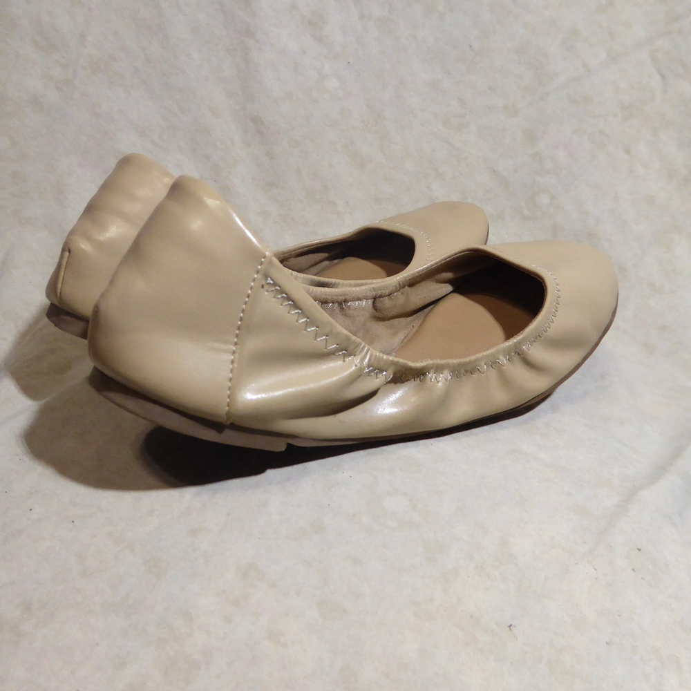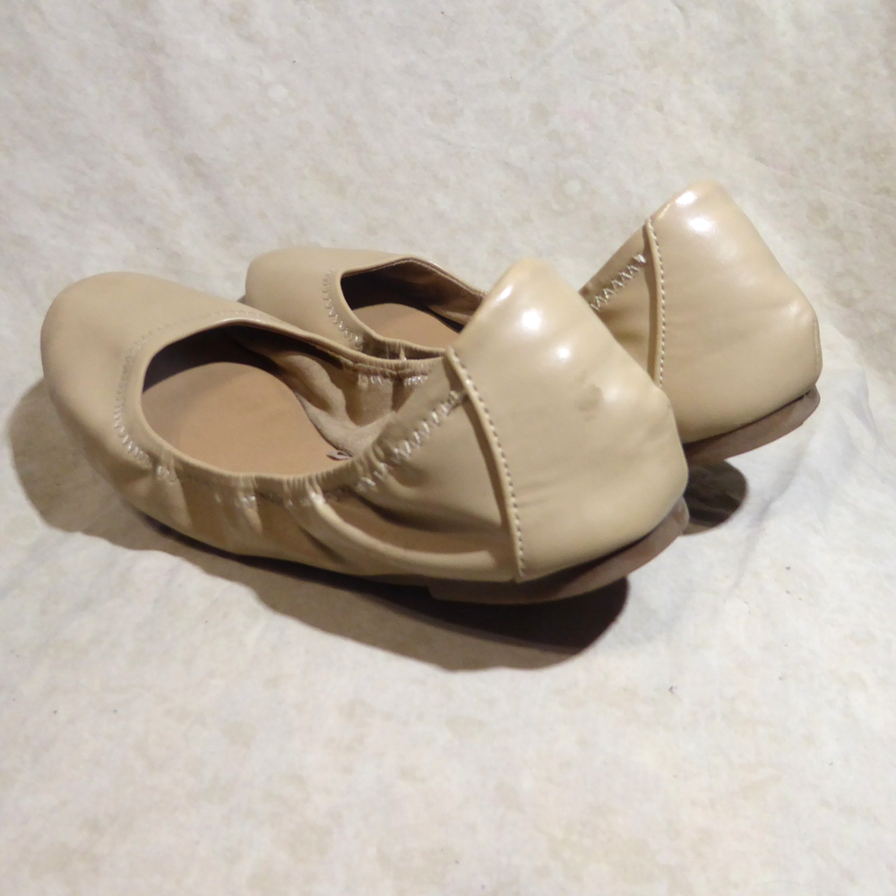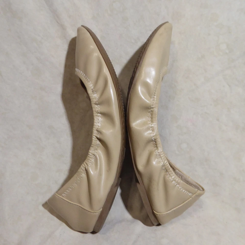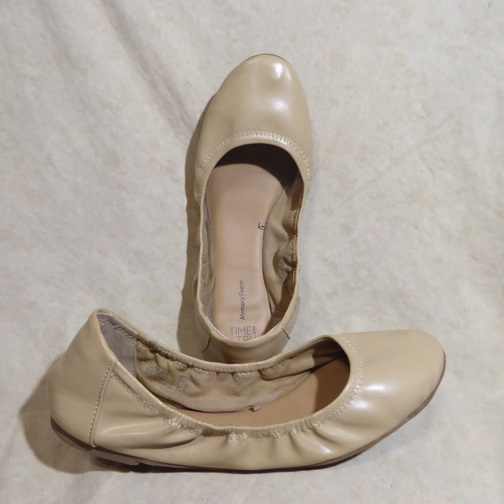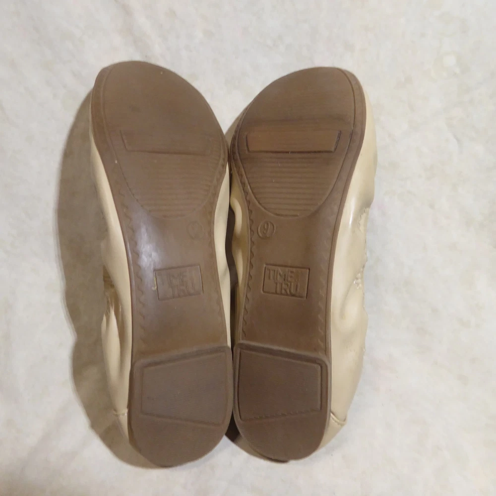These are Time and Tru size 9 M classic scrunch ballet flats in glove soft nude beige leatherette with cushioned insole. In good condition inside and out; see all of the photos for details. One pair only; the photos are of this actual item. Please note: You'll get discounted USPS shipping with tracking. Plus, we combine shipping on multiple pairs and will refund any savings. We take a lot of photos and note any size discrepancies in our listings to insure a more accurate fit. Still, if your shoes don't fit you can return them for a refund for 30 days. (We automatically approve a "Doesn't fit" return.) Just start the return process to get a free return shipping label. Thanks for considering; we appreciate your business!