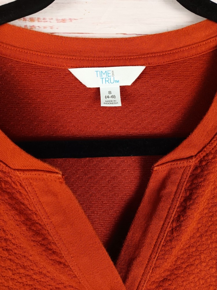 This Time and Tru blouse is a must-have for any woman's wardrobe. The V-neckline and 3/4 sleeves make it a stylish and comfortable choice for any occasion. The pullover closure and solid pattern make it easy to wear and match with any outfit. Made of a blend of polyester, spandex, and cotton, this blouse is both durable and machine washable for easy care. The brown color and regular fit add to its versatility and appeal. This blouse is perfect for any woman looking for a basic, yet stylish top to add to their collection.