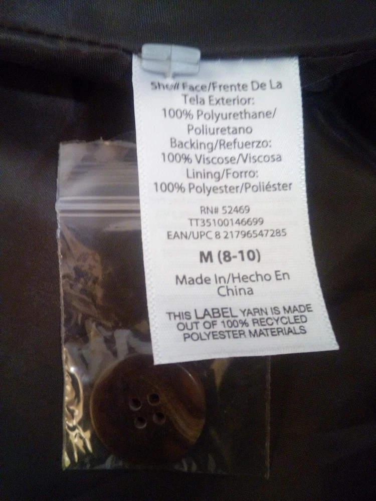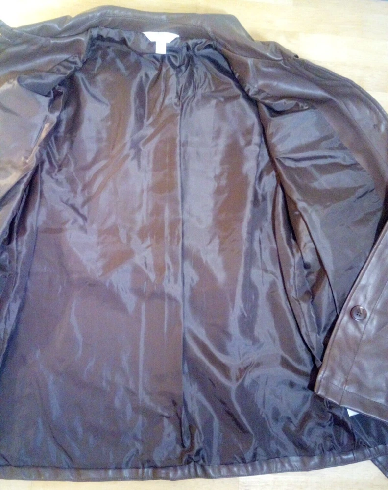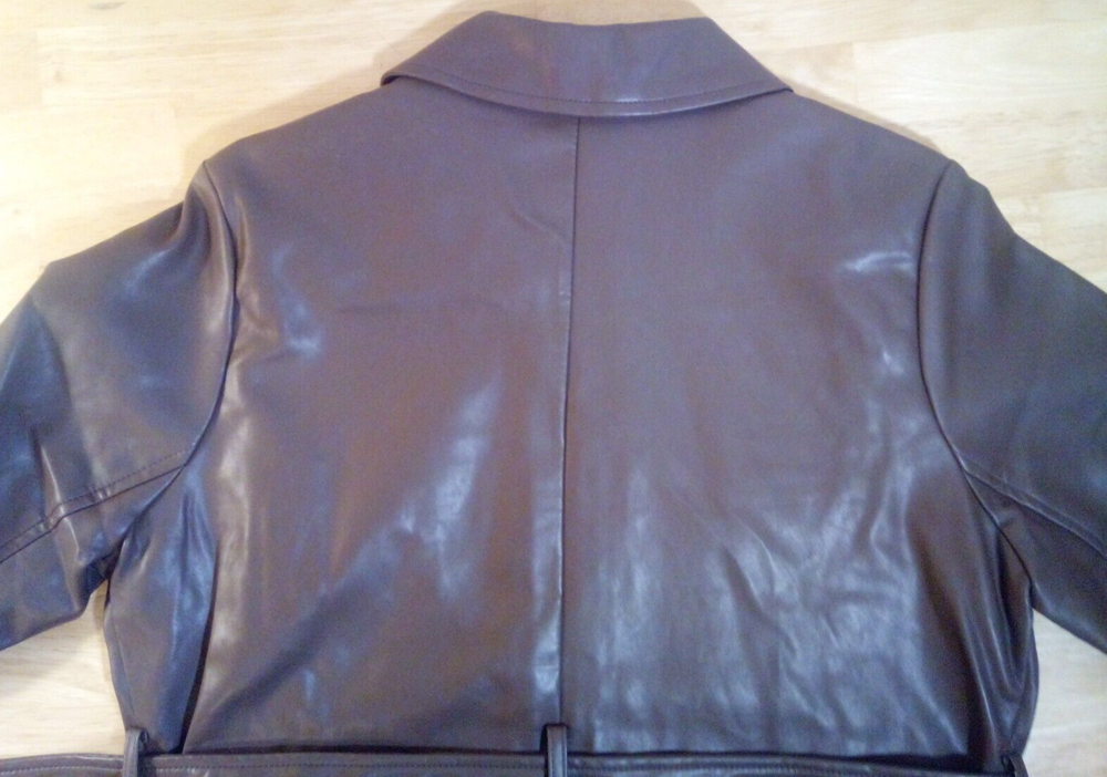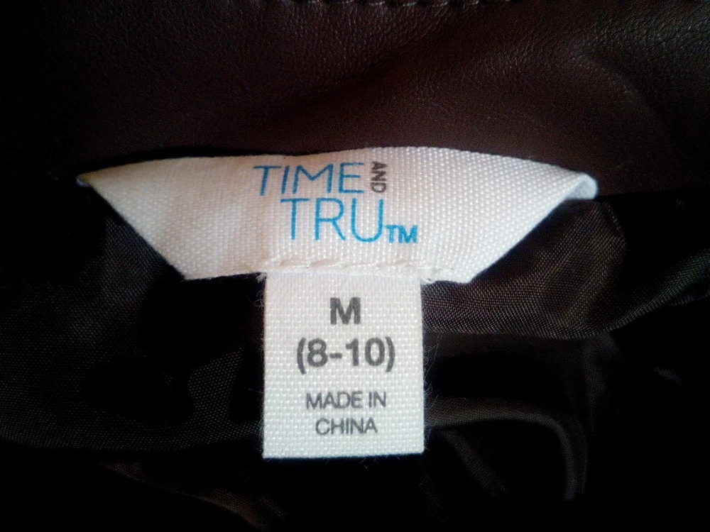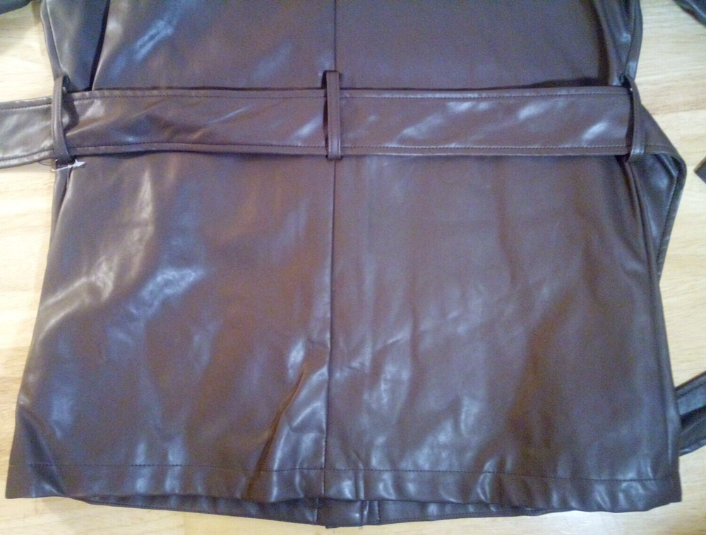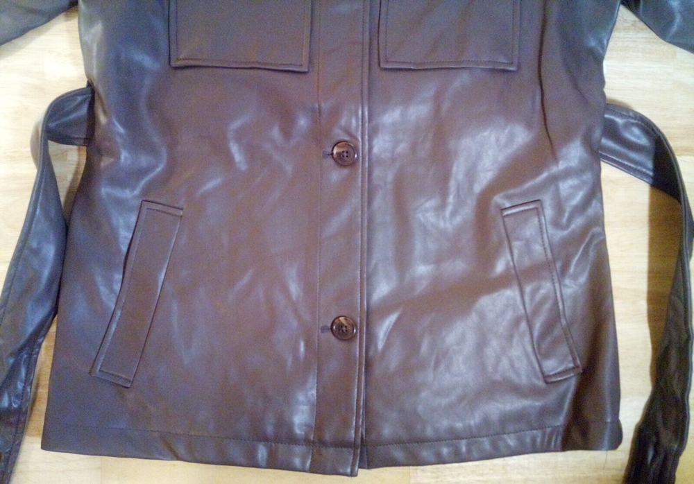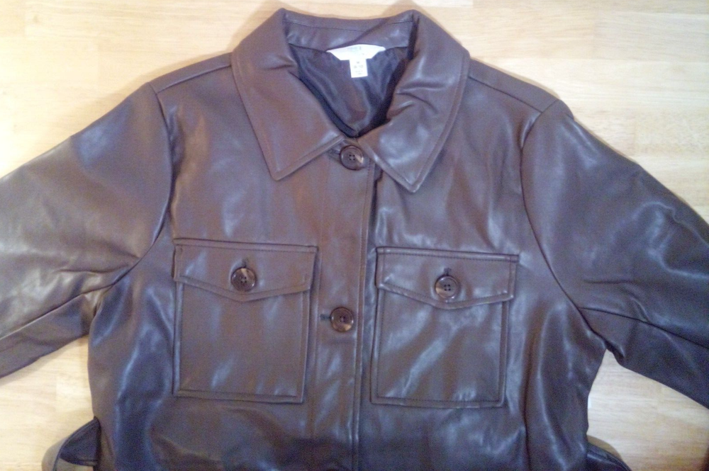 Time and Tru Women's Faux Leather Belted Brown Trench Jacket Size M (8-10) Material: Shell: 100% Viscose; Coating: 100% Polyurethane; Lining: 100% Polyester Pockets: Two buttoned chest pockets; two welt pockets Features: Self-tie belt; belt loops; wind-resistant Free Shipping. Local pickup available. [Lot 7-C-34]