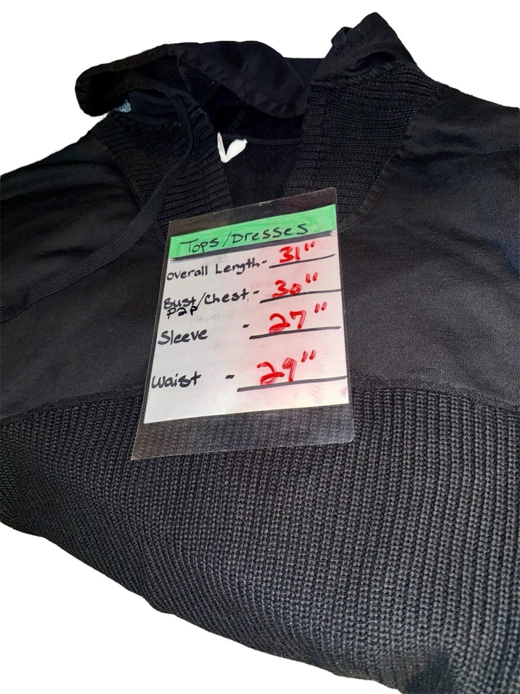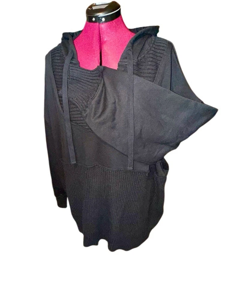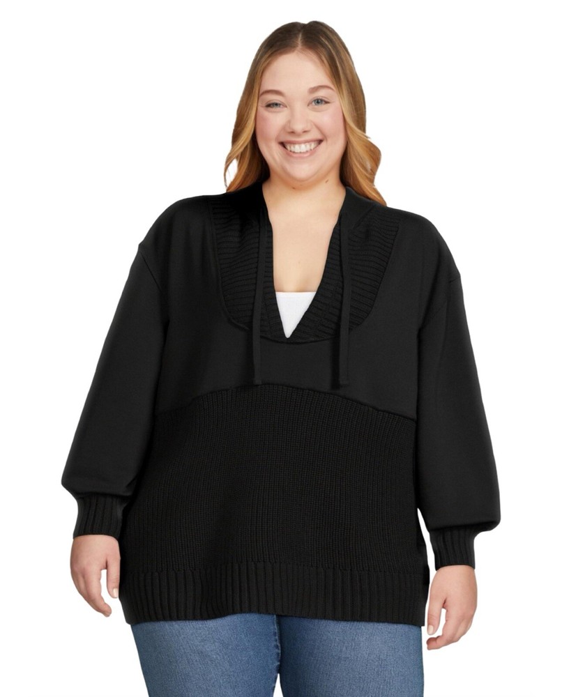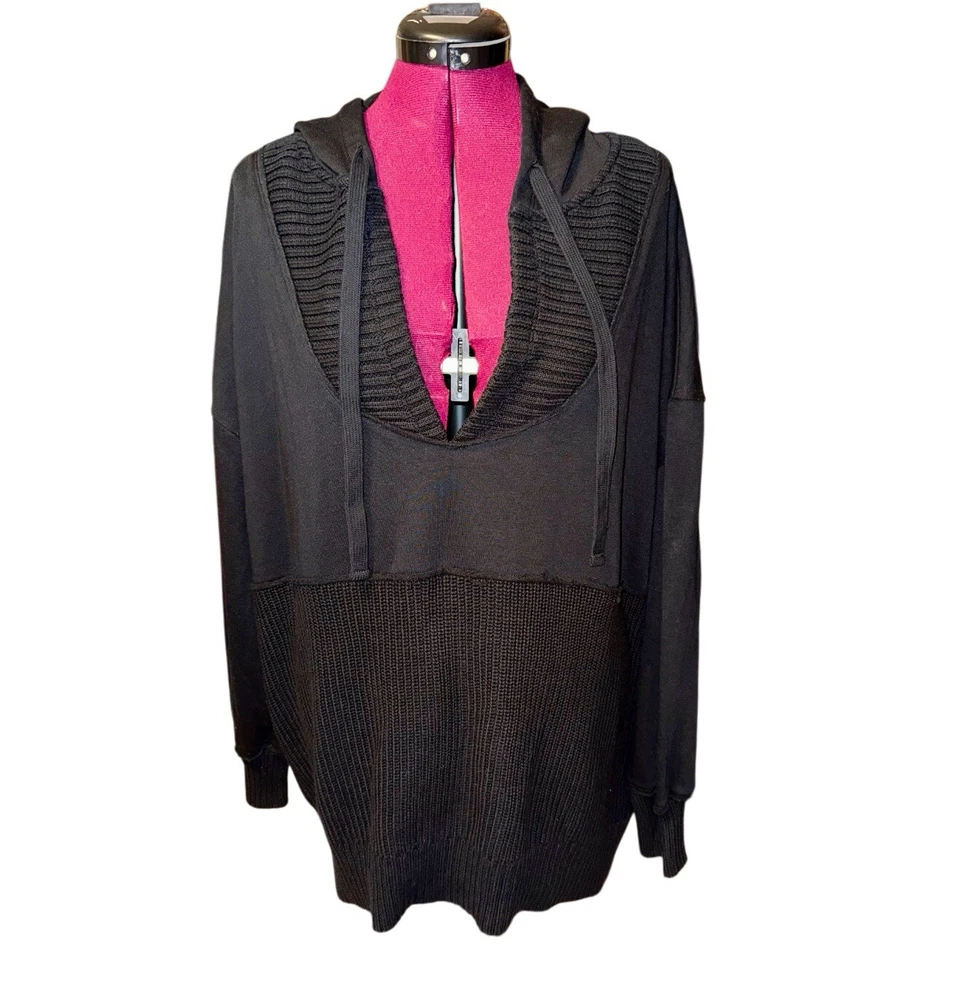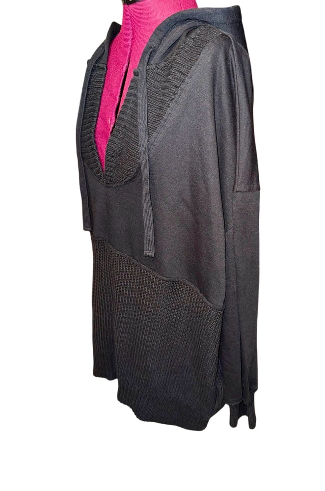 Elevate your activewear collection with the Time and Tru Women's Mixed Media Hoodie in a versatile black color. Tailored for a comfortable fit, this size 3XL pullover is designed to provide a relaxed touch to your casual outings or workout sessions. The blend of acrylic, cotton, and polyester ensures a soft feel with the durability needed for regular wear. The hoodie features a stylish V-neck and long sleeves complemented by a drawstring accent that adds a touch of sophistication to the classic hooded design. Solid in pattern yet chic in appearance, this hoodie is a testament to the effortless blend of comfort and style that Time and Tru is known for. Whether it's for a brisk jog or a laid-back day, this hoodie is an ideal addition to your wardrobe. Time and Tru Women's Mixed Media Hoodie Size 3XL Why have one when you can have both? Part sweater, part sweatshirt and 100% awesome, Time and Tru’s Mixed Media Hoodie is your new casual-day fave for everything from running errands to hanging at home. Relaxed and slightly oversized, this V-neck hoodie is the perfect match to your go-to denim or leggings. Material: 60% Cotton/40% Acrylic Care: Machine washable Country of Origin: Imported Size: Model is 5’3’’ and is wearing size XL Fit: Relaxed Neckline: V-neck with attached hood Closure: Pullover style Sleeves: Long sleeves Pockets: None Features: Mixed media design Womens Mixed Media Hoodie from Time and Tru Please refer to pics for measurements and any potential imperfections; Thank you!