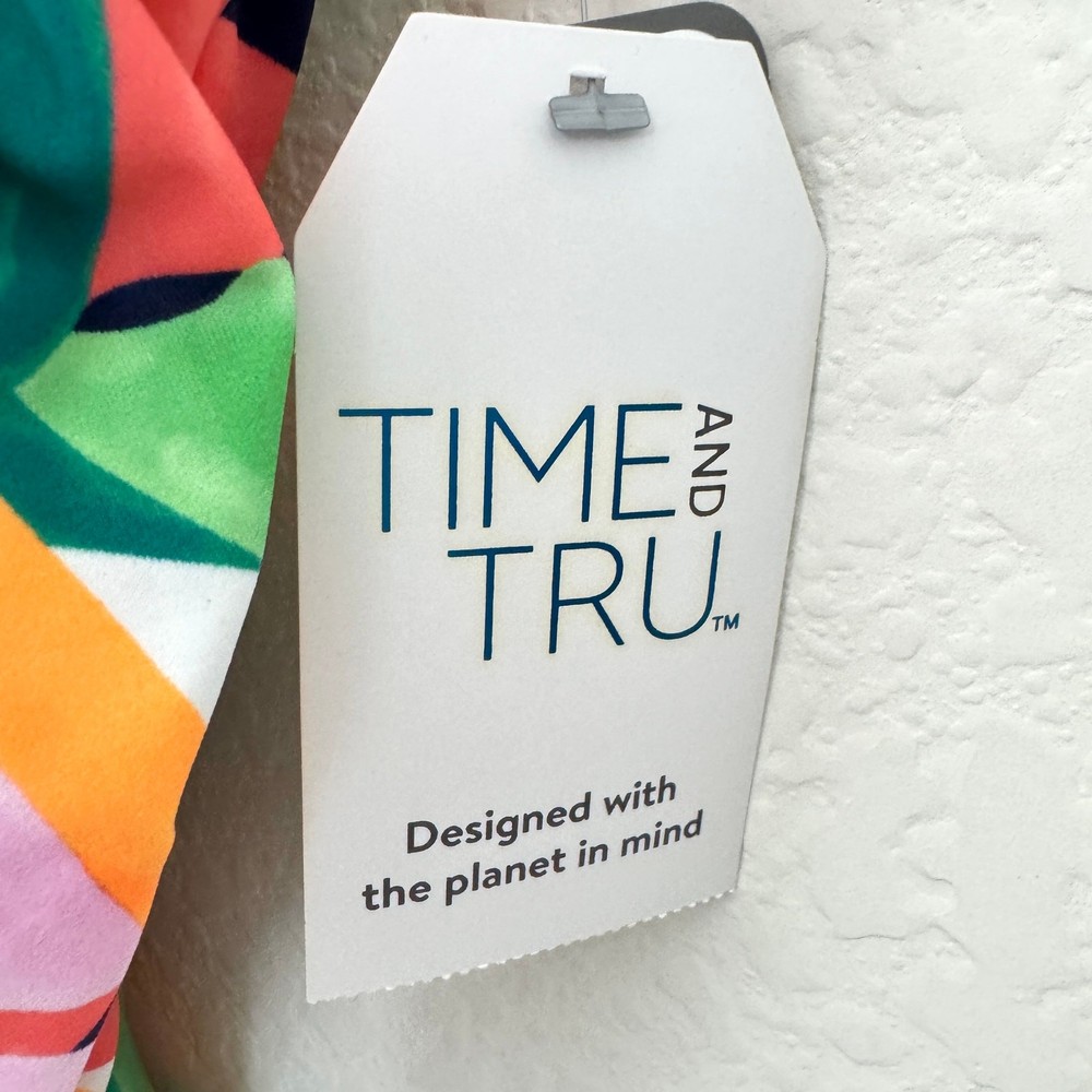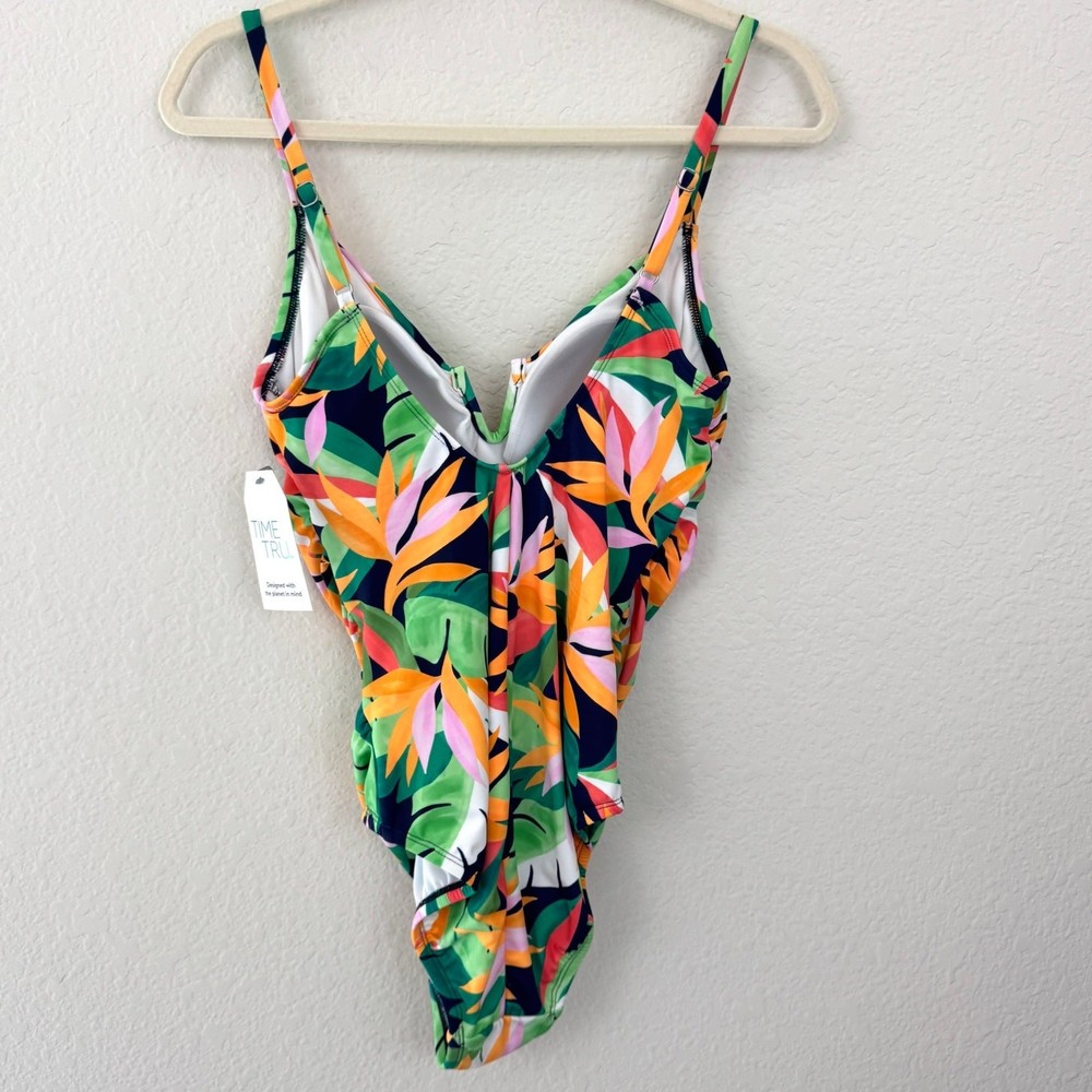 Brand: Time and Tru Size: Large (12-14) Measurements: Please see last photo for approximate measurements. Condition: Brand New With Original Tags Attached. Color: Green, black, orange, multi Material: Nylon, spandex Features: Adjustable straps Full seat coverage Padded shelf bra (non removeable cups) Style: spring, summer, travel, resort wear, cabana, beach, pool, resort, cruise, warm weather, casual, vacation, summervibes, beachvibes, coastal, nautical, swim, pool, tropical, floral