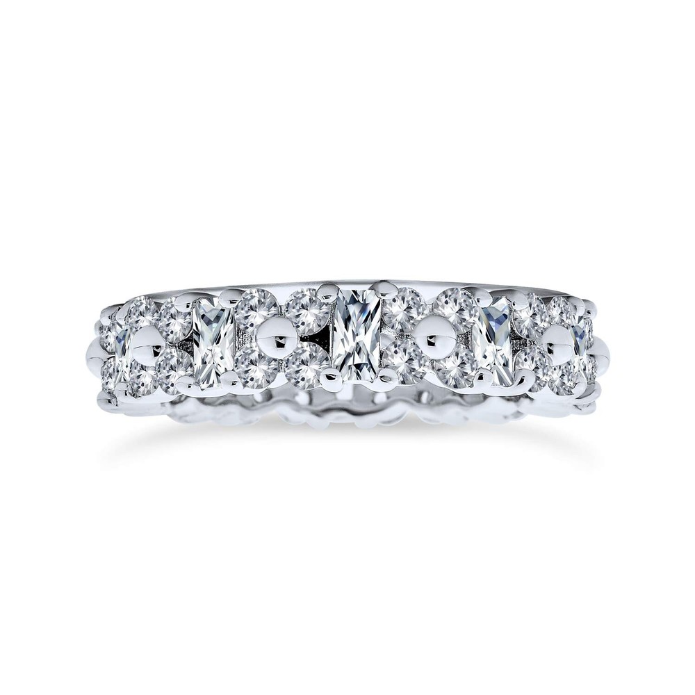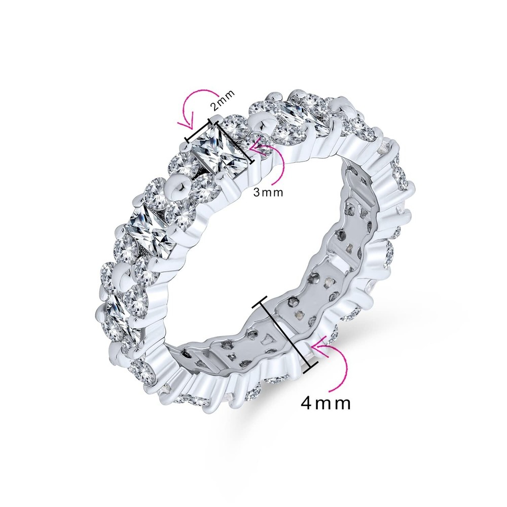 Timeless Cubic Zirconia AAA CZ Alternating Round & Baguette Flower Anniversary Eternity Wedding Band Ring For Women .925 Sterling Silver Product Details Color: Clear Ring Size: 8 Brand: Bling Jewelry MPN: PK-223-4685 UPC: 640626682381 EAN: 0640626682381 Is Discontinued By Manufacturer : No Package Dimensions : 1.75 x 1.75 x 0.7 inches; 0.29 ounces Item model number : PK-223-4685 Department : womens Date First Available : November 20, 2009 Manufacturer : Bling Jewelry Brand, Seller, or Collection Name: Bling Jewelry Metal stamp: 0.925 Metal: Rhodium-plated silver Material: Metal Gem Type: Cubic Zirconia Minimum total gem weight: 1.50 carats Setting: Prong Item Length: 0.71 inches Width: 4 millimeters Ring size: 8 Resizable: No Number of stones: 45 Stone Weight: 0.03 carats, 0.20 carats Model number: PK-223-4685-8 Size per pearl: not-applicable Show your eternal love with our stunning eternity style wedding bands. This sterling silver ring features alternating cuts of sparkling CZ stones. The Emerald Cut and round cut stones add extra beauty to any outfit. Perfect for your big day, these rings make gorgeous wedding bands. Get one for your I Dos today.