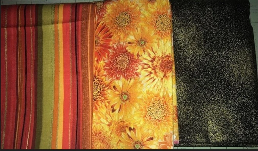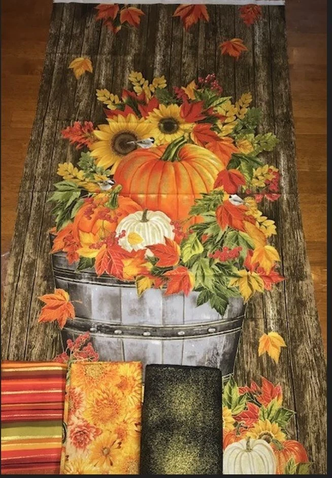 This quilt kit includes 2 2/3 yards of fabric from Timeless Treasure's Fall Is In The Air collection to piece the top and bind the quilt as noted below. Backing fabric and batting are not included. A complimentary copy of the free pattern designed by Laureen Smith is included. Fabric stored in a non-smoking, pet-friendly home. Skill level: Intermediate Finished Quilt Size: approximately 36½" x 55½" Fabric Requirements One panel (2/3 yard) Panel-CM2800 Brown 1 yard Shimmer-Black (includes 3/8 yard for binding) 1/2 yard Harvest-CM2102 Autumn 1/2 yard Stripe-CM2804 Harvest Recommended but not included - 1 7/8 yards backing fabric of your choice 45" × 64" batting