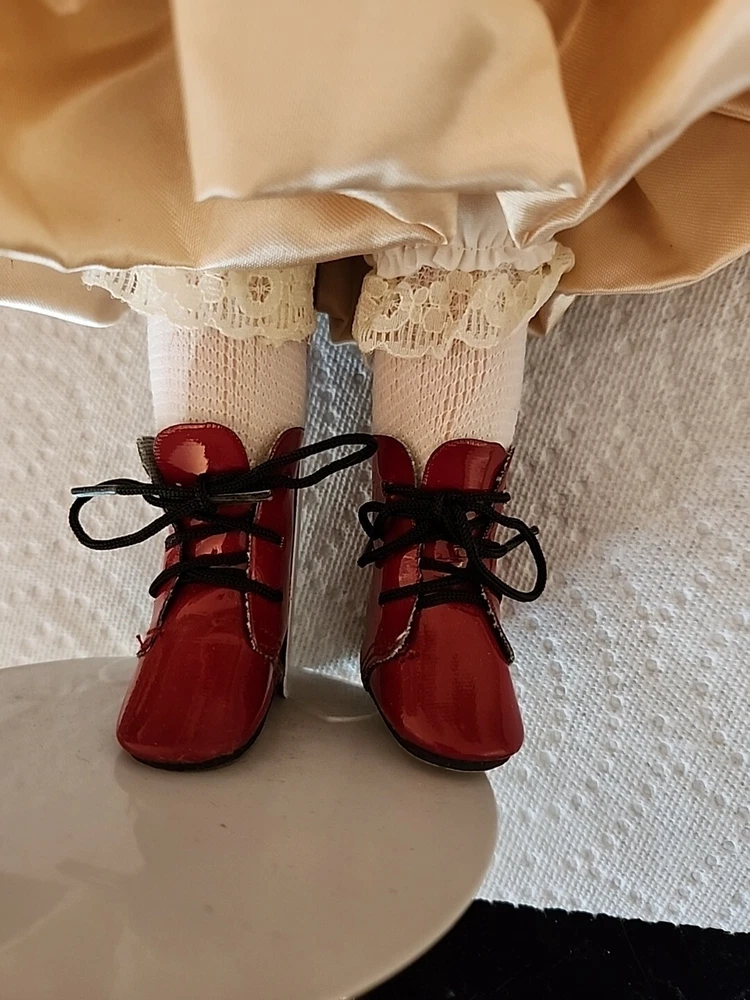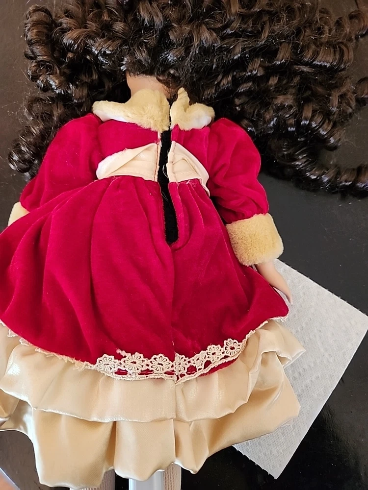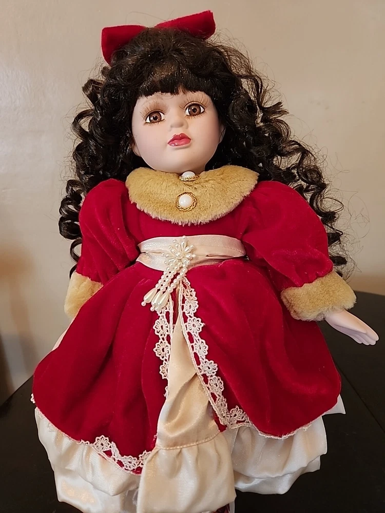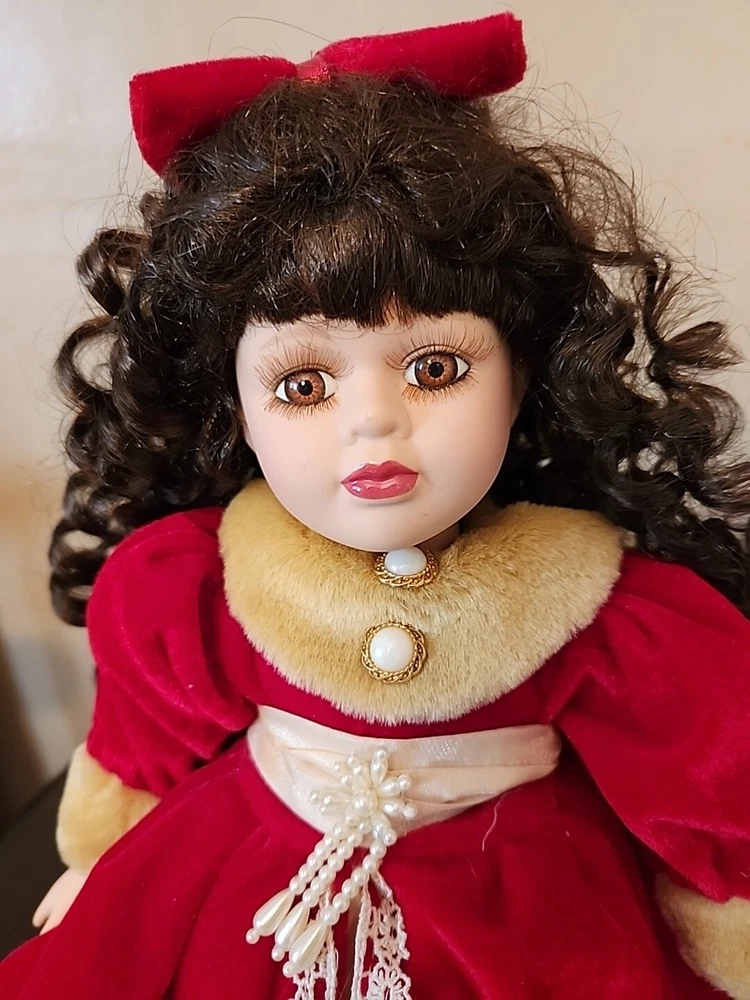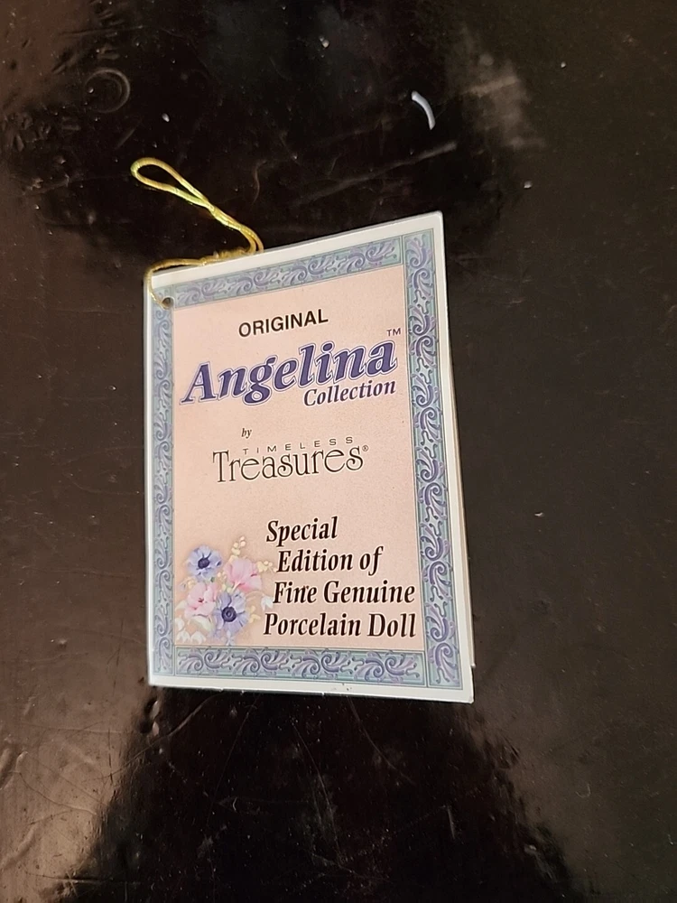 Features: Timeless Treasure Doll Complexion: Light Material: Porcelain Ethnicity: Caucasian Brand: Timeless Treasures Doll Eye Color: Brown Doll Hair Color: Dark Brown Type: Porcelain Doll Doll Hair Type: Curly Unit of Sale: Single Unit Vintage: No Franchise: Angelina Collection Year Manufactured: 2001 Number of Pieces: 1 Original/Licensed Reproduction: Original Set Includes: Doll, Outfit Doll Gender: Girl Doll Antique: No Country/Region of Manufacture: China Packaging: Without Packaging Time Period Manufactured: 2000-2009 Doll Size: 16 in