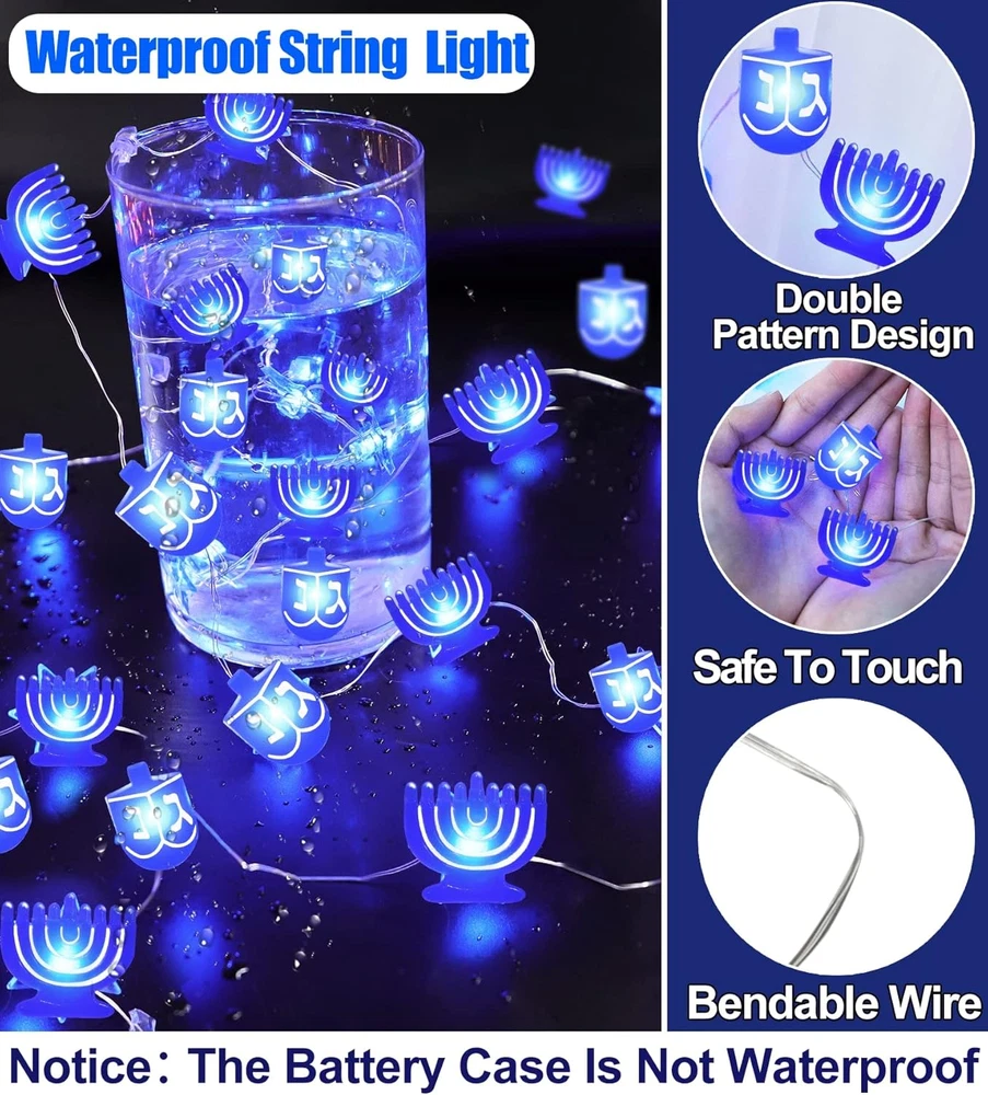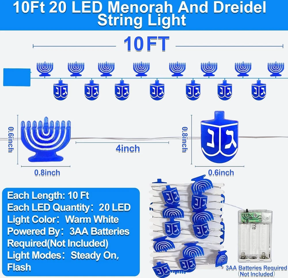 Menu Other Items Feedbacks About Us Contact Us Add To Favorites Timer 10 Ft 20 LED Hanukkah Decorations Menorah Dreidel String Lights Blue Fairy Twinkle Lights Battery Operated for Jewish Jews Synagogue Judaism Bedroom Party Candelabra Chanukah Decor Unique Design Hanukkah Lights : You will receive a 10 Ft 30 LED Hanukkah string lights with 2 shapes(Menorah and Dreidel). Each Menorah size is 0.8 x 0.6 inch(width x height). Each Dreidel size is 0.6 * 0.8 inch (width x height). Timer Function : Just switch into the "Timer" position, It will make the lights auto on for 6 hours and off for 18 hours per day. It will cycle everyday until you switch to the "Off" or "On" position Battery Operated & Safe : The Blue Hanukkah lights is in safe low voltage, so it will remain in cool state and safe to touch after long time use. It's safe for children and pets. Requires 3AA battery(not included). Lighting mode: steady on Flexible Copper Wire : The Hanukkah copper wire lights can be easily bent into any shape you like for indoor and outdoor use. It will add to the Hanukkah atmosphere for your room Hanukkah Party Decor : It can be used in Hanukkah decorations indoor, fireplaces, windows, children's rooms, bedrooms, walls, fireplaces, rooms, windows, fences, greenery, camping, front doors, courtyards, photo walls, small trees, cars,etc Specification Size/String: Total length: 10Ft Distance between two light: 4inch Single Menorah: 0.8 * 0.6 inch (W * H) Single Dreidel: 0.6*0.8 inch(W * H) Packing box: 5 * 4 * 1.8 inch (L * W * H) Product Appearance: Menorah and Dreidel. Number of lamps/string: 20 lights. Product Color: Blue Lighting mode: steady on Lighting Color: Blue Material: PVC + copper wire Power supply: 3AA battery (excluding battery). Other features: IP44 waterproof (battery case is not included) Applicable scene: Hanukkah decoration, fireplace, window, children's room, bedroom, wall, indoor. Package includes: 1 x Hanukkah Lights Item Specification Light Source Type LED Style Menorah and Dreidel Number of Items 1 Power Source Battery Powered Item Dimensions 1 x 1 x 1 inches Number of Light Sources 30 Control Method Touch Theme Jewish,Jews,Synagogue Controller Type Touch Control Product Dimensions 1 x 1 x 1 inches; 2.89 ounces Occasion Type Christmas Seasons Winter Additional Features Waterproof Indoor/Outdoor Usage Indoor Material Type Copper, Polyvinyl Chloride Light Color Blue Water Resistance Level Waterproof Occasion Christmas Special Feature Waterproof Color Dreidel & Menorah Indoor Outdoor Usage Indoor Style Name Menorah and Dreidel Shipping FREE FREE SHIPPING We are always working hard to ensure your package arrives as soon as possible. Please understand that some factors like weather, high postal traffic, and the performance of shipping companies are outside of our control. We offer free shipping to the lower 48 states. We do not accept P.O. Boxes. Please provide a physical address. If you have a problem or question regarding your transaction please contact us immediately. We will work with you to resolve any problem you may have. Thank you