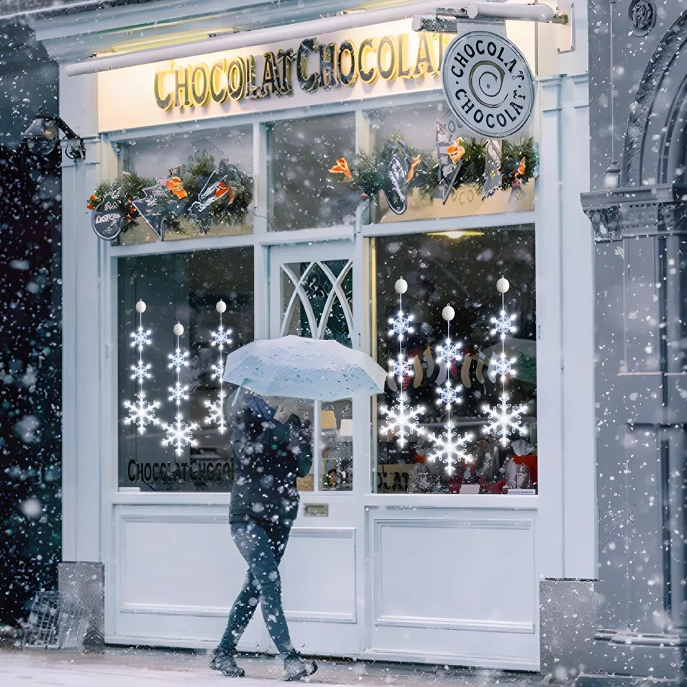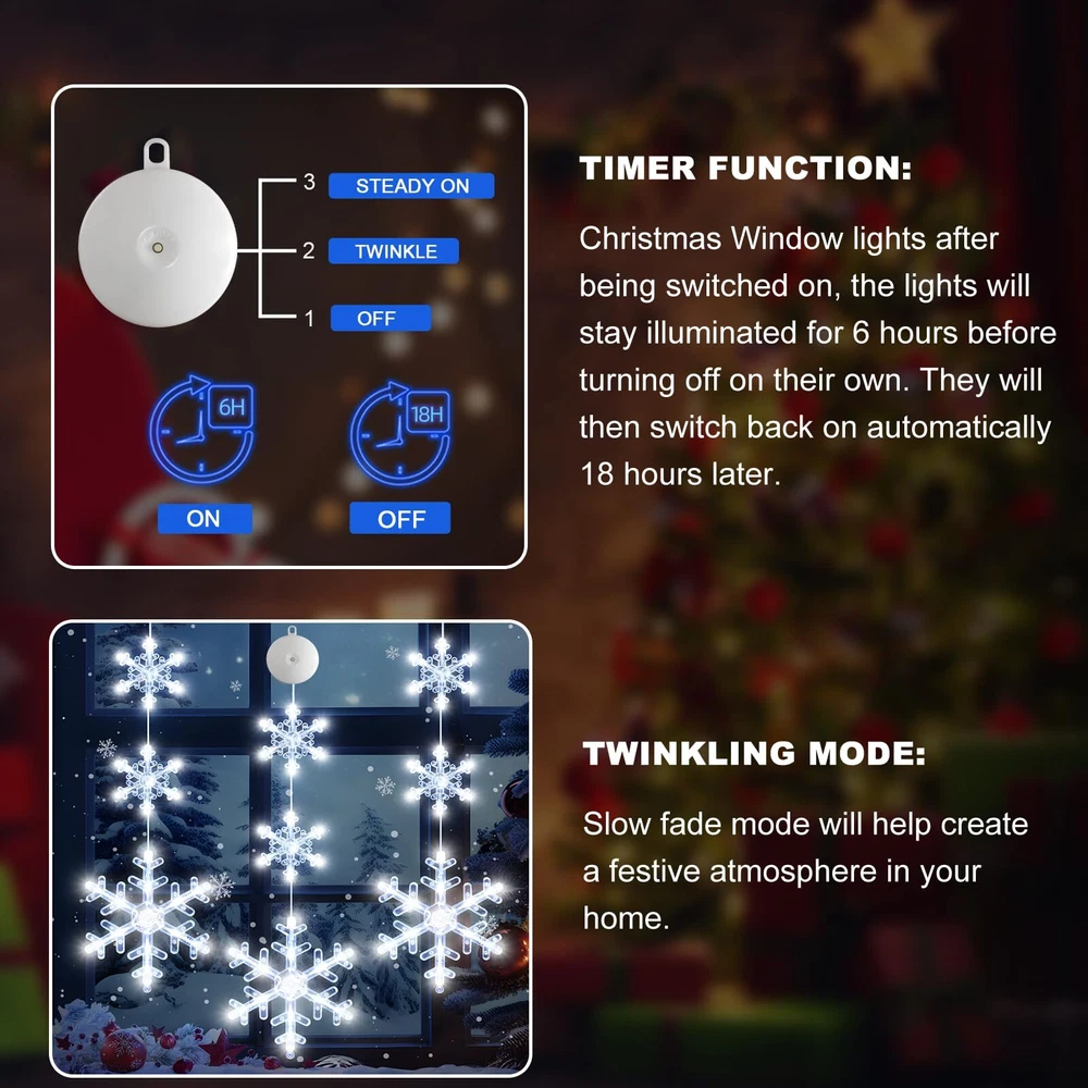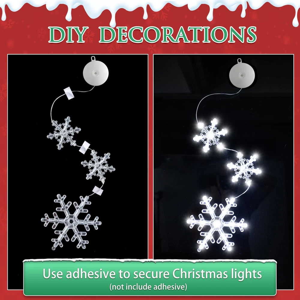 🔔【CHRISTMAS WINDOW LIGHTS】:The snowflake shaped Xmas window lights with suction cup, total 72 white LED bulbs, no harm to wall, You can place the lighted Christmas window lights ornaments wherever you want to brighten your Christmas night for your family. ❄️【TIMER FUNCTION】 The timer function that automatically cycles on for 6 hours and off for 18 hours saves energy, and you don't have to set it up every day. The built-in timer function will automatically activate when you turn on the light. 🌟【EASY TO USE】 : the window decoration light comes with a suction cup, which can be easily installed on glass, gates, cabinets, etc., and the height can be adjusted according to the fixed position and press the ON/OFF button on the battery compartment to turn on/off the lights (Lighting Mode: Steady on, Twinkling).make sure that the suction cup is clean before installation, adding appropriate water to increase the adhesion. 🌟【EASY TO USE】 : the window decoration light comes with a suction cup, which can be easily installed on glass, gates, cabinets, etc., and the height can be adjusted according to the fixed position and press the ON/OFF button on the battery compartment to turn on/off the lights (Lighting Mode: Steady on, Twinkling).make sure that the suction cup is clean before installation, adding appropriate water to increase the adhesion. 🎅【WIDE APPLICATIONS】: Christmas string lights decoration with hooks can be hung on door, porch, hallway, balcony, roof edge, bedroom, mantel, hearth, centerpiece, Christmas tree, garland, garland, railing, handrail, hallway, deck, patio, bar, Bistro, Cafe, Bar, Restaurant, Shopping Mall, Office, Private Car. ⛄【GIFT LIGHTS】: With the Classic Christmas shaped lights, no extra bore and doubt on gift choosing, these reusable festival decor lights will be the first choice as the best wishes for family, friends, relatives or colleagues.