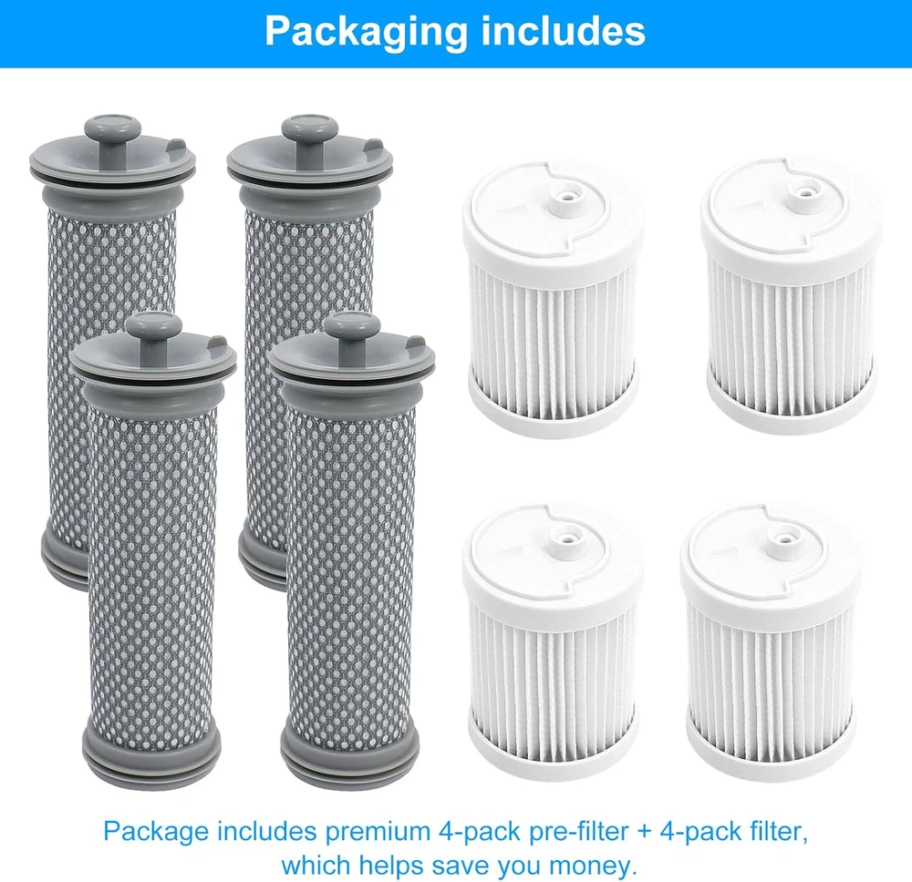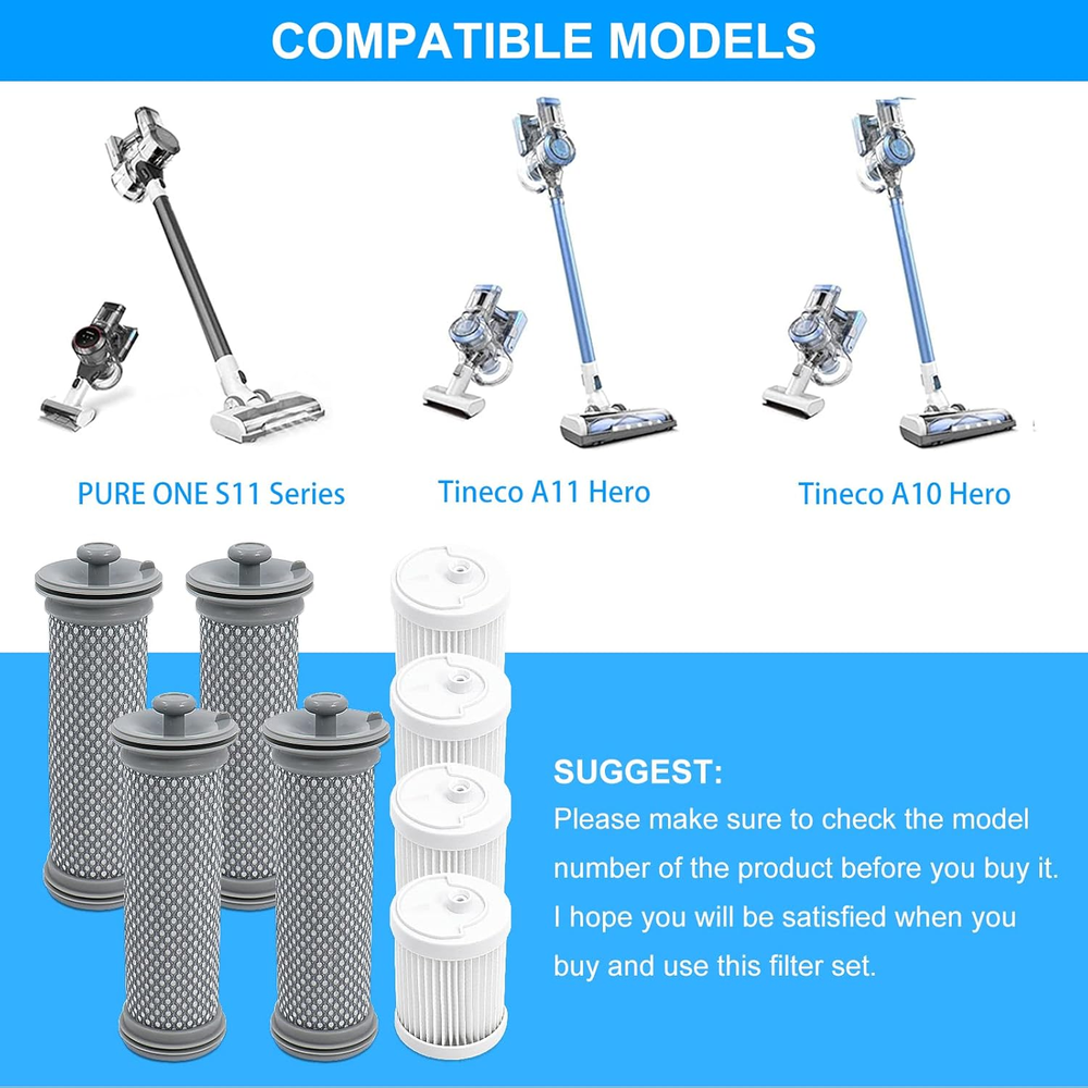 Store New Arrivals Add to Favorite View Feedback Contact Cordless Vacuum Filter Replacement Kit Compatible with Tineco A10/ A11 Hero, A10/A11 Master and PURE ONE S11, PWRHERO11 Snap Cordless Vacuum Cleaner,4 Pre Filters & 4 Filter & 1 Brush Description Item model number A10/A11/S11/S12 Part Number A10/A11/S11/S12 Batteries Required? No Product Dimensions 6"L x 6"W x 2"H Material Microfiber, Plastic Country of Origin China Warranty Description 1 Item Weight 7.4 ounces Batteries Included? No Reusability Reusable Special Features Washable & Reuse, Easy to install Size (4+4) Pack Number Of Pieces 8 【Compatible with Tineco A10 filter】Pre Filter and Post Filter Compatible with Tineco A10 Hero/Master, A11 Hero/Master, A10 dash, A10-03,PURE ONE S11, PWRHERO11 Snap Cordless Vacuum Cleaner, Hero+, Master+, A10/A11 Essential, S11 Series, S12 Pro EX, for Tineco A10 filter. 【Washable & Reuse】These A10 Filter can be washed under running water and must be completely dry before reinstalling. 【High Efficiency Filtration】The A10 filter replacement is made of high quality material, the high quality filters improves the cleaning performance and powerful suction. 【Easy to install】You only need to remove the old filter and install the new A11 A10 filter in place. Recommended to replace the pre filter every 1-3 months, filter every 6 months for continuous cleaning performance. 【Replacement filter kit】Replacement parts include 4 microfiber pre filters and 4 filter and 1 cleaning brush. Product Description Replacement Filter kit Compatible with Tineco A10/A11 Hero, A10/A11 Master PURE ONE S11, PWRHERO11 Snap Cordless Vacuum Cleaner For Tineco Replacement Filter Kit Filter for Tineco A10 Replacement filter kit includes 4 pack pre filters and 4 pack filter for tineco vacuum These A10 filters can be washed under running water but must be completely dry before reinstalling. Recommended to replace the pre filter every 1-3 months, filter every 6 months to get the best performance. SUGGEST: Please make sure to check the model number of the product before you buy it. ABOUT US We offer the best prices around on high quality products. Our E-store includes media such as books, movies, music and games while offering electronics, toys, sporting apparel, clothing, tools, general home, garden items and more. SHIPPING We are always working hard to ensure your package arrives as soon as possible. Please understand that some factors like weather, high postal traffic, and the performance of shipping companies are outside of our control. We offer free shipping to the lower 48 states and ship within 2 business days of payment, usually sooner. We do not accept P.O. Boxes. Please provide a physical address. RETURNS We offer a 30-Day Return Policy on items which you are not completely satisfied with. You have the option for a full-refund or an exchange of the item. No returns are available on items shipped outside of the USA. PAYMENT We accept PayPal. CONTACT US This page content is yet to come Please ad us to your favorite seller and visit again later Thank You CUSTOMER SATISFACTION We try our very best to make sure every customer is completely satisfied. If there's a problem, message us! We're happy to help.