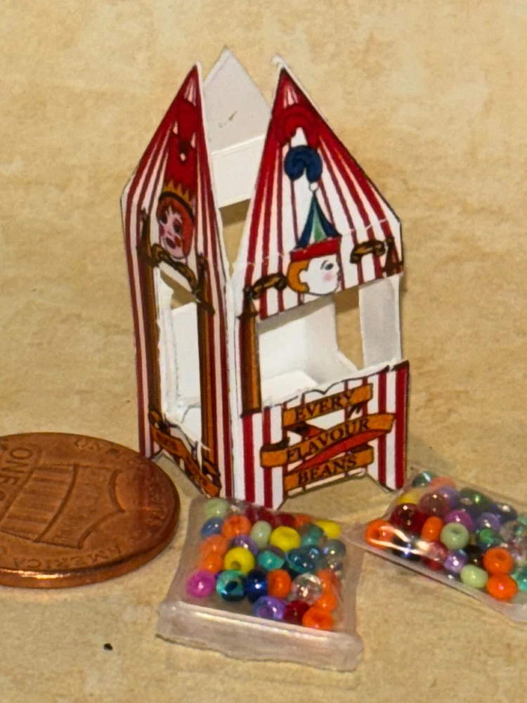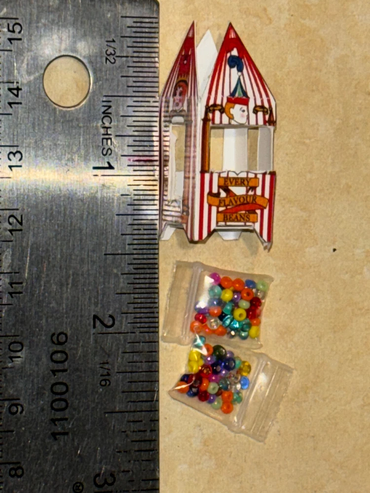 PLEASE contact me before leaving negative feedback . I promise I will make it right. thanks! Miniatures for dollhouse!! Tiny Bertie Botts Beans Box with tiny beans in bags miniature Magic Wizard About 1 1/2" tall. NOT REAL FOOD, DO NOT EAT, made of plastic and paper! Not a toy! Check out my other hand made witch & wizard items ! I combine shipping! If purchasing multiple items... BE SURE TO ADD ITEMS TO YOUR CART, THEN SELECT "Request Total from Seller" at the top BEFORE SENDING PAYMENT so that I can send you a combined shipping invoice. Please note: Usually this only works from a computer