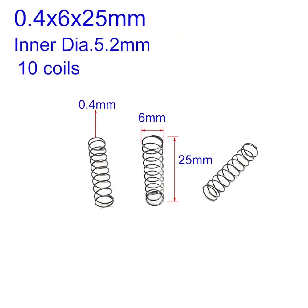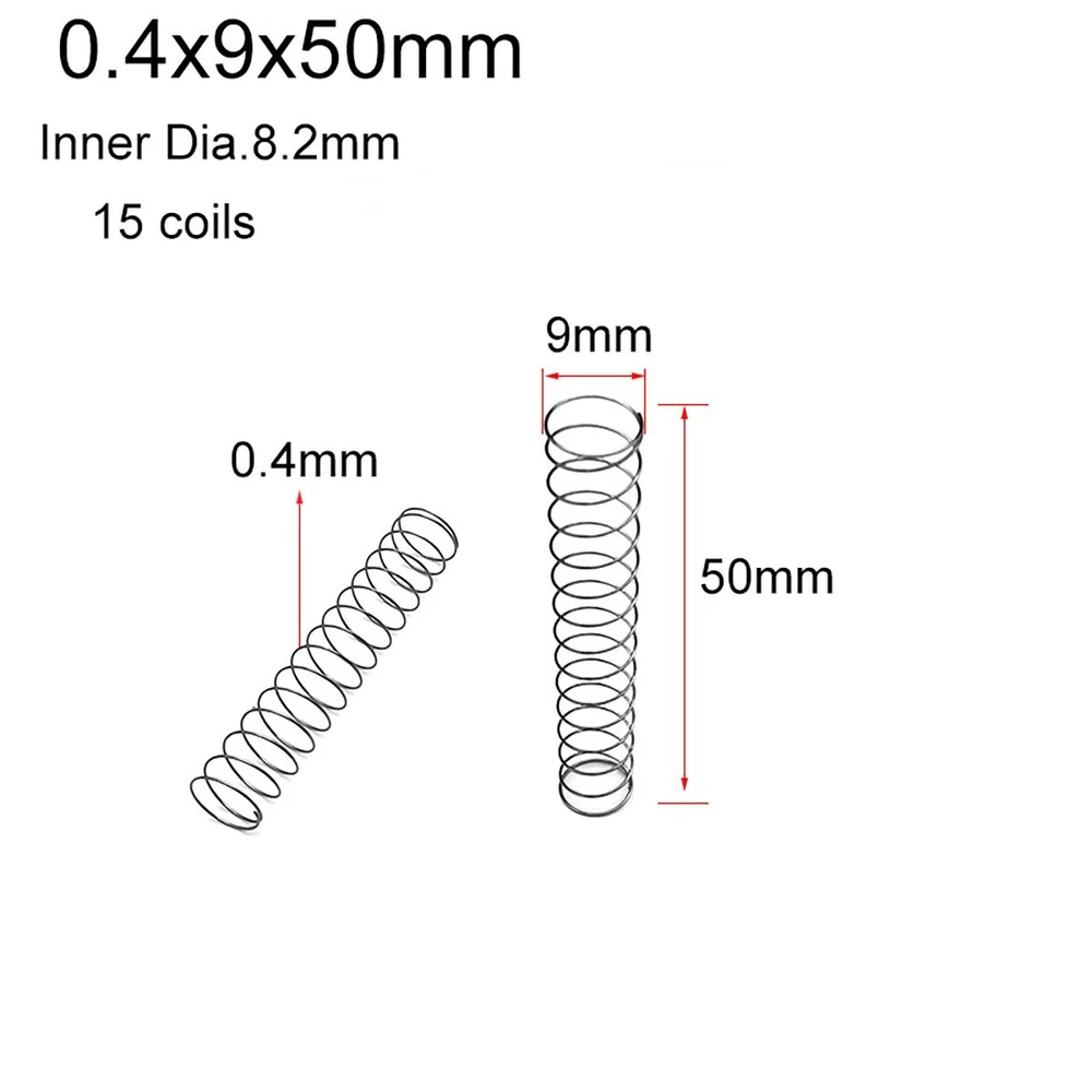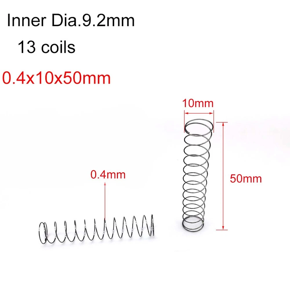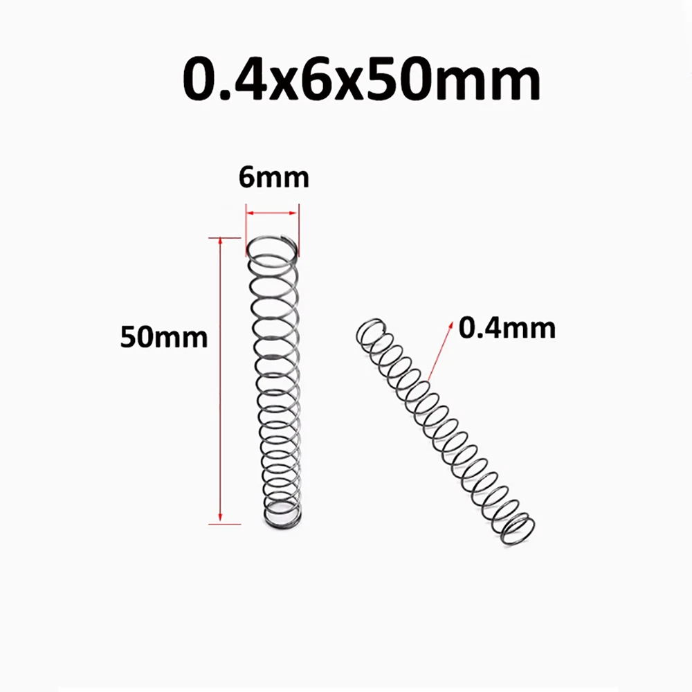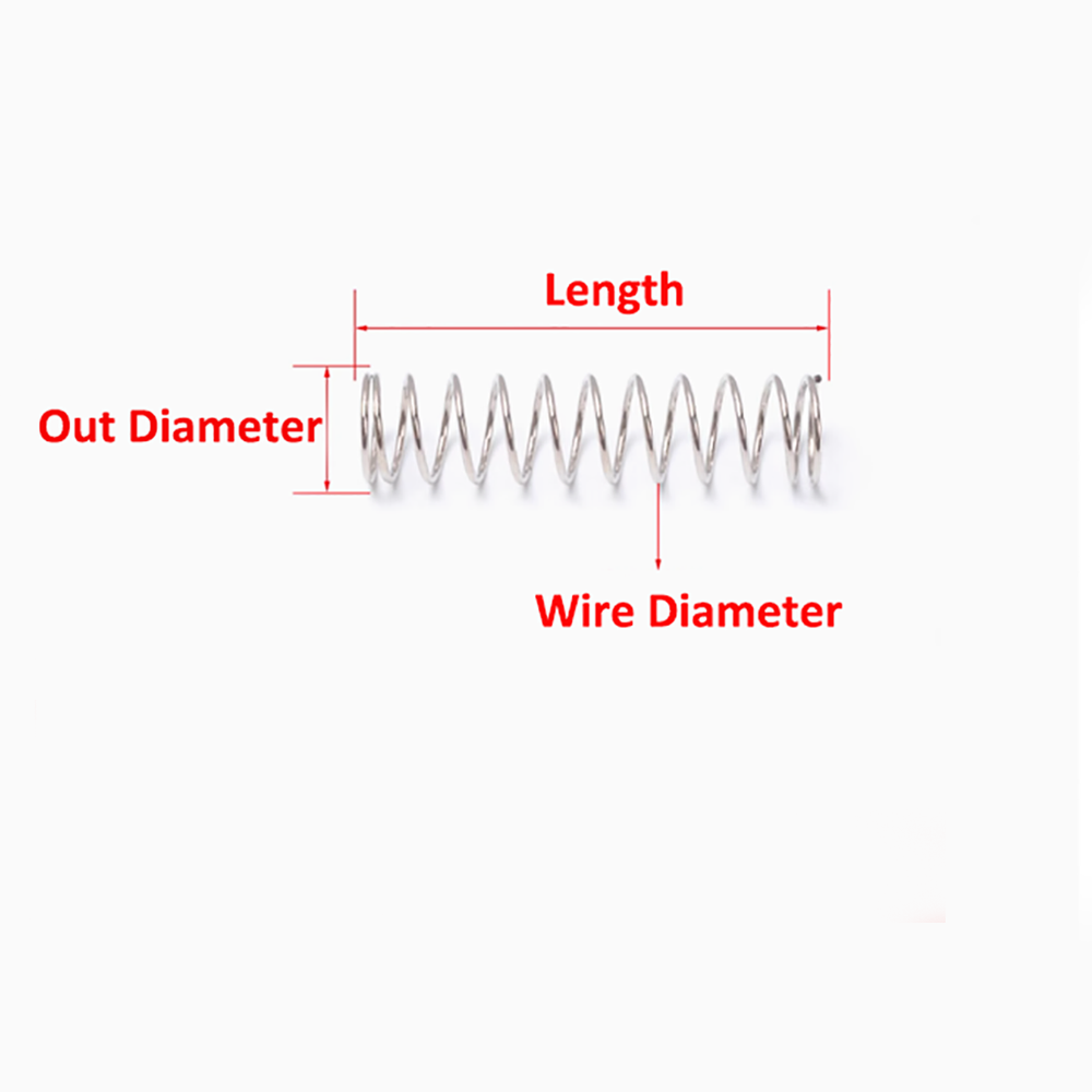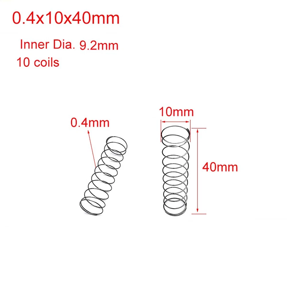 Description Wire Diameter 0.2mm 0.3mm 0.4mm Small Compression Springs Material: Spring Steel Size: Wire Diameter x Out Diameter x Length , Inner Diameter = Out Diameter -2x Wire Diameter . size 0.4*10*50 mm , the wire diameter is 0.4mm, the Out Diameter is 10mm, the length is 50mm, the inner diameter is 9.2mm. Package including: According to you choice.
