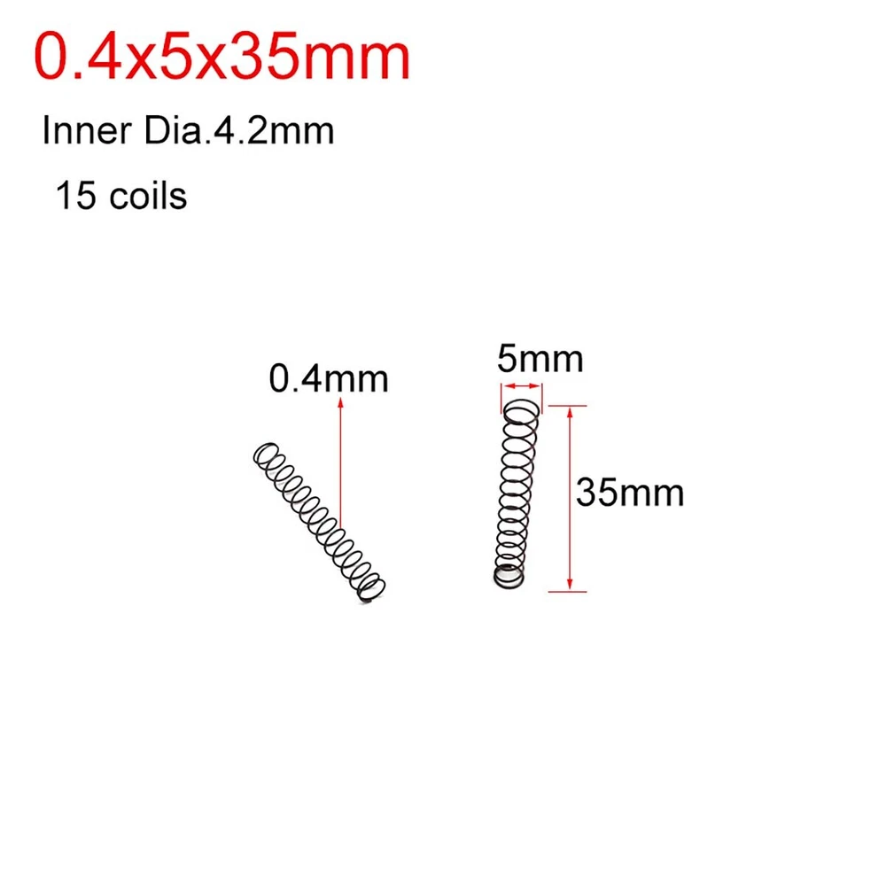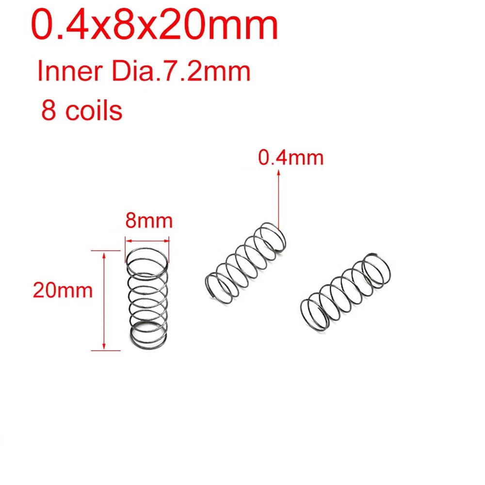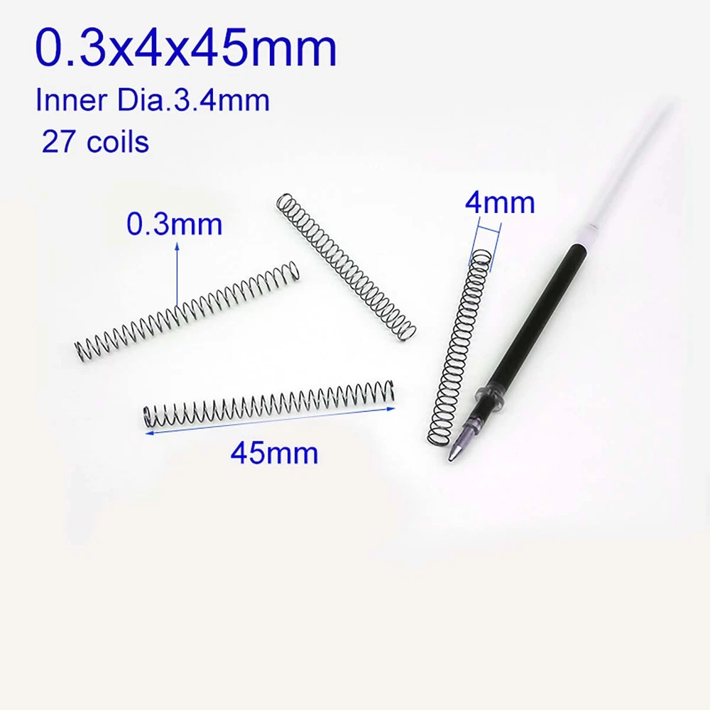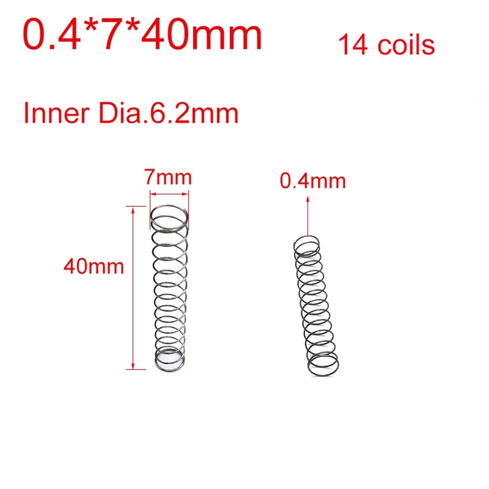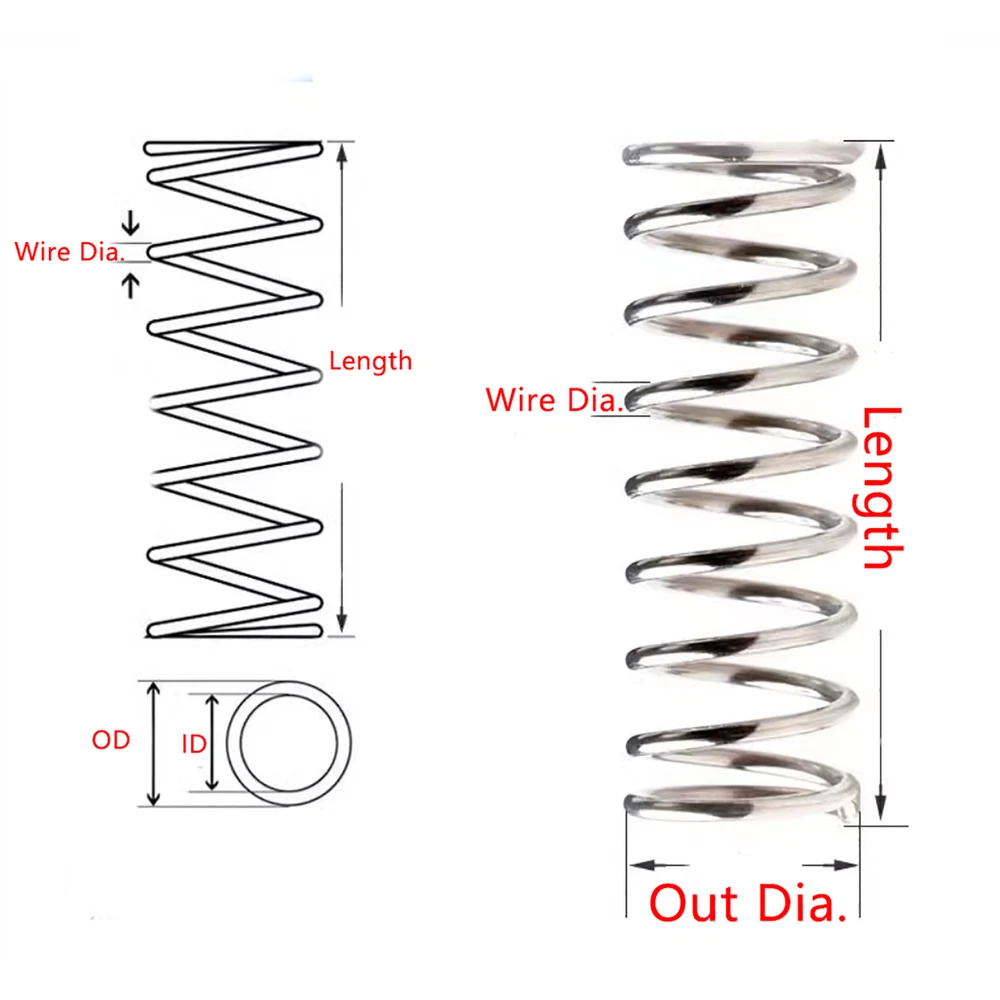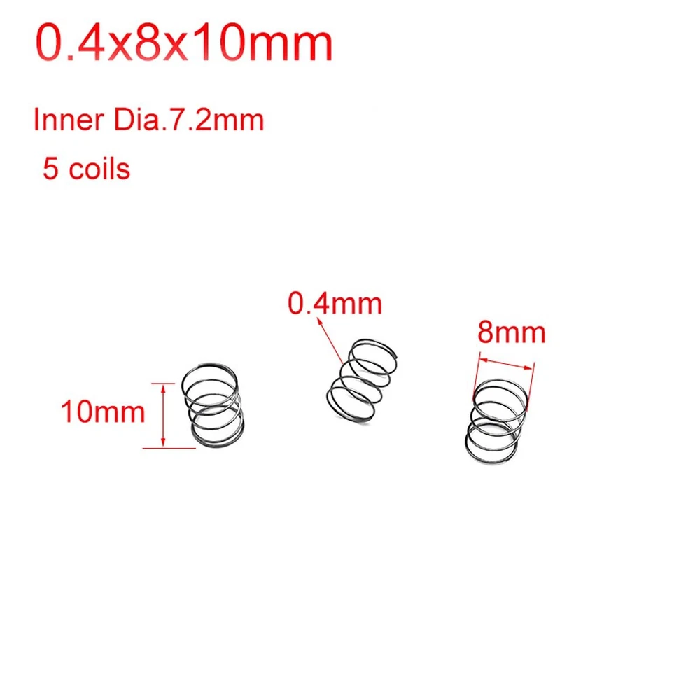 Description Wire Diameter 0.2mm 0.3mm 0.4mm Small Compression Springs Material: Spring Steel Size: Wire Diameter x Out Diameter x Length , Inner Diameter = Out Diameter -2x Wire Diameter . size 0.4*10*50 mm , the wire diameter is 0.4mm, the Out Diameter is 10mm, the length is 50mm, the inner diameter is 9.2mm. Package including: According to you choice.