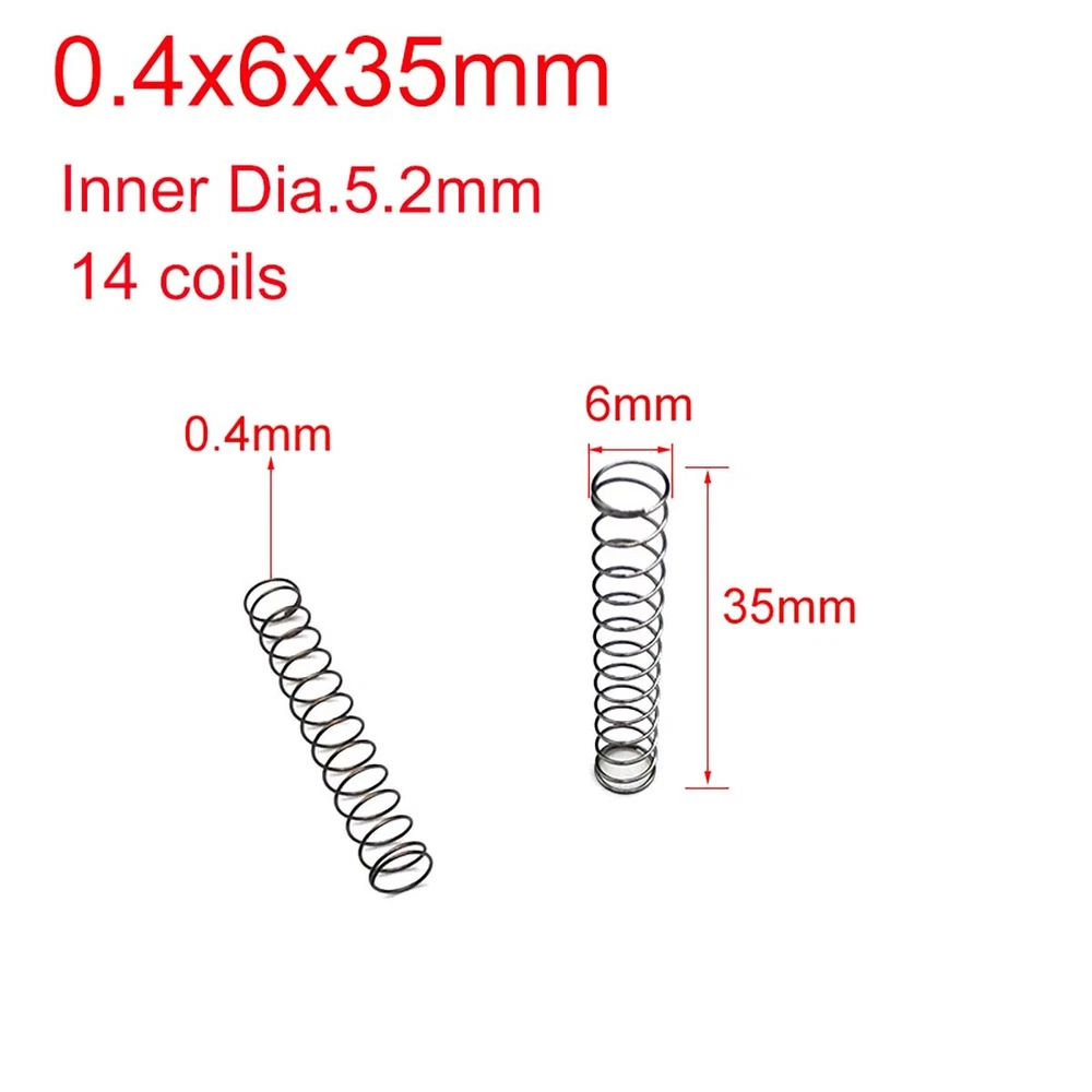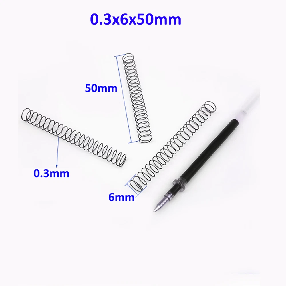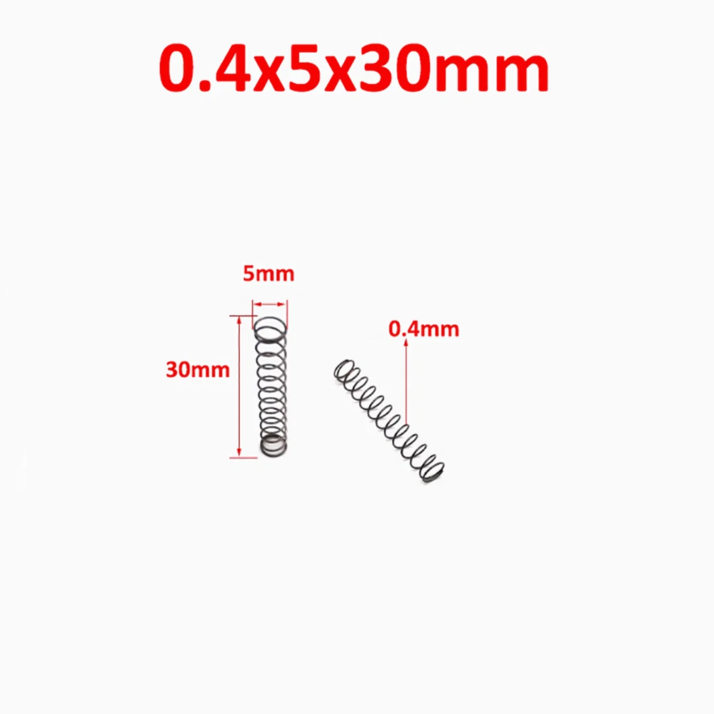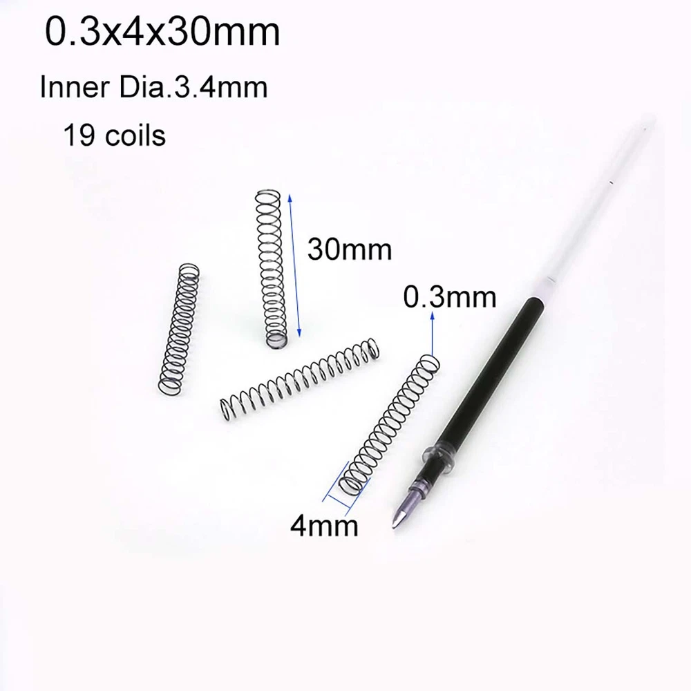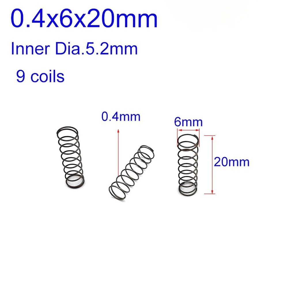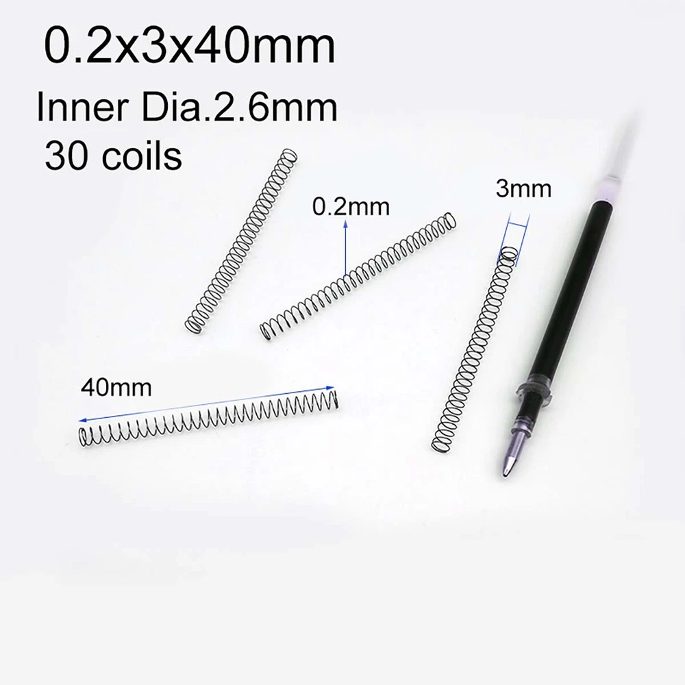 Description Wire Diameter 0.2mm 0.3mm 0.4mm Small Compression Springs Material: Spring Steel Size: Wire Diameter x Out Diameter x Length , Inner Diameter = Out Diameter -2x Wire Diameter . size 0.4*10*50 mm , the wire diameter is 0.4mm, the Out Diameter is 10mm, the length is 50mm, the inner diameter is 9.2mm. Package including: According to you choice.