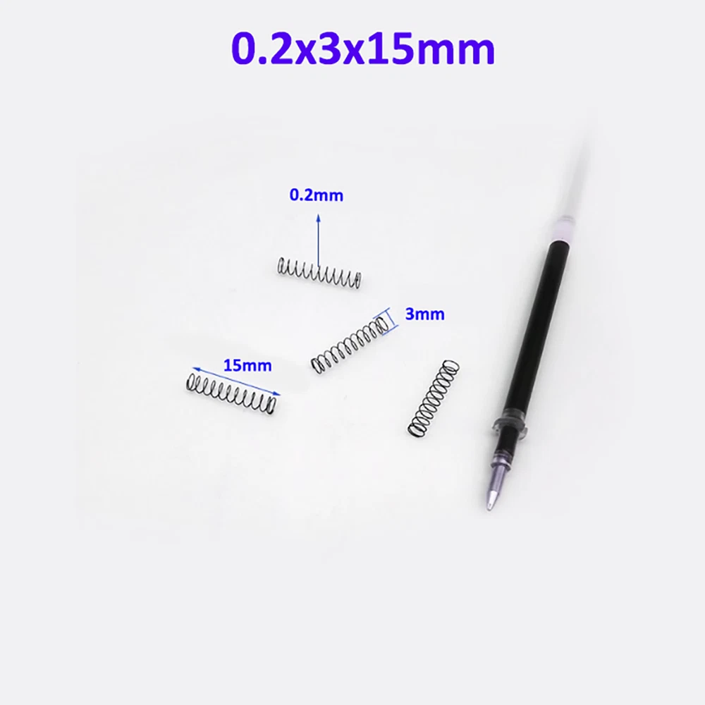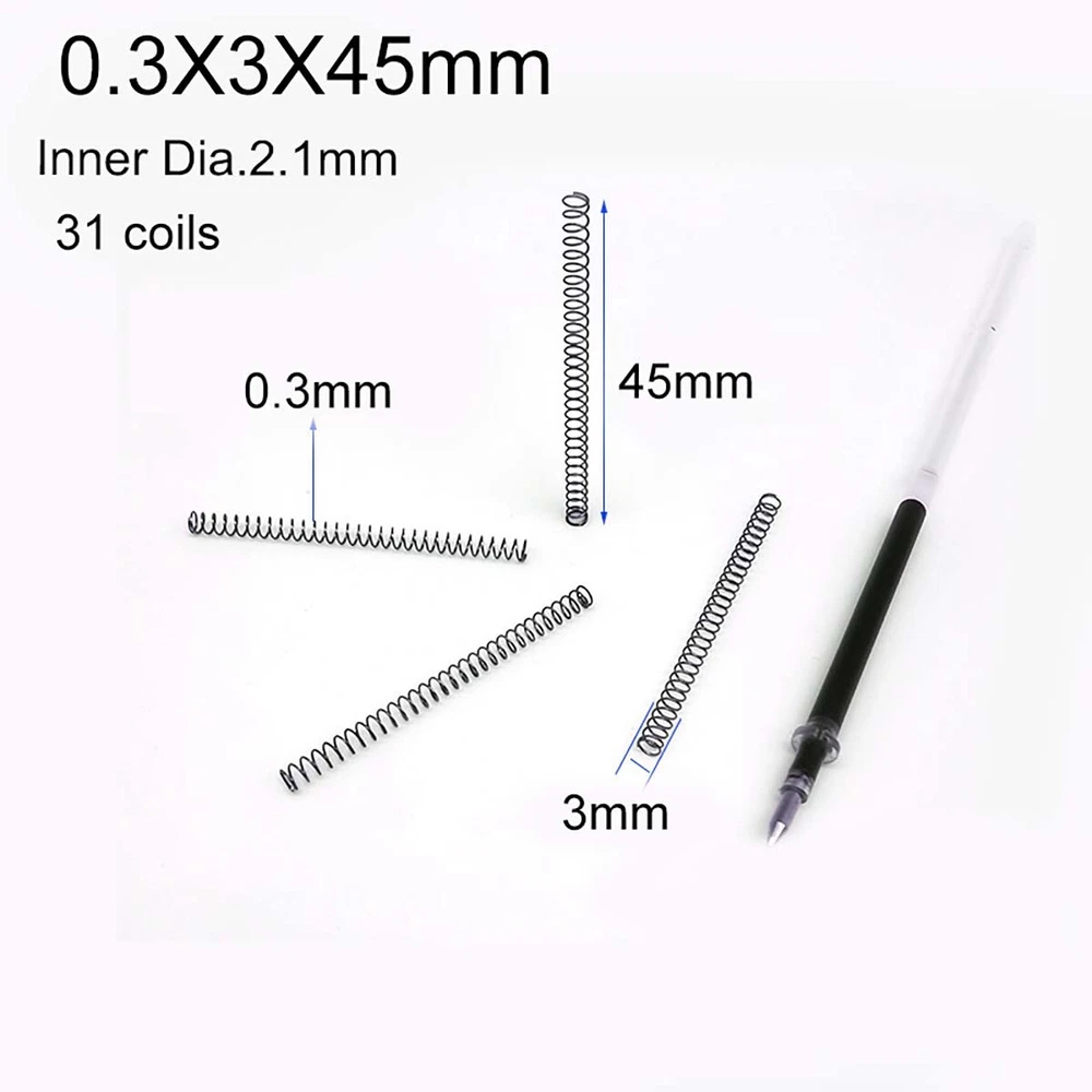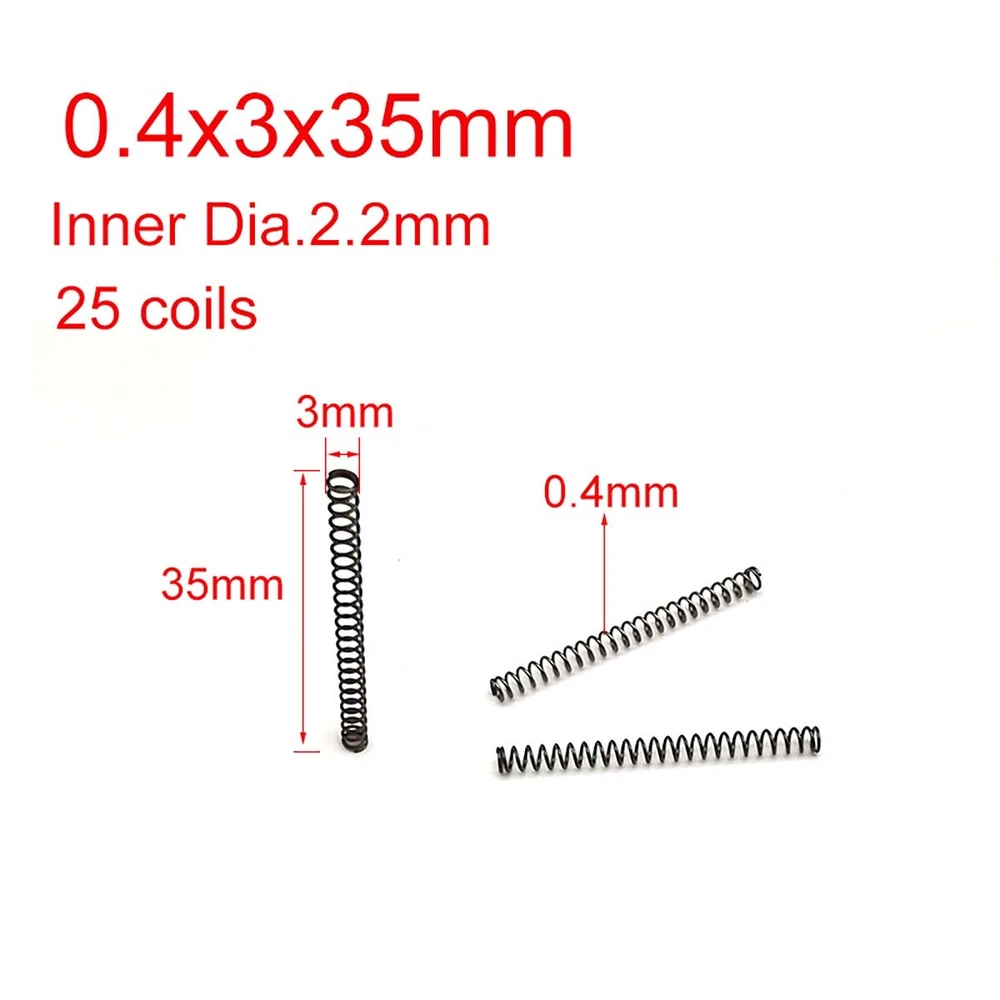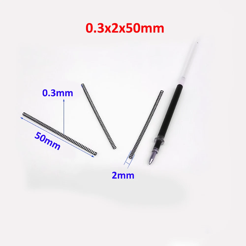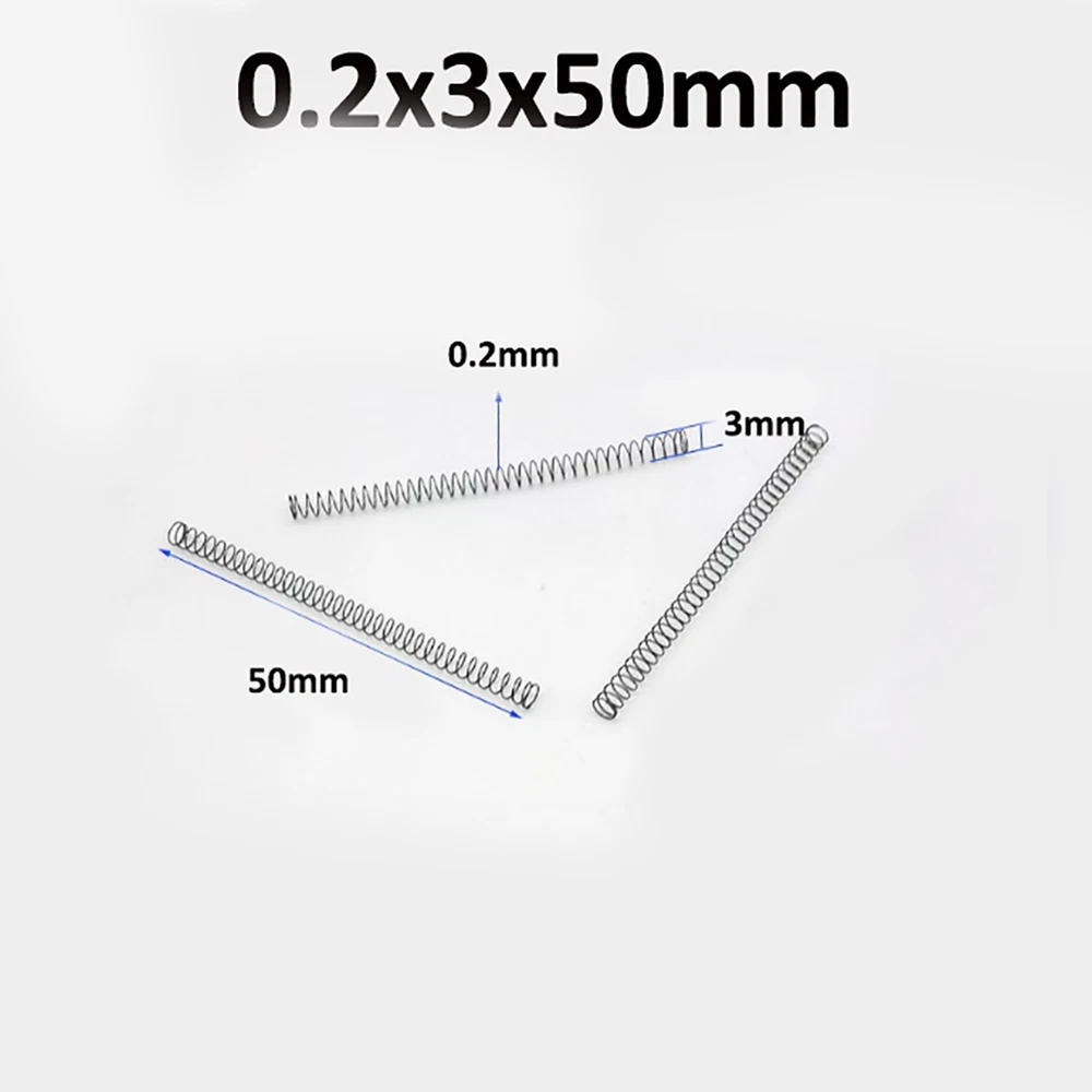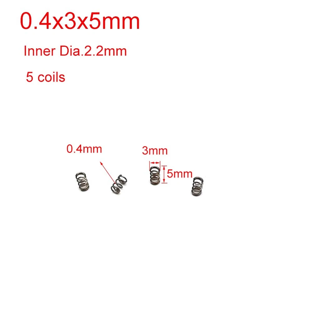 Description Wire Diameter 0.2mm 0.3mm 0.4mm Small Compression Springs Material: Spring Steel Size: Wire Diameter x Out Diameter x Length , Inner Diameter = Out Diameter -2x Wire Diameter . size 0.4*10*50 mm , the wire diameter is 0.4mm, the Out Diameter is 10mm, the length is 50mm, the inner diameter is 9.2mm. Package including: According to you choice.