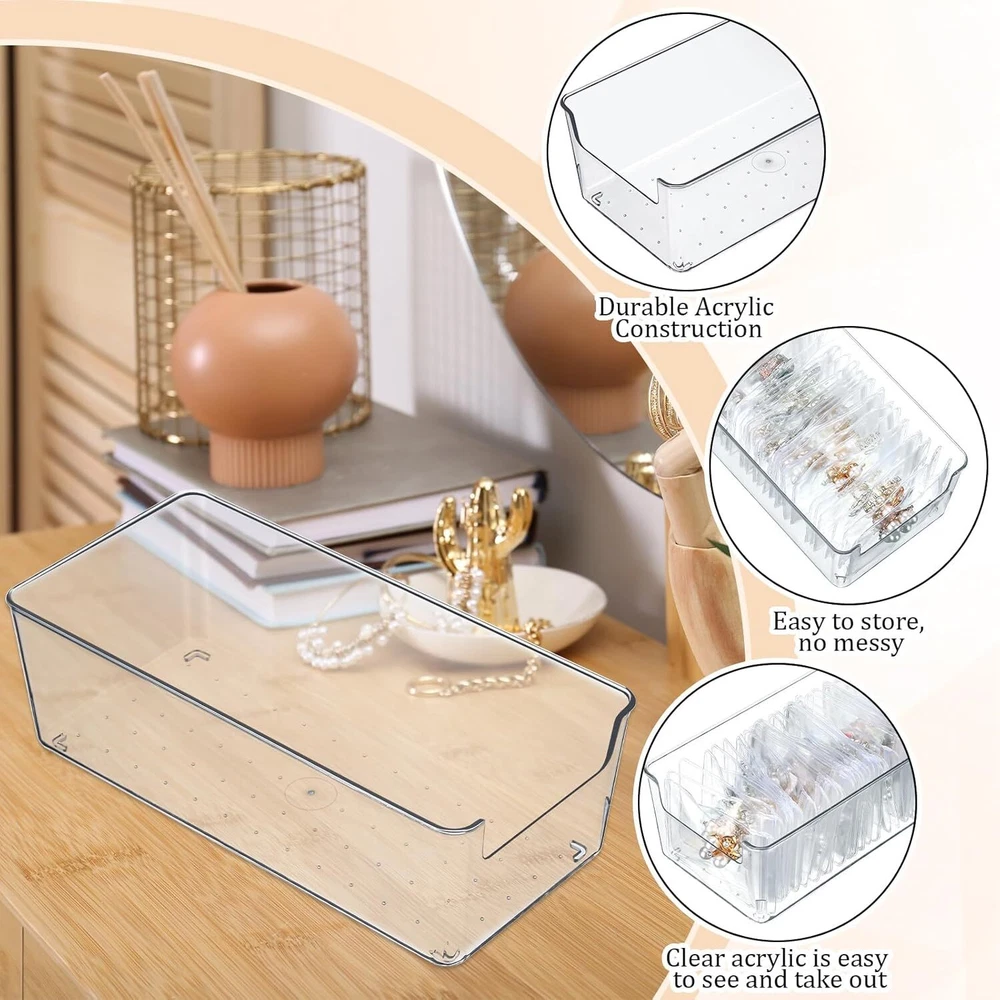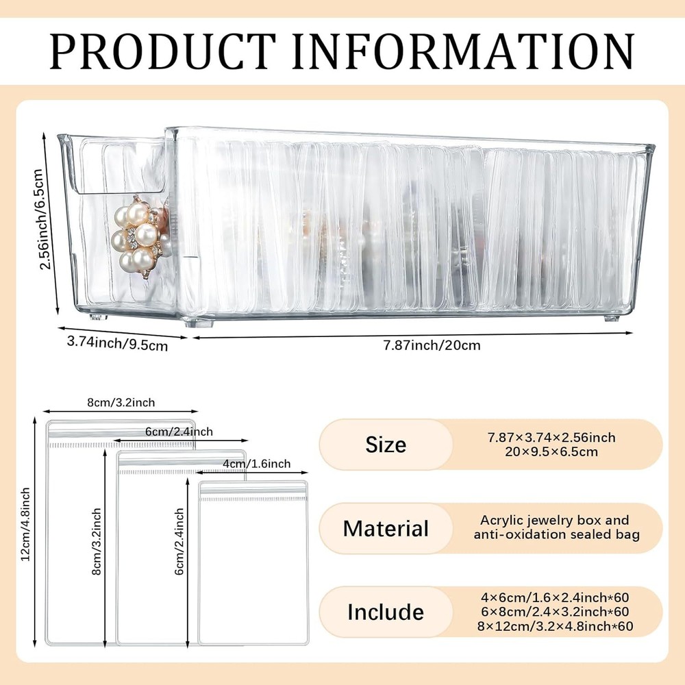 Tioncy 6 Pack Acrylic Jewelry Box Organizer Clear Jewelry Drawer Organizer Holder with 180 Portable PVC Jewelry Anti Tarnish Zipper Bags Travel Jewelry Case for Packaging Earrings Rings Necklaces Product Details Brand: Tioncy Style: Modern Special Feature: Lightweight Product Dimensions: 11.02"D x 7.87"W x 4.72"H Shape: Rectangular Occasion: Valentine's Day Number of Items: 186 Manufacturer: Tioncy Part Number: BOO-Tioncy-5251 Item Weight: 2.2 pounds Country of Origin: China Item model number: BOO5251 Item Package Quantity: 186 Special Features: Lightweight Included Components: 6 x Acrylic jewelry box organizer, 180 x Jewelry anti tarnish zipper bags Batteries Required?: No Brand: Tioncy Style: Modern Special Feature: Lightweight Product Dimensions: 11.02"D x 7.87"W x 4.72"H Shape: Rectangular Occasion: Valentine's Day Number of Items: 186 Manufacturer: Tioncy Sufficient Quantity: our set contains 6 acrylic jewelry box organizer and 180 pcs anti oxidation jewelry bags in 3 different sizes, 60 pcs in each size, suitable for storing earrings, necklaces and other jewelry Secure and Organized Storage: our clear jewelry drawer organizer measures 7.87 X 3.74 X 2.56 inch/ 20 X 9.5 X 6.5 cm, ensuring your jewelry stays neatly organized and easily accessible. No more tangled necklaces or misplaced earrings Durable Acrylic Construction: made of acrylic, our clear jewelry storage box is durable and can provide reliable protection for your precious jewelry 180 PVC Bags: jewelry bags are durable. Their thick, transparent material is tear resistant, seals securely to prevent jewelry from oxidation, and comes in three different sizes: 4 X 6 cm/ 1.6 X 2.4 inch, 6 X 8 cm/ 2.4 X 3.2 inch, 8 X 12 cm/ 3.2 X 4.8 inch Suitable for Travel: our transparent jewelry storage box is a suitable size and weighs 80 g, it can be nice placed in a drawer, or you can store your jewelry in the PVC jewelry bag and keep it ready for use at any time Features: Each acrylic jewelry box displays your jewelry in a neat and stylish way. No more mess, damage or misplacement. Nice gift for birthdays, Valentine's Day, Mother's Day, Christmas, weddings, etc., gift for ladies of all ages The clear color of the acrylic jewelry box organizer makes it easy for you to view your jewelry items at once and choose the nice piece for your outfit without having to search and rummage through Specifications: Material: acrylic, PVC Color: clear Size: Acrylic jewelry box organizer: 7.87 X 3.74 X 2.56 inch / 20 X 9.5 X 6.5 cm Weight: 80 g Jewelry bags: 4 X 6 cm/ 1.6 X 2.4 inch, 6 X 8 cm/ 2.4 X 3.2 inch, 8 X 12 cm/ 3.2 X 4.8 inch Package includes: 6 x Acrylic jewelry box organizer 180 x Jewelry anti tarnish zipper bags Notes: Manual measurement, please allow slight errors on size. The color may exist a slight difference due to different screen displays. If you use our products with your own necklace or pendant, please check whether the product is in good condition before use to avoid unnecessary loss of personal property.