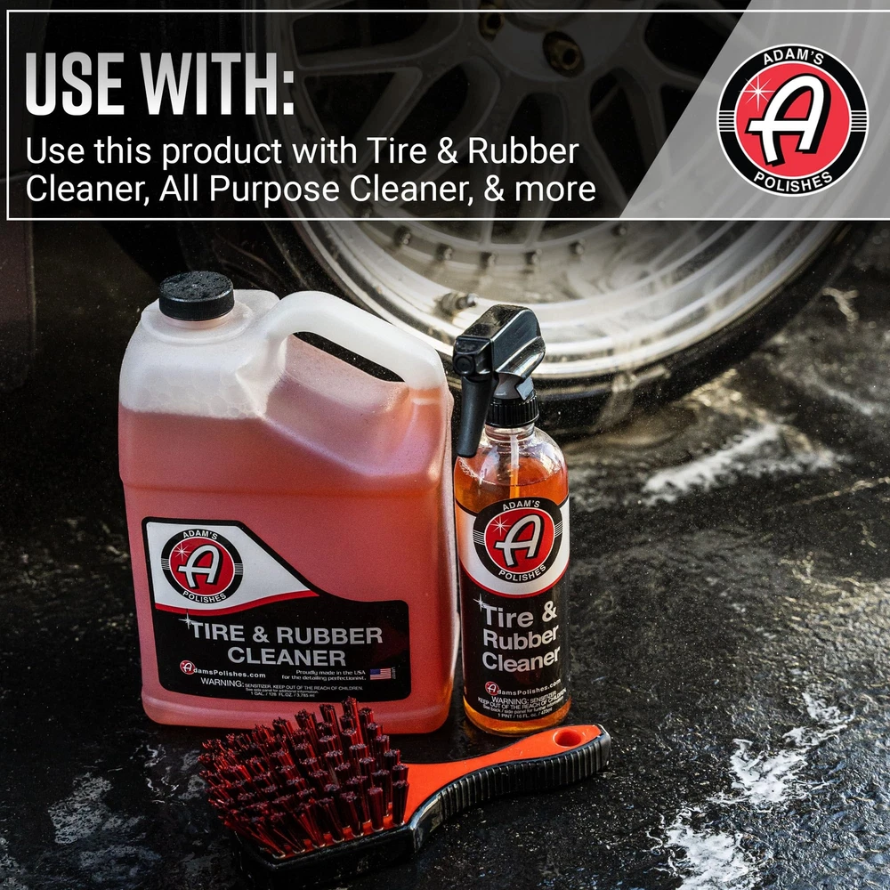 ✅ HIGH-QUALITY DETAILING BRUSH – At Adam’s, we are constantly testing, tweaking, and improving our products. Every detail in this custom crafted tire detailing brush was carefully assessed - the grip of the handle, soft chemical resistant bristles and even the rubberized head. This brush was crafted for comfort, effectiveness, and maximum cleaning power every wheel car wash! ✅ SHORT HANDLE SCRUB BRUSH – Adam’s Tire Brush was made to withstand some of the toughest detailing or cleaning jobs. This detailing tool is a great addition to your car wash kit or your car cleaning chemicals and accessories. Every time you clean your vehicle, boat, bike, motorcycle RV, car, household, and garage, our brush will effectively prove its versatility and durability. ✅ STIFF, DURABLE & CHEMICAL RESISTANT BRISTLES FOR EFFECTIVE SCRUBBING – Adam’s Tire Brush was constructed to be used with Adam’s Tire & Rubber Cleaner or All-Purpose Cleaner. To thoroughly remove antiozonants, mold release agents, or general oxidation, utilize this brush with Adam’s Tire and Rubber Cleaner to scrub the grime away and watch how your tire becomes an orange/brown color as you restore it. ✅ USE WITH ADAM’S TIRE RUBBER CLEANER, WHEEL AND TIRE CLEANER or ALL PURPOSE CLEANER - Adam’s has several chemical cleaning supplies that can be paired with our Tire Brush for use on tires, rubber floor mats, or plastic floor liners. Although this brush can be used like a wheel brush, we suggest not using it as a wheel cleaning brush as the rigid bristles increase potential scratching on your wheel finish. To clean the face of your wheels, use Adam’s Wheel Scrub brush and Adam’s Wheel Woolie! ✅ 110% SATISFACTION GUARANTEE & USA MADE - At Adam’s, we strive to bring the BEST detailing tools, kits, waxes, sealants, ceramic coatings, car accessories, microfiber towels, wash mitts, sponges, applicators and other high-quality car cleaning products to our customers. If you don’t agree & are not satisfied, let us know and we’ll do everything we can to make it right!