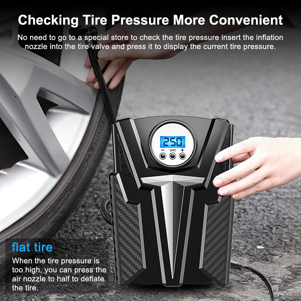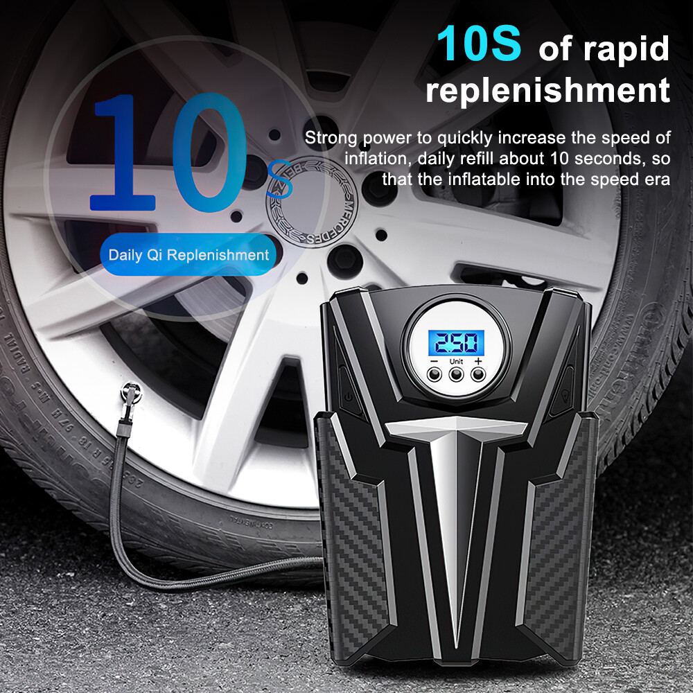 Specification: Material: ABS Operating voltage: 12V Rated input: 12V 2A Cylinder diameter: 22mm Rated power: 60W Pressure range: 3-150PSI Accuracy: ±1.5psi Air volume: 25L/min Continuous working time: 15min Time: Inflation time: 8-9min Power cord: 3m Input interface: DV 12V Usage time: 15min Hose length: 520mm±10mm Operating temperature: -20℃~60℃ Size: 19*12.5*7.5cm Package Included: 1 x Inflator pump 3 x Inflator nozzle 1 x Cigarette lighter 1 x Storage bag 1 x User manual