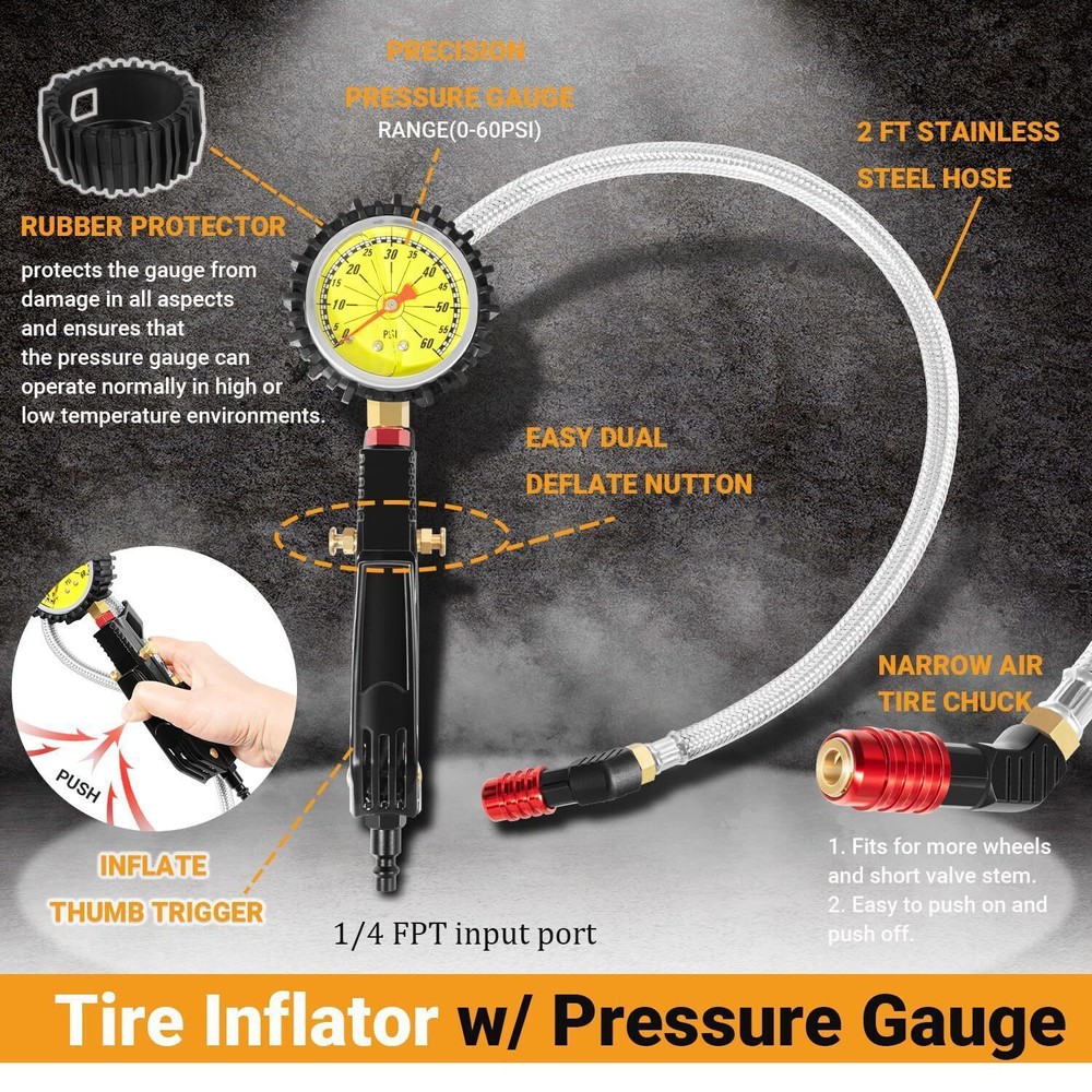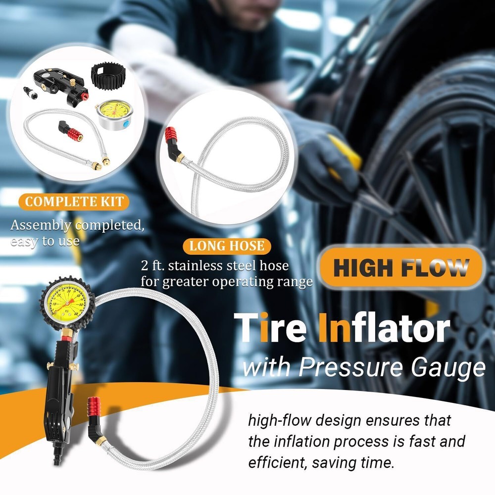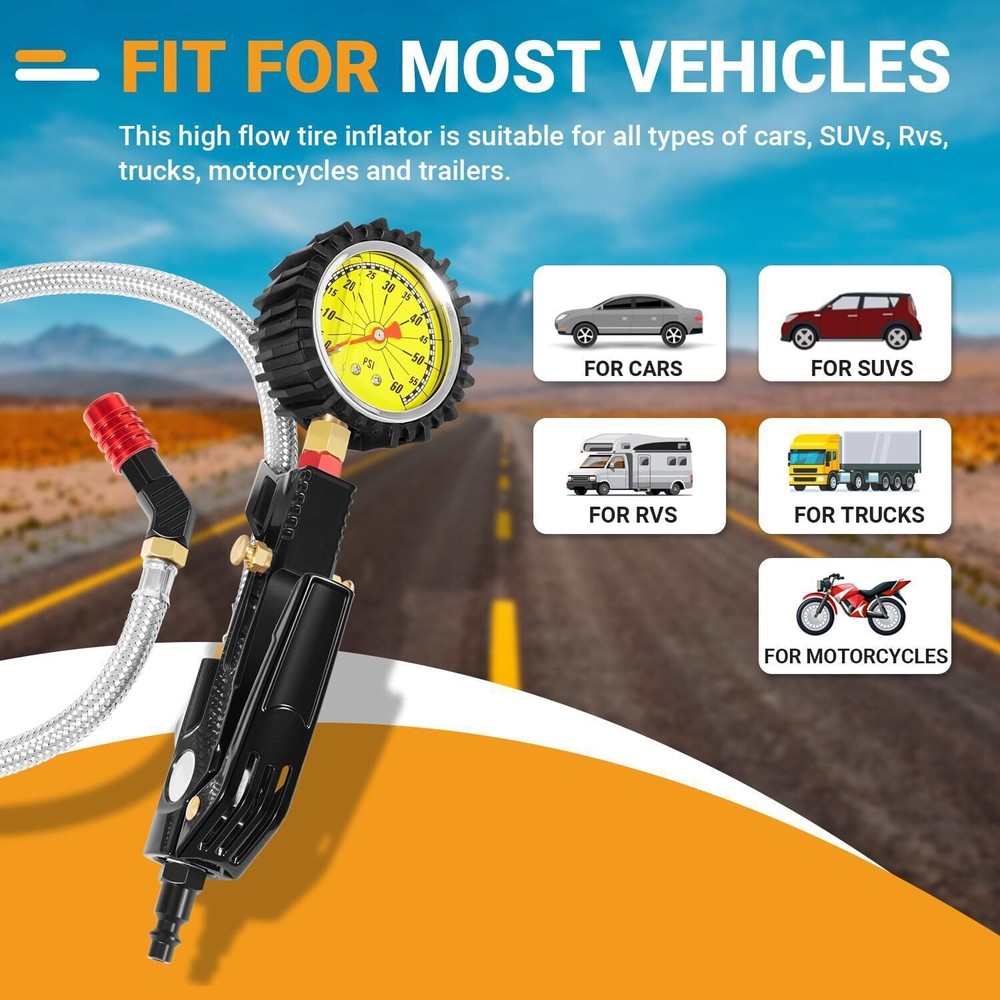 Tire Inflator Kit with Pressure Gauge Lock On Air Chuck Long Hose for Cars SUVs Fitment: With an accurate measuring range of 60psi, this high flow tire inflator is suitable for all types of cars, SUVs, trucks, motorcycles and trailers. High strength lock on chuck enhance grip strength for stability, working for short valve stems. The high-flow design ensures that the inflation process is fast and efficient, saving time Features: 1) Equipped with a high precision pressure gauge to ensure accurate pressure readings. Easy to monitor the tire pressure while operating, avoiding the safety of driving due to too high or too low pressure, and ensuring that the tires are always in the best condition. Also includes a rubber protector, which protects the gauge from damage in all aspects and ensures that the pressure gauge can operate normally in high or low temperature environments 2) This tire inflator with pressure gauge integrates tire pressure checking, inflation and deflation functions, and is able to meet a wide range of tire maintenance needs. Whether it is adjusting tire pressure, inflating or deflating, it can be easily done with simple and convenient operation 3) Manufactured from high-quality steel and brass for superior durability and corrosion resistance, ensuring long-lasting performance in any environment. The tire inflator feature a secure, leak-proof design with precise brass fitting and sealing capabilities, ensuring reliable connections and preventing air leakage under high pressure Package included: tire inflator with pressure gauge Payment Shipping Return & Warranty Leave feedback Contact us Payment 1.We accept PayPal payment and many other payments. Items will be shipped within 1 business day of receiving full payment. Shipping 1.All items will be shipped out in 1 business day,no expedited service available. 2.Our items will be delivered within 4-6 business days. 3.We have multiple warehouses in US, and will choose the nearest one for shipping, according to your address and our inventory Return & Warranty 1. 60 Days Free Returns, please notify us within 60 days after you've received your purchased item. 2. All return requests must be submitted through your eBay account. 3. Return shipping shall be the responsibility of the buyer. We pay the shipping when it is our fault. 4. Items to be returned must be in resalable condition. 5. All returns are for refund ONLY. No exchange accepted. Leave feedback 1.If you are not satisfied for any reasons, please do not be so quick to leave negative/neutral feedback. We work hard to make sure EVERY CUSTOMER 100% SATISFIED and resolve any problems for you and always leave positive feedback to all our customers. 2.If you are satisfied with the product you received, please kindly leave us a positive feedback and 5 scores DSR. Thanks! Contact us 1.Any Questions,Just feel free to contact us on eBay.We will reply you in 1-2 business day.