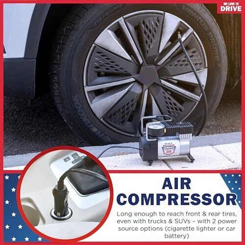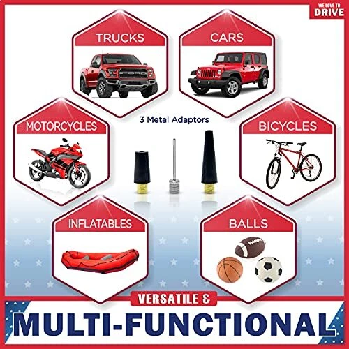 Return Policy Fast Delivery Trusted seller Tire Inflator Portable Air Compressor For Car Tires & Inflatables, 12V DC One Cylinder Air Pump For Emergency Kit with 150 PSI Pressure Gauge, Adaptors, Hose, Car Plug, Clip Connectors & Carry Bag Product Description Convenient Inflation – Keep your WE LOVE TO DRIVE 12 volt air compressor portable air pump and tire repair kit in your trunk for emergencies or regular maintenance. Carry everything you need in 1 included carrying bag. Easy Function – Connect your electric air pump to your car’s 12V accessory socket or battery terminals. (For use when the cigarette lighter socket is fused to below 15V). Easily fill all 2- 4 of your tires with 3 ft. of flexible Black hosing and built-in air tire gauge pressure. Complete Tire Repair Kit – Avoid getting stranded or having to use a donut spare thanks to your tire plug kit. Use a range of purpose-built tools to shape, fill, and seal small punctures wver you are. COMPACT FAST WORKING POWERHOUSE PRODUCT boasts a powerful direct drive motor, producing 150 PSI max tire pressure and an impressive 35 L/min Air Flow. 180W pump inflates a medium-sized car tire from flat to 35 PSI in a mere 2-3 minutes And all this in an unassumingly compact 6.2” x 4.5” unit that is hassle-free, perfectly tires inflator heavy duty portable, and smart to store. Adaptable Air – Use your 12V air compressor kit to inflate a variety of tires and sporting equipment. Compress air up to 150 PSI and channel it through your choice of 3 different threaded adaptors. Reaches front and back tires of all cars, trucks, and SUVs. With the 3 inflation tips included, the compressor will also inflate bikes, motorcycles, balls, air mattresses, sports equipment, and other inflatables. Our Promise to You – Drive with peace of mind thanks to your travel portable air compressor for car tires and excellent customer service. Your air-and-repair kit is backed by our commitment to your safe, successful travels. Shipping Returns Payment Shipping Shipping is FREE to all addresses other than APO/PO boxes in the lower 48 states. All our stock ships from US-based warehouses. Shipped via USPS or UPS (depending on location and package weight) Unless stated otherwise, all orders will ship within 24-72 hours of your payment being processed. Check our feedback to see the great reviews of FAST shipping we offer. Returns Seller does not accept returns Payment We currently accept payment via eBay managed payments only. Once payment is cleared, we will dispatch your shipment within 1-3 business days. Please refer to the "Shipping" tab for more information regarding shipping speed to your destination.