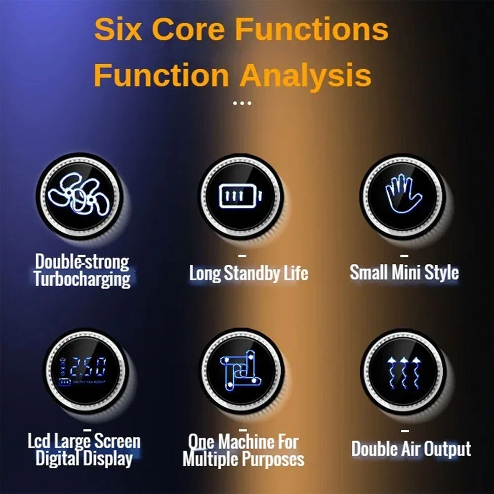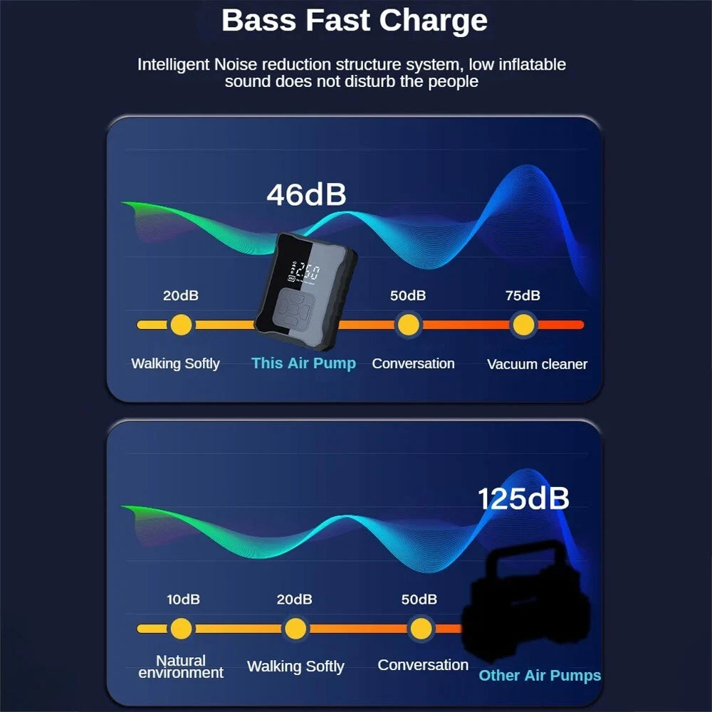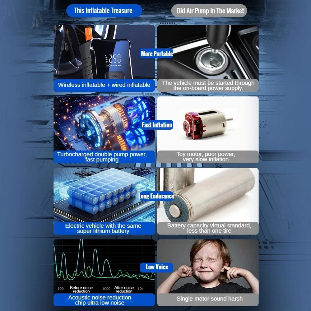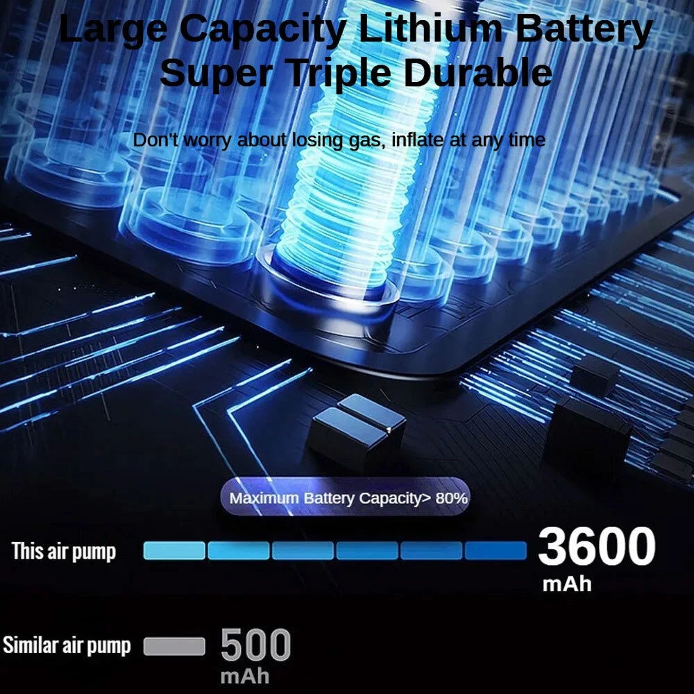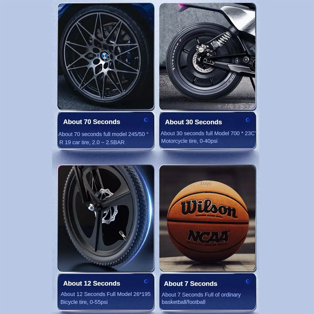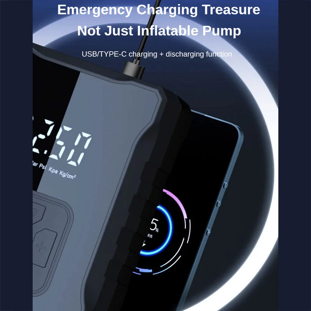 Features : QUICK ACCURATE : Th is a portable tire inflator for car, trucks, SUVs, motorcycles, and bicycles. Quickly inflate your vehicle's tires in just minutes with precision accuracy up to 150 PSI. Small and compact car air pump that fits in your glove box or trunk. FAST INFLATING SPEED and EASY TO USE : Simply plug this auto tire air compressor into the 12V power outlet and attach the hose to the tire you wish to inflate. You can just flip the switch, then shut it off once the tire pressure hits your desired number. 11.5 FEET-LONG RANGE : Besides, the 11.5 ft power cable is long enough to reach all the tires easily. A long cable eliminates needs to unplug it each time. 4 Extra Nozzles : Our tire pump has 4 extra nozzles which allow to inflate all types of tire, such as car, motor, ATV, or midsize SUV, sports equipment and inflatables adaptors included. Perfect for your inflatable boats, balls and other inflatables. PORTABLE & CONVENIENT : The portable air pump with a compact design that measures only 12.1*8.7*4.9cm, much smaller and lighter than a conventional air pump. Powered by rechargeable lithium batteries. You could put it in your pocket, backpack, or car to help you anytime and anywhere.This portable electric pump will get you covered if you are in an emergency! The built-in 2×1800 mAh lithium battery can be used as a power bank for IOS and Android devices. Specifications: Material: ABS Inflation Pressure Range: 0.2-10.3Bar / 3-150PSI. Cylinder Inner Diameter: 17mm Operating Current: ≤6A Working Voltage: 7.4V Power: 90W Type-C Input: 5V/1A. USB Output: 5V/1A Battery: Built-in lithium battery 1800mAh*2 Air Volume: about 18L/MIN. Inflating Efficiency: 195/65/R15 tires, cigarette lighter ≤12min, lithium Battery ≤11min. Life of the whole machine: ≥150 times (195/65/R15 tires. 0-36PSI, every cycle interval is 5 minutes) Measurement Error: ±1psi Working Temperature: -20℃ ~ 60℃ Size: 12.1 * 8.7 * 4.9cm. Certificate: CE/FCC/ROHS/UL/MSDS Applicable Models: Cars, electric cars, motorcycles, bicycles, ball games, etc. Product Lis t : 1 x Inflatable Pump 1 x Cigar Lighter 4 x Inflatable Nozzle 1 x Inflatable Tube 1 x Type-C Charging Cable 1 x Flannel Bag 1 x Instruction Manual