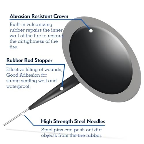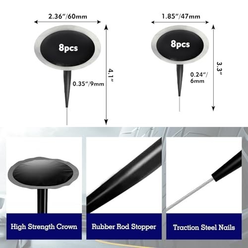 Upgraded Mushroom Tire Plug Kit for Effective Tire Repair Practical Patch Plug: Discover the enhanced design of our mushroom plug kit, featuring rubber rods that effectively fill tire punctures. This innovative solution prevents water and debris from entering, ensuring a complete seal with the round rubber patch. Restore your tire's airtight liner and prevent leaks, especially suitable for small punctures caused by single nails with a crown angle of less than 25°. Premium Material: Crafted from high-quality rubber with a grey vulcanized rubber backing, these tire patch plugs offer exceptional sealing performance and high strength. Experience long-lasting durability with high wear resistance. The round rubber patches partially seal the tire's inner wall, reinforcing it, while the plugs fill the crown wound for waterproof and corrosion resistance. Easy to Operate: Simply punch and polish the worn area of the tire, apply glue (not included), and insert the tire patch plug. Pull the mushroom tire plug outward, remove trapped air with a tire patch roller, and trim off any excess. Note: Rubber cement is not included. Widely Applicable: This versatile tire repair patch plug kit is perfect for repairing pneumatic tires on cars, trucks, bicycles, scooters, motorcycles, buses, electric vehicles, and more. It fits most tire repair work in daily life. Ideal for Tire Repair: Our reliable tire repair patches tools enable you to perform effective patchwork on various tires. Available in different sizes to meet your tire repairing needs, providing you with convenience and peace of mind.
