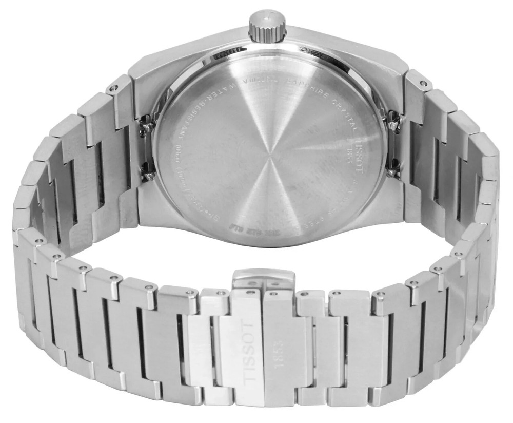 Tissot PRX Quartz Green Dial Ladies Watch T137.210.11.081.00 Complete Set Serial number verified Silver-tone stainless steel case and bracelet. Fixed silver-tone stainless steel bezel. Green dial with luminous silver-tone hands and index hour markers. Minute markers around the outer rim. Dial Type: Analog. Quartz movement. Date display at the 3 o'clock position. Scratch resistant sapphire crystal. Pull / push crown. Solid case back. Round case shape, case size: 35 mm, Butterfly with push button release clasp. Water resistant at 100 meters / 330 feet. Functions: date, hour, minute, second. Watch label: Swiss Made.