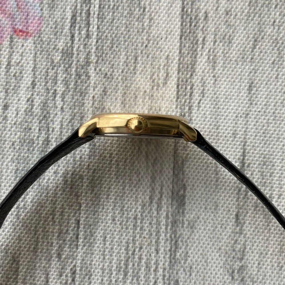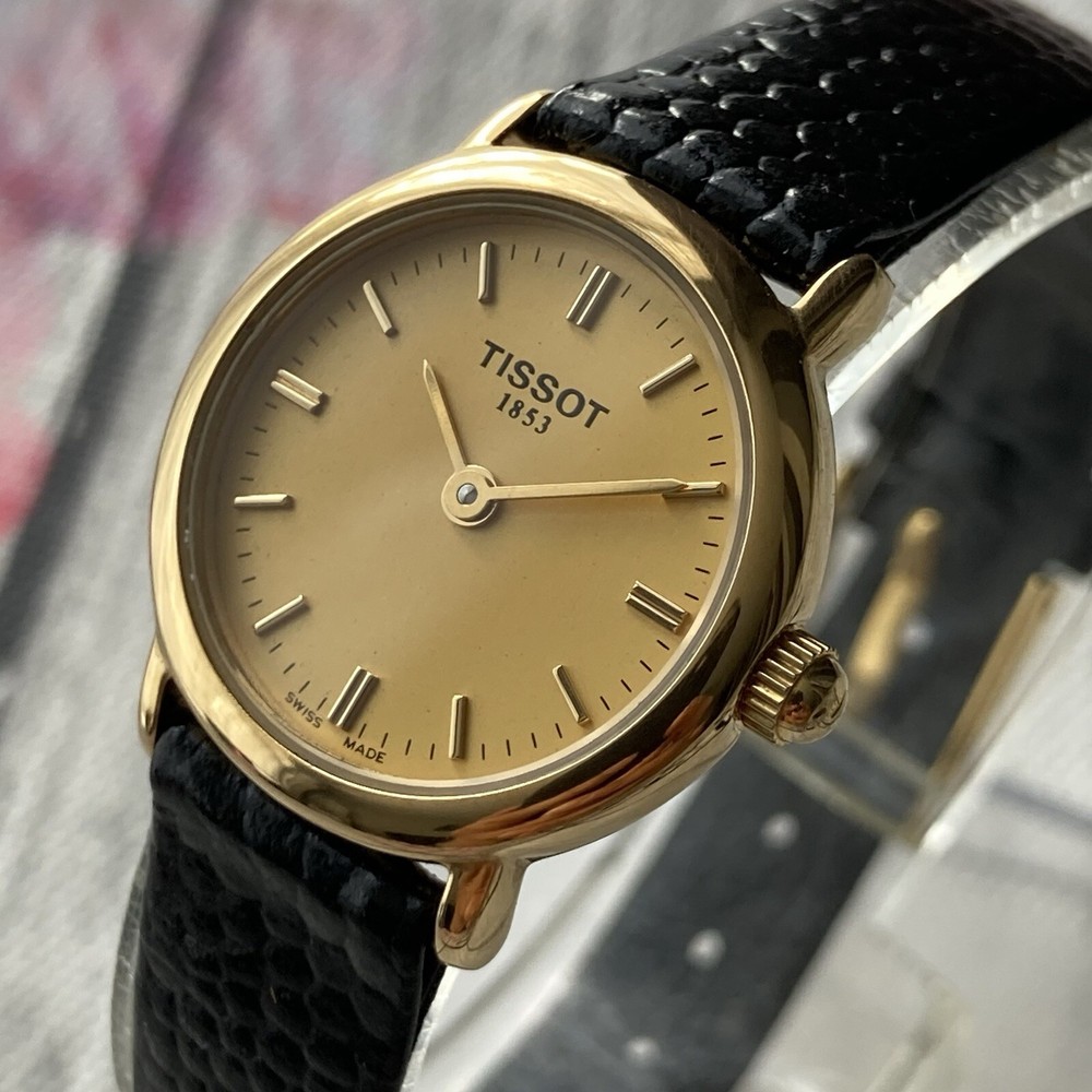 Tissot Watch Swiss Made Ladies Vintage Gold Plated 23mm Case. A gorgeous vintage Swiss made timepiece crafted from 18k gold plated stainless steel. The watch features a gold tone dial detailed with gold petite hour markers and slim hands. The item is in excellent condition for pre-owned negligible blemish under scrutiny. The glass is in perfect condition. Aftermarket replaced black leather strap. A fresh battery has been installed and is in perfect working order. The case measures approximately 23mm excluding the crown. No original box or papers PLEASE NOTE DUE TO CONTINUED DELAYS, LOST POST AND CUSTOMS ISSUES I DO NOT POST TO AFRICA, SOUTH AFRICA, ITALY, ISRAEL, GERMANY, PHILIPPINES AND SOME OTHER DESTINATIONS SO PLEASE CONFIRM YOUR DESTINATION BEFORE BIDDING. PLEASE NOTE WE DO NOT GUARANTEE WATERPROOF ON ANY WATCH UNLESS STATED IN THE DESCRIPTION.