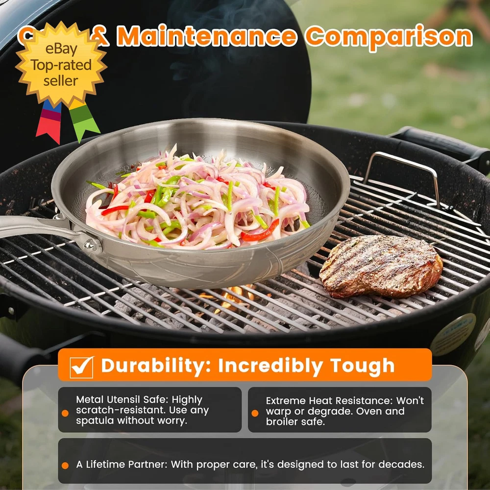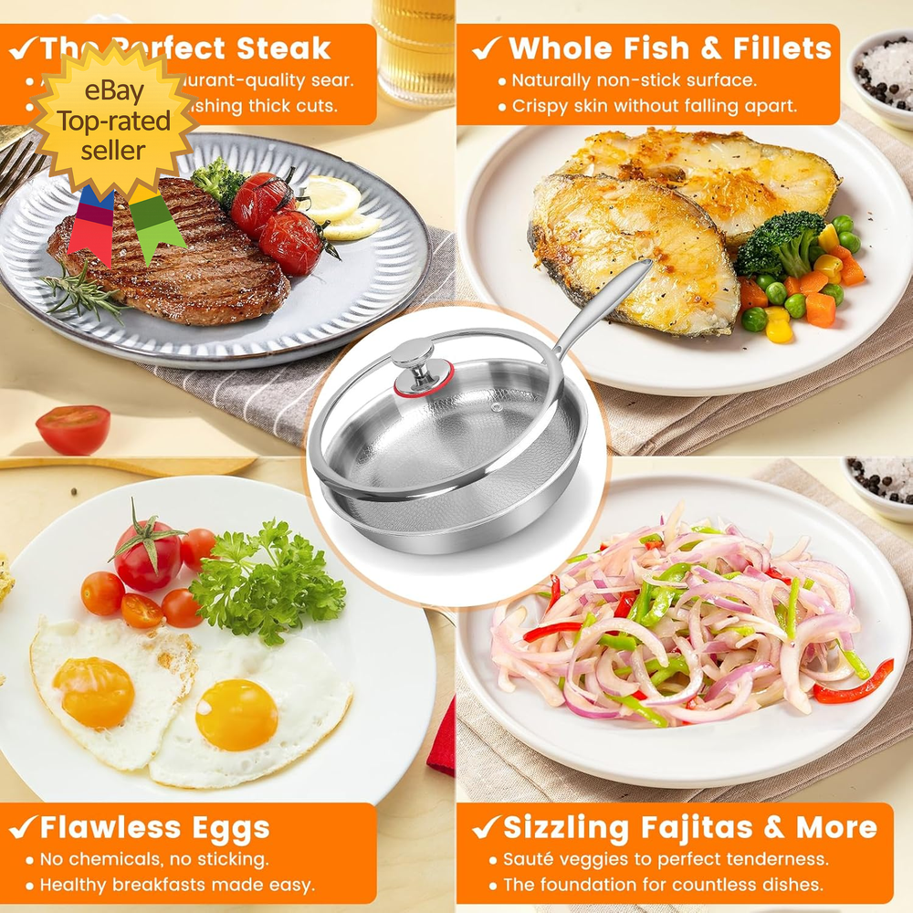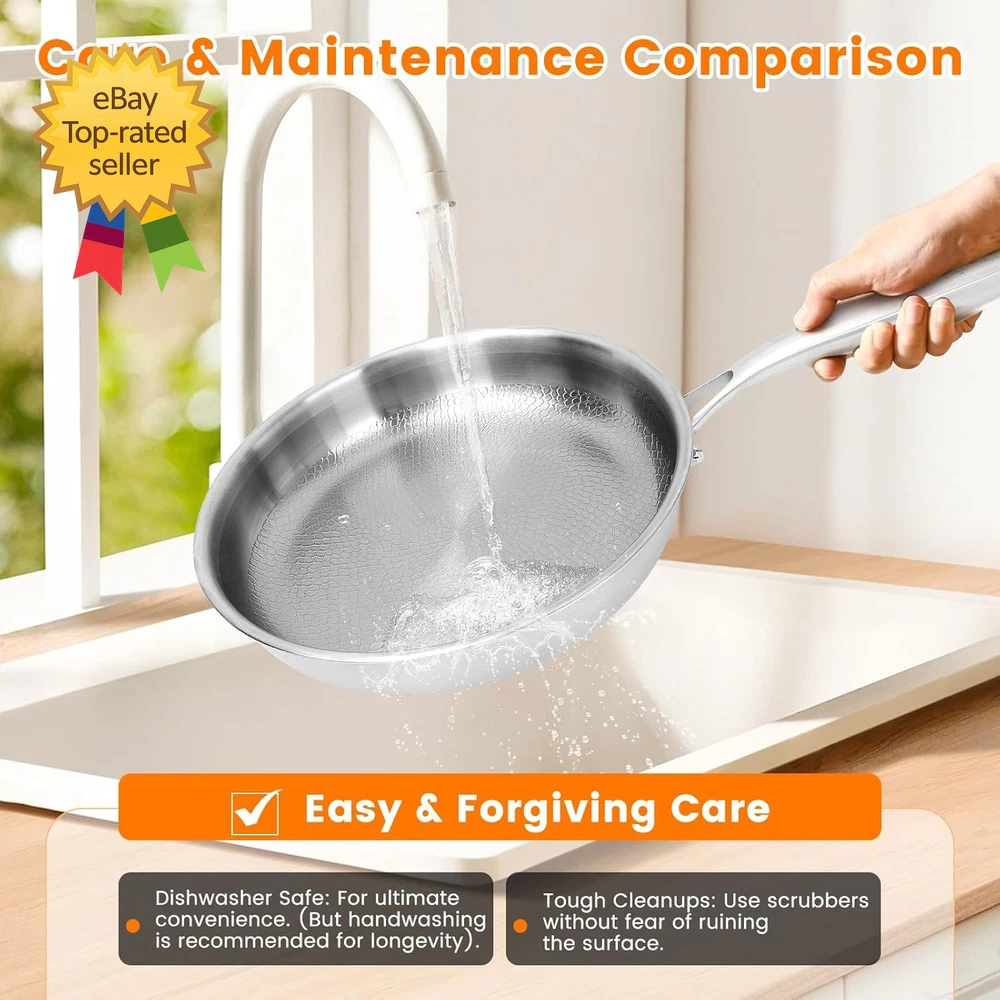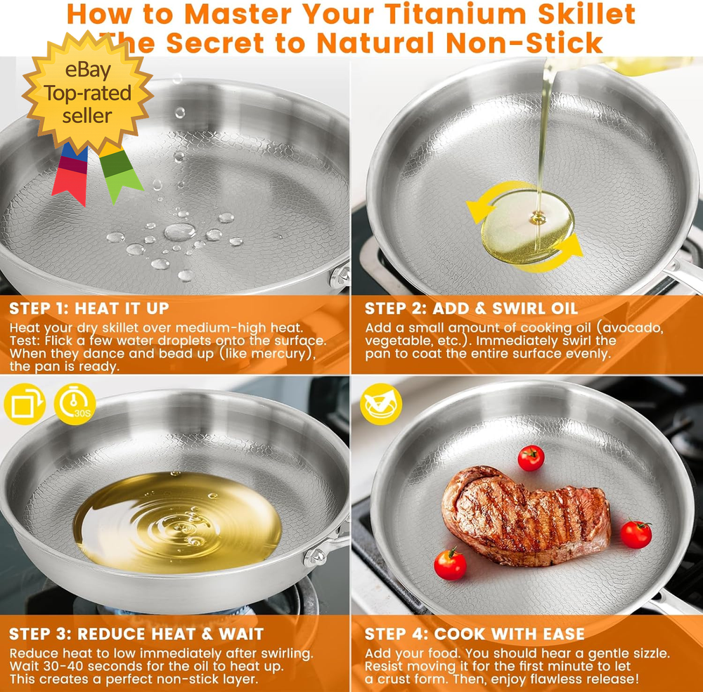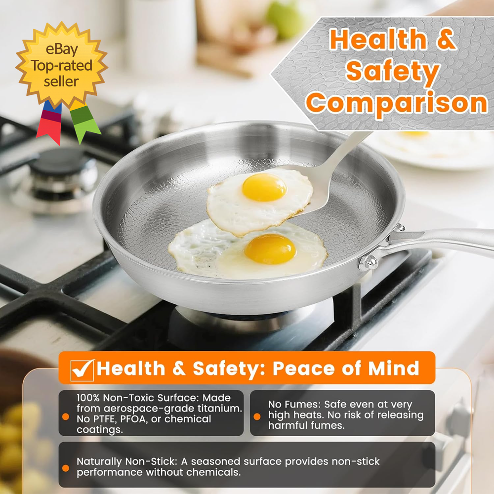 Store New Arrivals Add to Favorite View Feedback Contact Titanium Hammered Pan Pro with Lid 11.02 Inch Titanium Non Stick Frying Pan Description Is Dishwasher Safe Yes Item Weight 4.09 pounds Handle Material Stainless Steel Recommended Uses For Product Stir Frying Product Care Instructions Dishwasher Safe, Oven Safe Size 11 inches Lighter, Tougher, Smarter Construction: Why choose? Get the best of all worlds: the healthy, rust-resistant surface of titanium, the fast heating of aluminum, and the strength of stainless steel. 30% lighter and far more scratch-resistant than full stainless steel pans. Natural Non-Stick Hammered Surface:No harmful coatings needed! The unique hammered titanium surface naturally releases food while creating a stunning visual effect. Enjoy effortless cleanup and healthier cooking with this innovative design. 50% Faster & Even Heating:3-layer titanium construction heats 50% faster than traditional pans with perfect heat distribution. The hammered pattern eliminates hot spots - whether searing or simmering, enjoy energy-efficient perfection every time. Lightweight Professional Performance:Experience the perfect balance of strength and convenience - lighter than conventional pans yet ultra-stable. The ergonomic design provides professional cooking control with everyday comfort. ABOUT US We offer the best prices around on high quality products. Our E-store includes media such as books, movies, music and games while offering electronics, toys, sporting apparel, clothing, tools, general home, garden items and more. SHIPPING We are always working hard to ensure your package arrives as soon as possible. Please understand that some factors like weather, high postal traffic, and the performance of shipping companies are outside of our control. We offer free shipping to the lower 48 states and ship within 2 business days of payment, usually sooner. We do not accept P.O. Boxes. Please provide a physical address. For shipping outside of the continental USA, we only use eBay's Global Shipping Program.The item is shipped to KY and then sent to the rest of the world. International customers are responsible for all duties and taxes. Continue to check out in order to calculate costs for shipping the item to your country. Messages regarding eBay's Global Shipping Program MUST be directed at eBay EXCLUSIVELY. RETURNS We offer a 30-Day Return Policy on items which you are not completely satisfied with. You have the option for a full-refund or an exchange of the item. No returns are available on items shipped outside of the USA. PAYMENT We accept PayPal. CONTACT US This page content is yet to come Please ad us to your favorite seller and visit again later Thank You CUSTOMER SATISFACTION We try our very best to make sure every customer is completely satisfied. If there's a problem, message us! We're happy to help.
