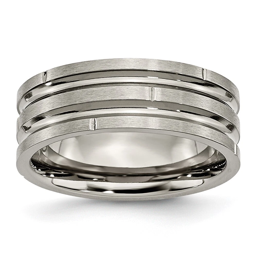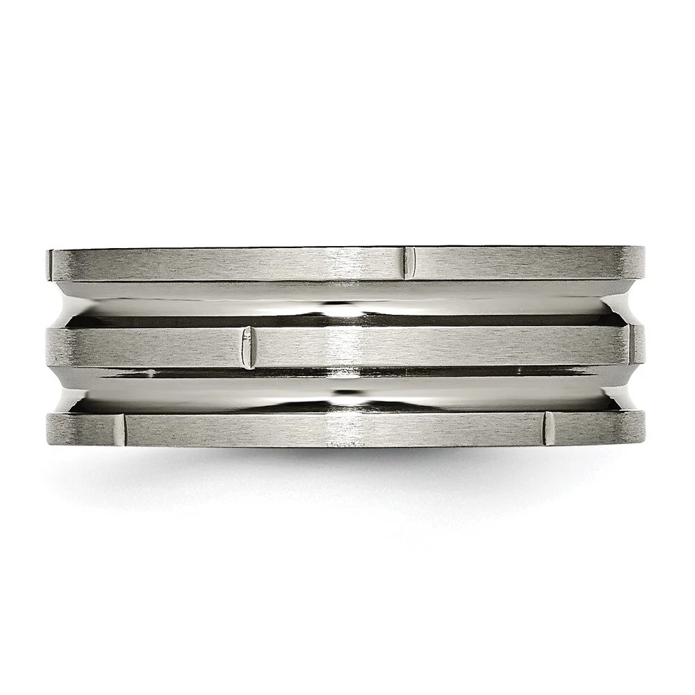 Finish:Polished & Brushed|Band Width:8 mm|Material: Primary:Titanium|Ring Fit:Standard|Sizeable:No|Thickness:< 2 mm|Item Weight U/M:gm|Width of Item:8 mm|Engravable:Yes|Packaging:Gift Pouch|Product Type:Jewelry|Jewelry Type:Rings|Sold By Unit:Each|Gender:Unisex|Texture:Grooved|Material: Primary - Color:Grey|Ring Type:Wedding Bands|Edge Type:Flat|Ring Shape:Flat All weights and measurements are approximate and may vary slightly from the listed information. Welcome to diamond_6720 Payments We accept all Ebay approved payment. Please sent the payment to us within 8 days after the auction has ended, or you will have unpaid case auto open by eBay. Shipping Policy We will ship all items within 1 business days of purchase during the work week (M-F) excluding holidays. If you order on Friday, your order will be shipped the following business day. Tracking will be provided when it becomes available. We will only ship to a PayPal Verified Address. Please make sure your address is current and correct. If the information does not match, your order may be canceled. Buyers are responsible for all customs, duties and taxes for your respective countries. Delivery times for International Shipping will vary. California Buyers Pay 9.0% Tax on all orders. case auto open by eBay. Return Policy & Exchange Returns or Exchange are accepted. Buyer must contact us within 30 days after the item is received. Item must be returned in unworn and resalable condition. We will only issue a refund for the purchase price, excluding any shipping fees. If we are at fault, we will provide a full refund. Buyer is responsible for all return shipping costs. BUYERS FEEDBACK If you have any concerns regarding your purchase, please contact us via eBay Message, we assure you that a satisfactory resolution will be reached. Your feedback is very important to us Do remember to give us 5 star rating(*****) if you are satisfied with our product & service .