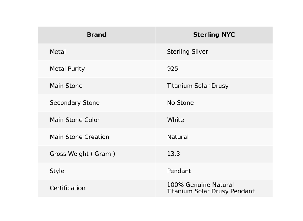 Welcome to Sterling NYC Gift For Her 925 Sterling Silver Natural Titanium Solar Drusy Gemstone Pendant Handmade Pendant, Sterling Silver Pendant, Titanium Solar Drusy Pendant, Handcrafted Pendant Specifications:- SKU : JS-48914 Gemstone : Titanium Solar Drusy Stone Shape : As Seen In Picture Metal Purity : 925 Sterling Silver Length : Inches Width : Inches ----------------------------------------------------------------------------------------------------- Experience the timeless allure of silver jewelry, a cherished choice known for its exceptional properties and countless rewards. Explore the captivating charm of its unique attributes, enveloping you with elegance and remarkable healing qualities. Immerse yourself in the enigmatic world of silver, where beauty and benefits harmoniously intertwine. Benefits: Embrace the Elegance : Silver jewelry seamlessly blends accessible luxury with timeless beauty, elevating any jewelry collection without the need for extravagant spending. A Mindful Companion : Adorn yourself with silver jewelry as a gentle nudge towards mindfulness, a tangible reminder to cherish the beauty of every moment. Amplify Positivity : Silver, known for its energy-conducting qualities, is thought to enhance the power of positive intentions and affirmations, aiding in the clear manifestation of your desires. Unleash Self-Expression : Silver jewelry, with its versatile designs, empowers individuals to express their unique style, allowing their personality to shine through every piece. Soothing Serenity : Silver's cooling properties are believed to have a therapeutic effect, bestowing a sense of relief and tranquility upon both body and mind. ----------------------------------------------------------------------------------------------------- For Mother's Day Gift For Father's Day Gift For Promise For Valentine' Day For Halloween Party For Christmas Day Gift For New Year Party For Mom For Her ----------------------------------------------------------------------------------------------------- Discover the impeccable designs tailored just for you, and receive personalized guidance by reaching out to us. Our skilled artisans meticulously handcraft each piece in our workshop, infusing them with love and unwavering attention to detail. Your visit holds immense significance to us, and we are committed to ensuring that your shopping experience is nothing short of exceptional. Thank you for choosing us; we sincerely hope you thoroughly enjoy your shopping journey. Happy shopping! ----------------------------------------------------------------------------------------------------- At SterlingNYC, exquisite craftsmanship meets premium sterling silver gemstone jewelry. Our handcrafted pieces reflect authenticity and uniqueness, a testament to our commitment to excellence. Explore our collection and create your own dazzling jewelry ensemble.