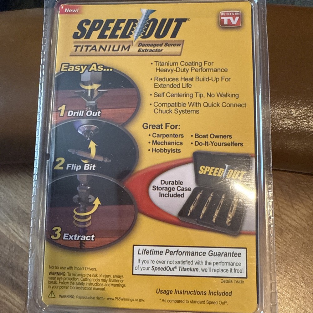 The Ontel SpeedOut Titanium Damaged Screw Extractor 4pc Set is a set of drill bits specifically designed to work with any drill. This set, featuring four different sizes, is perfect for removing damaged screws with ease. The Ontel brand is known for its quality and reliability, making this set a must-have for any DIY enthusiast or professional contractor. Upgrade your toolbox with this handy and efficient screw extractor set.